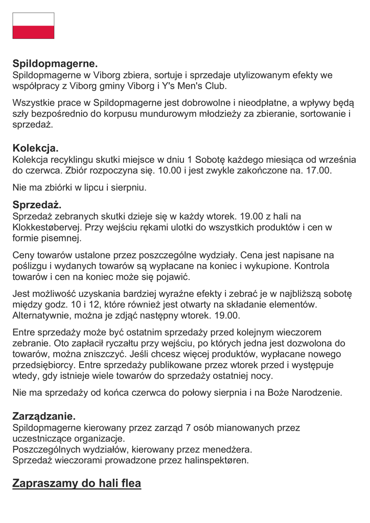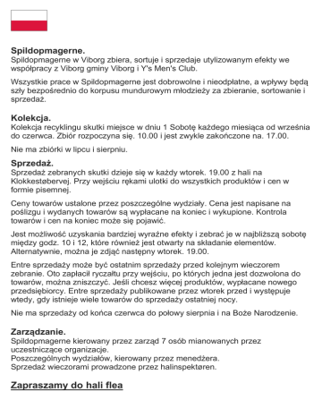 Spildopmagerne. Spildopmagerne w Viborg zbiera, sortuje i sprzedaje utylizowanym efekty we współpracy z Viborg gminy Viborg i Y's Men's Club. Wszystkie prace w Spildopmagerne jest dobrowolne i nieodpłatne, a wpływy będą szły bezpośrednio do korpusu mundurowym młodzieży za zbieranie, sortowanie i sprzedaż. Kolekcja. Kolekcja recyklingu skutki miejsce w dniu 1 Sobotę każdego miesiąca od września do czerwca. Zbiór rozpoczyna się. 10.00 i jest zwykle zakończone na. 17.00. Nie ma zbiórki w lipcu i sierpniu. Sprzedaż. Sprzedaż zebranych skutki dzieje się w każdy wtorek. 19.00 z hali na Klokkestøbervej. Przy wejściu rękami ulotki do wszystkich produktów i cen w formie pisemnej. Ceny towarów ustalone przez poszczególne wydziały. Cena jest napisane na poślizgu i wydanych towarów są wypłacane na koniec i wykupione. Kontrola towarów i cen na koniec może się pojawić. Jest możliwość uzyskania bardziej wyraźne efekty i zebrać je w najbliższą sobotę między godz. 10 i 12, które również jest otwarty na składanie elementów. Alternatywnie, można je zdjąć następny wtorek. 19.00. Entre sprzedaży może być ostatnim sprzedaży przed kolejnym wieczorem zebranie. Oto zapłacił ryczałtu przy wejściu, po których jedna jest dozwolona do towarów, można zniszczyć. Jeśli chcesz więcej produktów, wypłacane nowego przedsiębiorcy. Entre sprzedaży publikowane przez wtorek przed i występuje wtedy, gdy istnieje wiele towarów do sprzedaży ostatniej nocy. Nie ma sprzedaży od końca czerwca do połowy sierpnia i na Boże Narodzenie. Zarządzanie. Spildopmagerne kierowany przez zarząd 7 osób mianowanych przez uczestniczące organizacje. Poszczególnych wydziałów, kierowany przez menedżera. Sprzedaż wieczorami prowadzone przez halinspektøren. Zapraszamy do hali flea