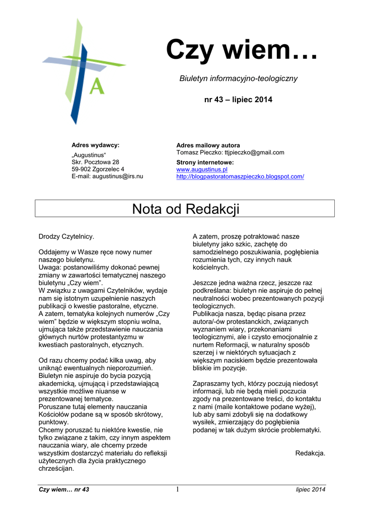Czy wiem… Biuletyn informacyjno-teologiczny nr 43 – lipiec 2014 Adres wydawcy: „Augustinus“ Skr. Pocztowa 28 59-902 Zgorzelec 4 E-mail: [email protected] Adres mailowy autora Tomasz Pieczko: [email protected] Strony internetowe: www.augustinus.pl http://blogpastoratomaszpieczko.blogspot.com/ Nota od Redakcji A zatem, proszę potraktować nasze biuletyny jako szkic, zachętę do samodzielnego poszukiwania, pogłębienia rozumienia tych, czy innych nauk kościelnych. Drodzy Czytelnicy. Oddajemy w Wasze ręce nowy numer naszego biuletynu. Uwaga: postanowiliśmy dokonać pewnej zmiany w zawartości tematycznej naszego biuletynu „Czy wiem”. W związku z uwagami Czytelników, wydaje nam się istotnym uzupełnienie naszych publikacji o kwestie pastoralne, etyczne. A zatem, tematyka kolejnych numerów „Czy wiem” będzie w większym stopniu wolna, ujmująca także przedstawienie nauczania głównych nurtów protestantyzmu w kwestiach pastoralnych, etycznych. Jeszcze jedna ważna rzecz, jeszcze raz podkreślana: biuletyn nie aspiruje do pełnej neutralności wobec prezentowanych pozycji teologicznych. Publikacja nasza, będąc pisana przez autora/-ów protestanckich, związanych wyznaniem wiary, przekonaniami teologicznymi, ale i czysto emocjonalnie z nurtem Reformacji, w naturalny sposób szerzej i w niektórych sytuacjach z większym naciskiem będzie prezentowała bliskie im pozycje. Od razu chcemy podać kilka uwag, aby uniknąć ewentualnych nieporozumień. Biuletyn nie aspiruje do bycia pozycją akademicką, ujmującą i przedstawiającą wszystkie możliwe niuanse w prezentowanej tematyce. Poruszane tutaj elementy nauczania Kościołów podane są w sposób skrótowy, punktowy. Chcemy poruszać tu niektóre kwestie, nie tylko związane z takim, czy innym aspektem nauczania wiary, ale chcemy przede wszystkim dostarczyć materiału do refleksji użytecznych dla życia praktycznego chrześcijan. Czy wiem… nr 43 Zapraszamy tych, którzy poczują niedosyt informacji, lub nie będą mieli poczucia zgody na prezentowane treści, do kontaktu z nami (maile kontaktowe podane wyżej), lub aby sami zdobyli się na dodatkowy wysiłek, zmierzający do pogłębienia podanej w tak dużym skrócie problematyki. Redakcja. 1 lipiec 2014 Autorytet… a dyscyplina w Kościele? W zdecydowanej większości przypadków, dla zdecydowanej większości ludzi i niezależnie od tego kim oni byliby, czy ich kultura pochodzenia, ich pozycja społeczna, istnieje szczególnie ważny punkt odniesienia w ich życiu - autorytet. Natomiast pod określeniem dyscyplina grupuje się – przede wszystkim w tradycji reformowanej – całość reguł natury jurydycznej, które wyrażają sposób, w jaki wiara Kościoła jest przeżywana konkretnie. Teksty, reguły takie zawierające, są poddawane głosowaniu przez synody i stanowią część obrazu Kościoła, który on Słownik języka polskiego, kiedy wyjaśnia znaczenie słowa autorytet, podaje, że jest to: 1. powszechnie uznana czyjaś powaga, wpływ, znaczenie; posłuch, poważanie, szacunek, respekt; 2. człowiek mający duże poważanie ze względu na swą wiedzę lub postawę moralną, stawiany za wzór do naśladowania, mający wpływ na postawy i myślenie innych ludzi; chodząca encyklopedia, augur; 3. ciesząca się dużym szacunkiem instytucja, doktryna, pismo itp. daje sobie samemu, w odniesieniu do autorytetu Słowa Bożego. W krajach, w których istnieje związek między Kościołem i Państwem, może być wymagana także ratyfikacja tych tekstów przez stosowną władzę państwową. Rola dyscypliny kościelnej bardzo ewoluowała od XVI wieku. Będąc stworzon ku dokładnej regulacji regulacji życia kościelnego, ze skłonności chwilami idącymi w kierunku jurydycznym, jej celem pierwotnym było podkreślenie wagi i powagi życia kościelnego, w odniesieniu do laksyzmu społeczeństwa świeckiego. Dzisiaj, zatraciła ona swój pierwotny charakter, zawierający w szeregu przypadków elementy represywne. Współczesna dyscyplina kościelna (w rozumieniu tekstów ją określających) funkcjonuje w większości przypadków w formie regulaminów organizacyjnych. Nie można przy tym nie zauważyć, że niektórzy żałują tych zmian, przypisując takiemu procesowi zatracanie pojmowania autorytetu Słowa Bożego i generalizację zasad, która niweluje granice między Kościołem i światem (rozumianym w znaczeniu biblijnym, jako rzeczywistość nie poddana Słowu Bożemu). Dla chrześcijanina kwestia autorytetu nie jest banalna. Więcej nawet - kwestia autorytetu jest fundamentalną dla życia chrześcijańskiego, dla życia, które możemy nazwać religijnym, we wszystkich jego przejawach. A zatem także chrześcijanin może i powinien zadać sobie pytanie: kto lub co jest dla mnie autorytetem. Mając jednak na uwadze bieżący stan dyscypliny, podkreślmy najpierw jej aspekt organizacyjny. Zawiera on dyspozycje zarówno takie, które mają charakter stały (czyli odnoszące się do elementów dogmatycznych), jak i te, które są rozwiązaniami „technicznymi”, gwarantującymi właściwe i prawidłowe funkcjonowanie Kościoła. Najczęstszą odpowiedzią, jaka pada wtedy z ust wszystkich tych, którzy sytuują się wewnątrz szerokiego pojęcia myśli chrześcijańskiej, jest ta oto, że przyjmują oni autorytet Boga jako naczelną normę prawdy. Ale już sposób w jaki ten autorytet bywa wyrażany i realizowany zmienia się, w zależności od określonego nurtu chrześcijaństwa… Czy wiem… nr 43 2 lipiec 2014 Poniżej, kilka przykładów takiego ujęcia dyscypliny, związanej z tradycją nurtu reformowanego. będąc dokonywaną przez tzw. kontrolę wiary i obyczajów wiernych. Historycznie, sankcje mogły dojść aż do ekskomuniki… (por. reformowana Dyscyplina kościelna 1559 r.). Trzeba tu także uczciwie przyznać, że charakter duszpasterski reprymendy dość szybko dawał miejsce – i to w wielu miejscach – duchowi osądu… Wiek X