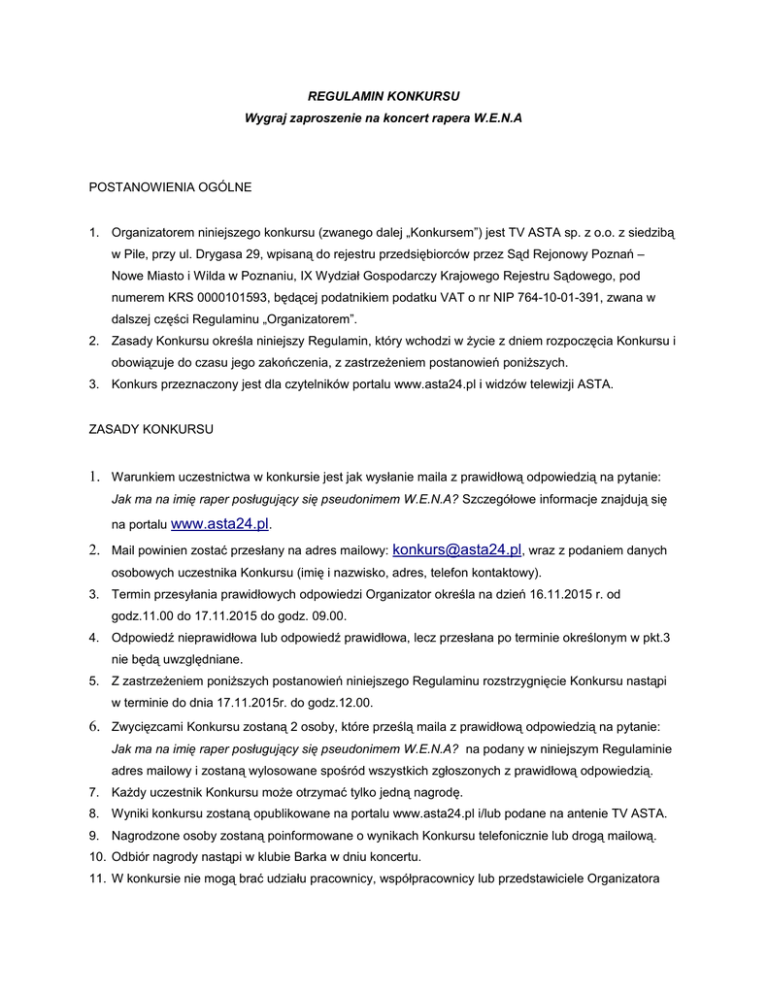 REGULAMIN KONKURSU Wygraj zaproszenie na koncert rapera W.E.N.A POSTANOWIENIA OGÓLNE 1. Organizatorem niniejszego konkursu (zwanego dalej „Konkursem”) jest TV ASTA sp. z o.o. z siedzibą w Pile, przy ul. Drygasa 29, wpisaną do rejestru przedsiębiorców przez Sąd Rejonowy Poznań – Nowe Miasto i Wilda w Poznaniu, IX Wydział Gospodarczy Krajowego Rejestru Sądowego, pod numerem KRS 0000101593, będącej podatnikiem podatku VAT o nr NIP 764-10-01-391, zwana w dalszej części Regulaminu „Organizatorem”. 2. Zasady Konkursu określa niniejszy Regulamin, który wchodzi w życie z dniem rozpoczęcia Konkursu i obowiązuje do czasu jego zakończenia, z zastrzeżeniem postanowień poniższych. 3. Konkurs przeznaczony jest dla czytelników portalu www.asta24.pl i widzów telewizji ASTA. ZASADY KONKURSU 1. Warunkiem uczestnictwa w konkursie jest jak wysłanie maila z prawidłową odpowiedzią na pytanie: Jak ma na imię raper posługujący się pseudonimem W.E.N.A? Szczegółowe informacje znajdują się na portalu www.asta24.pl. 2. Mail powinien zostać przesłany na adres mailowy: [email protected], wraz z podaniem danych osobowych uczestnika Konkursu (imię i nazwisko, adres, telefon kontaktowy). 3. Termin przesyłania prawidłowych odpowiedzi Organizator określa na dzień 16.11.2015 r. od godz.11.00 do 17.11.2015 do godz. 09.00. 4. Odpowiedź nieprawidłowa lub odpowiedź prawidłowa, lecz przesłana po terminie określonym w pkt.3 nie będą uwzględniane. 5. Z zastrzeżeniem poniższych postanowień niniejszego Regulaminu rozstrzygnięcie Konkursu nastąpi w terminie do dnia 17.11.2015r. do godz.12.00. 6. Zwycięzcami Konkursu zostaną 2 osoby, które prześlą maila z prawidłową odpowiedzią na pytanie: Jak ma na imię raper posługujący się pseudonimem W.E.N.A? na podany w niniejszym Regulaminie adres mailowy i zostaną wylosowane spośród wszystkich zgłoszonych z prawidłową odpowiedzią. 7. Każdy uczestnik Konkursu może otrzymać tylko jedną nagrodę. 8. Wyniki konkursu zostaną opublikowane na portalu www.asta24.pl i/lub podane na antenie TV ASTA. 9. Nagrodzone osoby zostaną poinformowane o wynikach Konkursu telefonicznie lub drogą mailową. 10. Odbiór nagrody nastąpi w klubie Barka w dniu koncertu. 11. W konkursie nie mogą brać udziału pracownicy, współpracownicy lub przedstawiciele Organizatora Konkursu oraz innych podmiotów powiązanych organizacyjnie, kapitałowo lub osobowo z Organizatorem Konkursu. NAGRODY 1. Nagrodą główną w Konkursie są 2 podwójne zaproszenia na koncert rapera W.E.N.A, który odbędzie się w dniu 20.11.2015 o godzinie 20.00 w Klubie Barka w Pile. 2. Wartość nagrody wynosi 120 zł brutto. 3. Nagroda główna nie podlega wymianie na gotówkę. 4. W przypadku powstania obowiązku zapłaty podatku w związku z otrzymaniem nagrody, uczestnik zobowiązany jest do ich pokrycia we własnym zakresie, na co – przystępując do Konkursu – wyraża zgodę. 5. Organizator zastrzega sobie prawo do publikowania informacji o zwycięzcy oraz osobach wyróżnionych nagrodami na stronie internetowej www.asta24.pl i/lub na antenie telewizji TV ASTA, na co uczestnik – przystępując do udziału w Konkursie – wyraża zgodę. POSTANOWIENIA KOŃCOWE 1. Uczestnik przystępując do konkursu wyraża zgodę na przetwarzanie przez Organizatora Konkursu jego danych osobowych w celu przeprowadzenia konkursu w rozumieniu przepisów Ustawy z dnia 29 sierpnia 1997r. o ochronie danych osobowych (Dz. U. z 2002r., Nr 101, poz. 926 tekst jednolity ze zm.) Uczestnik Konkursu przekazujący Organizatorowi swoje dane osobowe ma prawo do ich wglądu i poprawiania. 2. Decyzje Organizatora Konkursu mają charakter ostateczny i nie przysługuje od nich odwołanie. 3. Przystąpienie do udziału w Konkursie jest jednoznaczne z przyjęciem warunków niniejszego Regulaminu. 4. W sprawach nieuregulowanych Regulaminem mają zastosowanie przepisy Kodeksu Cywilnego.