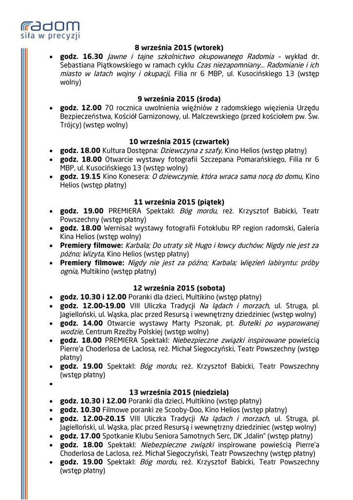 8 września 2015 (wtorek) godz. 16.30 Jawne i tajne szkolnictwo okupowanego Radomia – wykład dr. Sebastiana Piątkowskiego w ramach cyklu Czas niezapomniany… Radomianie i ich miasto w latach wojny i okupacji, Filia nr 6 MBP, ul. Kusocińskiego 13 (wstęp wolny) 9 września 2015 (środa) godz. 12.00 70 rocznica uwolnienia więźniów z radomskiego więzienia Urzędu Bezpieczeństwa, Kościół Garnizonowy, ul. Malczewskiego (przed kościołem pw. Św. Trójcy) (wstęp wolny) 10 września 2015 (czwartek) godz. 18.00 Kultura Dostępna: Dziewczyna z szafy, Kino Helios (wstęp płatny) godz. 18.00 Otwarcie wystawy fotografii Szczepana Pomarańskiego, Filia nr 6 MBP, ul. Kusocińskiego 13 (wstęp wolny) godz. 19.15 Kino Konesera: O dziewczynie, która wraca sama nocą do domu, Kino Helios (wstęp płatny) 11 września 2015 (piątek) godz. 19.00 PREMIERA Spektakl: Bóg mordu, reż. Krzysztof Babicki, Teatr Powszechny (wstęp płatny) godz. 18.00 Wernisaż wystawy fotografii Fotoklubu RP region radomski, Galeria Kina Helios (wstęp wolny) Premiery filmowe: Karbala; Do utraty sił; Hugo i łowcy duchów; Nigdy nie jest za późno; Wizyta, Kino Helios (wstęp płatny) Premiery filmowe: Nigdy nie jest za późno; Karbala; Więzień labiryntu: próby ognia, Multikino (wstęp płatny) 12 września 2015 (sobota) godz. 10.30 i 12.00 Poranki dla dzieci, Multikino (wstęp płatny) godz. 12.00–19.00 VIII Uliczka Tradycji Na lądach i morzach, ul. Struga, pl. Jagielloński, ul. Wąska, plac przed Resursą i wewnętrzny dziedziniec (wstęp wolny) godz. 14.00 Otwarcie wystawy Marty Pszonak, pt. Butelki po wyparowanej wodzie, Centrum Rzeźby Polskiej (wstęp wolny) godz. 18.00 PREMIERA Spektakl: Niebezpieczne związki inspirowane powieścią Pierre’a Choderlosa de Laclosa, reż. Michał Siegoczyński, Teatr Powszechny (wstęp płatny) godz. 19.00 Spektakl: Bóg mordu, reż. Krzysztof Babicki, Teatr Powszechny (wstęp płatny) 13 września 2015 (niedziela) godz. 10.30 i 12.00 Poranki dla dzieci, Multikino (wstęp płatny) godz. 10.30 Filmowe poranki ze Scooby-Doo, Kino Helios (wstęp płatny) godz. 12.00–20.15 VIII Uliczka Tradycji Na lądach i morzach, ul. Struga, pl. Jagielloński, ul. Wąska, plac przed Resursą i wewnętrzny dziedziniec (wstęp wolny) godz. 17.00 Spotkanie Klubu Seniora Samotnych Serc, DK „Idalin” (wstęp płatny) godz. 18.00 Spektakl: Niebezpieczne związki inspirowane powieścią Pierre’a Choderlosa de Laclosa, reż. Michał Siegoczyński, Teatr Powszechny (wstęp płatny) godz. 19.00 Spektakl: Bóg mordu, reż. Krzysztof Babicki, Teatr Powszechny (wstęp płatny)