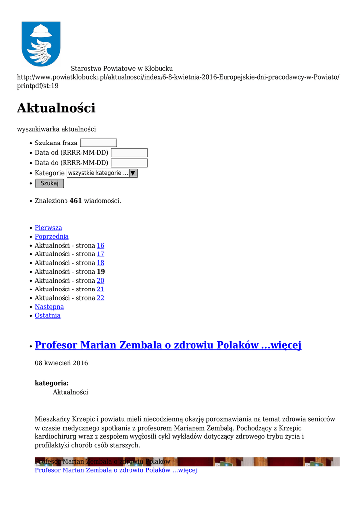 Starostwo Powiatowe w Kłobucku http://www.powiatklobucki.pl/aktualnosci/index/6-8-kwietnia-2016-Europejskie-dni-pracodawcy-w-Powiato/ printpdf/st:19 Aktualności wyszukiwarka aktualności Szukana fraza Data od (RRRR-MM-DD) Data do (RRRR-MM-DD) Kategorie wszystkie kategorie ... ▼ Szukaj Znaleziono 461 wiadomości. Pierwsza Poprzednia Aktualności - strona 16 Aktualności - strona 17 Aktualności - strona 18 Aktualności - strona 19 Aktualności - strona 20 Aktualności - strona 21 Aktualności - strona 22 Następna Ostatnia Profesor Marian Zembala o zdrowiu Polaków ...więcej 08 kwiecień 2016 kategoria: Aktualności Mieszkańcy Krzepic i powiatu mieli niecodzienną okazję porozmawiania na temat zdrowia seniorów w czasie medycznego spotkania z profesorem Marianem Zembalą. Pochodzący z Krzepic kardiochirurg wraz z zespołem wygłosili cykl wykładów dotyczący zdrowego trybu życia i profilaktyki chorób osób starszych. Profesor Marian Zembala o zdrowiu Polaków Profesor Marian Zembala o zdrowiu Polaków ...więcej XIV Sesja Rady Powiatu w Kłobucku - 15 kwietnia 2016 roku ...więcej 08 kwiecień 2016 kategoria: Aktualności W dniu 15 kwietnia 2016 roku o godz. 9.00 w Sali Konferencyjnej Urzędu Miejskiego w Kłobucku przy ul. 11-go Listopada 6 odbędzie się XIV Sesja Rady Powiatu w Kłobucku. XIV Sesja Rady Powiatu w Kłobucku - 15 kwietnia 2 XIV Sesja Rady Powiatu w Kłobucku - 15 kwietnia 2016 roku ...więcej Mistrzowie i amatorzy rywalizowali na parkiecie w Węglowicach ...więcej 07 kwiecień 2016 kategoria: Aktualności Już po raz 26 w Węglowicach, gm. Wręczyca Wielka spotkali się miłośnicy tańca z całego kraju. Na odbywającym się w dniach 2 i 3 kwietnia b.r. Ogólnopolskim Turnieju Tańca Towarzyskiego zaprezentowało się 48 klubów tanecznych z całej Polski. Mistrzowie i amatorzy rywalizowali na parkiecie w Mistrzowie i amatorzy rywalizowali na parkiecie w Węglowicach ...więcej Zapraszamy na spotkanie z profesorem Marianem Zembalą ...więcej 05 kwiecień 2016 kategoria: Aktualności W najbliższą środę, 6 kwietnia, w ramach Akademii Aktywnego Seniora w Krzepicach odbędzie się spotkanie pod nazwą „Zdrowie Polaków”. Tematem cyklu wykładów jest zdrowie i profilaktyka chorób osób starszych. Zapraszamy na spotkanie z profesorem Marianem Zemb Zapraszamy na spotkanie z profesorem Marianem Zembalą ...więcej Nowe wozy bojowe dla OSP poprawią bezpieczeństwo w powiecie ...więcej 05 kwiecień 2016 kategoria: Aktualności 1 kwietnia 2016 roku w strażnicy OSP w Krzepicach odbyło się posiedzenie zarządu Oddziału Powiatowego Związku OSP. Nowe wozy bojowe dla OSP poprawią bezpieczeństwo Nowe wozy bojowe dla OSP poprawią bezpieczeństwo w powiecie ...więcej Stypendia artystyczne 2016 ...więcej 01 kwiecień 2016 kategoria: Aktualności Zarząd Powiatu w Kłobucku przyznał stypendia za osiagnięcia artystyczne w 2015 roku. Stypendia przyznane zostały osobom, które stosownie do swego poziomu edukacji i możliwości uczestniczyły w konkursach, olimpiadach, warsztatach, wystawach, festiwalach, przeglądach, uzyskując w nich znaczące wyniki [...] Stypendia artystyczne 2016 Stypendia artystyczne 2016 ...więcej Szkolenie na temat zmian w prawie budowlanym w Starostwie Powiatowym ...więcej 29 marzec 2016 kategoria: Aktualności 22 marca 2016 roku Starostwo Powiatowe wspólnie ze Śląską Okręgową Izbą Inżynierów Budownictwa, Placówka Terenowa w Częstochowie zorganizowali szkolenie dla pracowników wydziałów architektury, budownictwa, urbanistyki oraz inwestycji. Szkolenie na temat zmian w prawie budowlanym w Sta Szkolenie na temat zmian w prawie budowlanym w Starostwie Powiatowym ...więcej 6-8 kwietnia 2016 Europejskie dni pracodawcy w Powiatowym Urzędzie Pracy w Kłobucku ...więcej 25 marzec 2016 kategoria: Aktualności W dniach od 6 do 8 kwietnia 2016 r., w Powiatowym Urzędzie Pracy w Kłobucku - wszystko dla pracodawcy. Specjaliści z PUP przeprowadzą szkolenia i prelekcje, wyjaśnią i pomogą rozwiązać problemy z zakresu polskiego i europejskiego rynku pracy, wszystkim zainteresowanym pracodawcom z naszego powiatu. 6-8 kwietnia 2016 Europejskie dni pracodawcy w Pow 6-8 kwietnia 2016 Europejskie dni pracodawcy w Powiatowym Urzędzie Pracy w Kłobucku ...więcej Dni Otwarte w Zespole Szkół nr 2 w Kłobucku ...więcej 21 marzec 2016 kategoria: Aktualności Jeśli myślicie, że w ciągu kilku godzin trudno zażyć w naszym powiecie wielu wrażeń jednocześnie, to jesteście w głębokim błędzie. To, że się da, udowodnił ostatnio Zespół Szkół nr 2, zapraszając gimnazjalistów na Dni Otwarte i serwując im cały wachlarz atrakcji [...] Dni Otwarte w Zespole Szkół nr 2 w Kłobucku Dni Otwarte w Zespole Szkół nr 2 w Kłobucku ...więcej Spotkania w szkołach powiatu z przedstawicielami Lokalnej Grupy Działania „Zielony Wierzchołek Śląska” ...więcej 21 marzec 2016 kategoria: Aktualności We wszystkich zespołach szkół ponadgimnazjalnych, prowadzonych przez Powiat Kłobucki, w ciągu ostatniego miesiąca, miały miejsca spotkania z młodzieżą połączone z wykładem i prezentacją multimedialną, organizowane przez stowarzyszenie Lokalna Grupa Działania „Zielony Wierzchołek Śląska” z siedzibą w Kłobucku. Spotkania w szkołach powiatu z przedstawicielami Spotkania w szkołach powiatu z przedstawicielami Lokalnej Grupy Działania „Zielony Wierzchołek Śląska” ...więcej Pierwsza Poprzednia Aktualności - strona 16 Aktualności - strona 17 Aktualności - strona 18 Aktualności - strona 19 Aktualności - strona 20 Aktualności - strona 21 Aktualności - strona 22 Następna Ostatnia