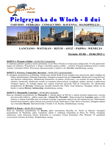 I TARVISIO - FERRARA - COMACCHIO - RAVENNA - MANOPPELLO - LANCIANO - WATYKAN – RZYM – ASYŻ – PADWA - WENECJA Termin: 03.06 – 10.06.2012 r. DZIEŃ 1: Wyjazd z Polski – 03.06.2012 (niedziela) O ustalonej godzinie (godziny ranne) spotykamy się na Mszy Świętej na rozpoczęcie pielgrzymki. Po niej pakowanie bagaży do autokaru. Wyjedziemy w drogę w kierunku granicy polsko – czeskiej. Przejazd autokarem przez Czechy, Austrię w kierunku Włoch. Wieczorem zakwaterowanie w hotelu w ok. Tarvisio, obiadokolacja, nocleg. DZIEŃ 2: Ferrara, Comacchio, Ravenna – 04.06.2012 (poniedziałek) Po śniadaniu przejedziemy do Ferrary. Zobaczymy Zamek Rodu D’este, katedrę oraz uniwersytet, gdzie znajduje się tablica upamietniajaca Mikołaja Kopernika. Następnie przejedziemy do Comacchio. Miasteczko Comacchio leży nad Morzem Adriatyckim, kilkadziesiąt kilometrów na północ od Ravenny i na wschód od miasta Farrara. To rybackie miasteczko zbudowane zostało na trzynastu piaszczystych wysepkach, między morzem a północnym brzegiem laguny. Ta rozległa laguna jest częścią rezerwatu przyrody Valli di Comacchio. Na zakończenie przejedziemy do Ravenny. Zobaczymy mozaiki kościoła San Vitale, Zona Dantesca. Następnie udamy sie do hotelu w rejonie Riwiery Adriatyckiej, obiadokolacja, nocleg. DZIEŃ 3: Manopello, Lanciano – 05.06.2012 (wtorek) Rano po śniadaniu przejedziemy do Manopello w Abruzji gdzie od 500 lat w małym kościele Kapucynów czczona jest niezwykła relikwia – płótno znane jako „Chusta Św. Weroniki”. Dalej przejazd do Lanciano, gdzie w VIII stuleciu w małym kościółku pod wezwaniem świętego Legoncjana zdarzył się cud eucharystyczny. Odwiedzimy kościół franciszkanów, gdzie obecnie jest przechowywane Najświętsze Ciało i Krew Chrystusa. Następnie udamy się w kierunku Rzymu. Zakwaterowanie w hotelu w ok. Rzymu, obiadokolacja i nocleg. DZIEŃ 4: Rzym – 06.06.2012 (środa) Rano po śniadaniu przejedziemy do Rzymu, gdzie nawiedzimy Bazylikę św. Pawła za Murami. Następnie przejedziemy do Watykanu, gdzie weźmiemy udział w Audiencji Generalnej na Placu Św. Piotra. Następnie zobaczymy część klasyczną miasta: Koloseum (z zewnątrz), Forum Romanum, Plac Wenecki. W godzinach wieczornych wrócimy do hotelu, obiadokolacja, nocleg. 1 I DZIEŃ 5: Watykan, Rzym – 07.06.2012 (czwartek) Po śniadaniu przejedziemy do Watykanu, nawiedzimy Bazylikę św. Piotra wraz z grobem Bł. Ojca Świętego Jana Pawła II. Następnie zobaczymy część barokową miasta, czyli słynne place i fontanny Rzymu: Piazza Navona, Fontanna 4 Rzek, Schody Hiszpańskie, Plac Hiszpański, Fontannę di Trevi. Po południu nawiedzimy Bazylikę św. Jana na Lateranie oraz Schody Święte. Stąd przejdziemy wraz z uroczysta procesją z okazji Bożego Ciała do Bazyliki Santa Maria Maggiore. Wieczorem powrócimy do hotelu, obiadokolacja, nocleg. DZIEŃ 6: Asyż – 08.06.2012 (piątek) Rano po śniadaniu wyjedziemy w dalsza drogę. Zatrzymamy się w Asyżu, rodzinnym mieście św. Franciszka. Nawiedzimy Bazylikę Górną i Dolną wraz z grobem św. Franciszka. Msza Święta. Po zakończonym zwiedzaniu przejedziemy do hotelu w ok. Padwy. Zakwaterowanie w hotelu, obiadokolacja, nocleg. DZIEŃ 7: Padwa, Wenecja – 09.06.2012 (sobota) Po śniadaniu przejedziemy do przejedziemy do Padwy, gdzie nawiedzimy Bazylikę Św. Antoniego. Msza Świeta. Następnie przejedziemy do Wenecji. Przeprawa do historycznego centrum miasta. Zobaczymy: Plac św. Marka. Pałac Dożów, Most Westchnień, Bazylikę Św. Marka, Campanilę. Msza Święta. Po zakończonym zwiedzaniu wyruszymy w drogę powrotną do Polski. Nocny przejazd autokarem. DZIEŃ 8: Powrót do Polski – 10.06.2012 (niedziela) Powrót do Łodzi w godzinach południowych. Zakończenie pielgrzymki. CENA: 1 490 zł + 90 EURO CENA ZAWIERA: • przejazd komfortowym autokarem (klimatyzacja, barek, wc, rozkładane fotele); • 6 noclegów w hotelach **/*** (pokoje 2,3 osobowe z łazienkami); • wyżywienie (śniadania i obiadokolacje) • ubezpieczenie: nnw (5 000 pln), kl (10 000 eur); • opieka doświadczonego pilota; • podatek VAT; • codzienna Msza święta; CENA NIE ZAWIERA: • BILETÓW WSTĘPÓW DO ZWIEDZANYCH OBIEKTÓW, PRZEWODNIKÓW LOKALNYCH, PRZEJAZDÓW KOMUNIKACJĄ MIEJSKĄ, WJAZDÓW DO MIAST, SŁUCHAWEK – około 90 euro/osoby. • NAPOJÓW DO OBIADOKOLACJI, ŚWIADCZEŃ NIEWYMIENIONYCH W OFERCIE; dodatkowego ubezpieczenia od chorób przewlekłych oraz kosztów rezygnacji z imprezy turystycznej (2,5% wartości imprezy). ZAPISY: [email protected] 2