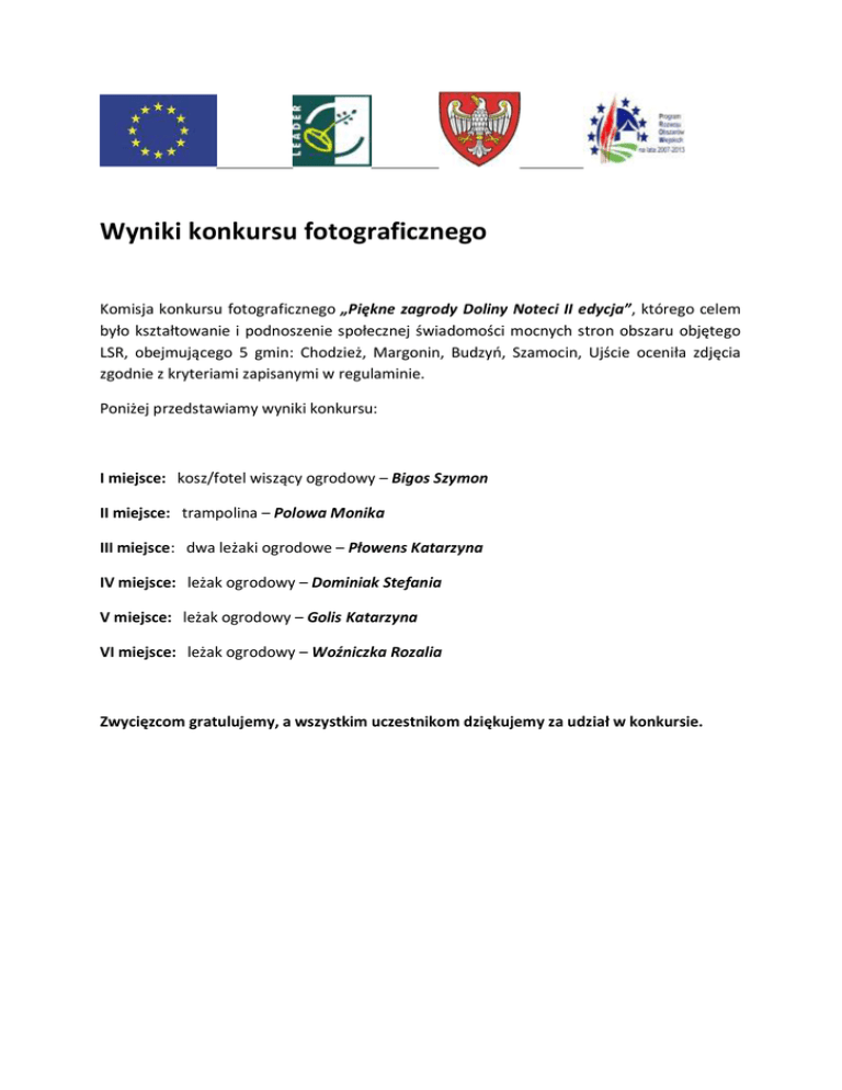 Wyniki konkursu fotograficznego Komisja konkursu fotograficznego „Piękne zagrody Doliny Noteci II edycja”, którego celem było kształtowanie i podnoszenie społecznej świadomości mocnych stron obszaru objętego LSR, obejmującego 5 gmin: Chodzież, Margonin, Budzyń, Szamocin, Ujście oceniła zdjęcia zgodnie z kryteriami zapisanymi w regulaminie. Poniżej przedstawiamy wyniki konkursu: I miejsce: kosz/fotel wiszący ogrodowy – Bigos Szymon II miejsce: trampolina – Polowa Monika III miejsce: dwa leżaki ogrodowe – Płowens Katarzyna IV miejsce: leżak ogrodowy – Dominiak Stefania V miejsce: leżak ogrodowy – Golis Katarzyna VI miejsce: leżak ogrodowy – Woźniczka Rozalia Zwycięzcom gratulujemy, a wszystkim uczestnikom dziękujemy za udział w konkursie.
