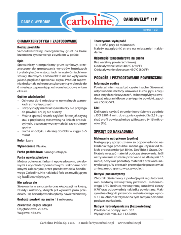 CARBOWELD® 11P strona: 1 z 3 CHARAKTERYSTYKA I ZASTOSOWANIE Rodzaj produktu Samoutwardzalny, nieorganiczny grunt na bazie krzemianu cynku; wersja z cynkiem w paście. Opis Spawalniczy nieorganiczny grunt cynkowy, przeznaczony do gruntowania wyrobów hutniczych i prefabrykatów w stoczniach i w wytwórniach konstrukcji stalowych. Carboweld 11 nie ma wpływu na jakość, prędkość spawania i cięcia. Produkt zapewnia doskonałą ochronę antykorozyjną w okresie do 6 miesięcy, zapewniając ochronę katodową w tym okresie. Ogólne właściwości – Ochrona do 6 miesięcy w normalnych warunkach atmosferycznych – Rozpryśnięty materiał spawalniczy nie przylega do powłoki ani jej nie niszczy – Można spawać równie szybko i łatwo jak czystą stal, z prędkością stosowaną na liniach produkcyjnych, bez utraty wytrzymałości czy struktury spoiny – Sucha w dotyku i dalszej obróbki w ciągu 3–5 minut Kolor Szary Wykończenie Płaskie. Farba podkładowa Samogruntująca. Farba nawierzchniowa Można pokrywać farbami epoksydowymi, akrylowymi i wysokotemperaturowymi silikonami oraz innymi zalecanymi przez przedstawiciela handlowego Carboline. Nie nakładać farb ze zmydlającym się środkiem wiążącym. Teoretyczna wydajność 11,11 m2/l przy 18 mikronach Należy uwzględnić straty na mieszanie i nakładanie. Odporność temperaturowa na sucho Bez warstwy powierzchniowej: Oddziaływanie stałe: 400°C (750°F) Oddziaływanie okresowe: 430°C (800°F) PODŁOŻE I PRZYGOTOWANIE POWIERZCHNI Informacje ogólne Powierzchnie muszą być czyste i suche. Stosować odpowiednie metody usuwania kurzu, pyłu i oleju oraz innych zanieczyszczeń, które mogłyby spowodować nieprawidłowe przyleganie powłoki, zgodnie z SSPC-SP1. Stal Delikatnie czyścić strumieniowo-ściernie zgodnie z ISO 8501-1 min. do stopnia czystości Sa 2,5 i uzyskać profil powierzchni po szlifowaniu 9–15 mikronów (Ra). SPRZĘT DO NAKŁADANIA Malowanie natryskowe (ogólne) Następujący sprzęt uznano za odpowiedni do nakładania tego produktu i można go uzyskać od takich producentów jak Binks, DeVilbiss i Graco. Delikatnie mieszać materiał podczas stosowania. Jeśli natryskiwanie zostanie przerwane na dłużej niż 15 minut, odzyskać pozostały materiał z przewodu natryskowego. W okresach przestoju nie pozostawiać zmieszanego gruntu w przewodach. Grubość powłoki na sucho 18 mikronów Natrysk pneumatyczny Zbiornik ciśnieniowy z podwójnymi regulatorami, min średnicą wewnętrzną przewodu materiałowego 3/8”, średnicą wewnętrzną końcówki cieczy 0,70” oraz odpowiednią nakładką powietrzną. Maksymalna długość przewodu materiałowego wynosi 15 m. Zbiornik trzymać na tym samym poziomie podczas nakładania. Zawartość części stałych Objętościowo: 20±2% Wagowo: 48±2% Natrysk hydrodynamiczny (bezpowietrzny) Przełożenie pompy: min. 30:1 Wydajność: min. 3,0; 11,5 l/min Nie zaleca się Stosowania w zanurzeniu oraz ekspozycji na kwasy, zasady i roztwory, których pH wykracza poza przedział 5–10, bez odpowiedniej farby nawierzchniowej. Carboline Polska Sp. z o.o. e-mail: [email protected] www.carboline.pl CARBOWELD® 11P strona: 2 z 3 Przewód materiałowy (śr. wewn.): min. 3/8” Średnica dyszy: 0,017–0,021” Ciśnienie na wylocie z dyszy: 1500–2000 (100–140 ATM) Wielkość filtra: wielkość oczka 60 Zalecane są uszczelnienia teflonowe dostępne u producentów pomp. CZYSZCZENIE I BEZPIECZEŃSTWO Pędzel Do poprawek na niewielkich powierzchniach, mniejszych niż 0,4 m2. Używać pędzla o średniej długości włosia i unikać ponownych pociągnięć pędzlem. Bezpieczeństwo Zapoznać się i przestrzegać wszystkich ostrzeżeń podanych w Karcie Charakterystyki i Karcie Wyrobu. Stosować standardowe środki ostrożności. Osoby nadwrażliwe powinny stosować odzież ochronną, rękawice oraz nakładać krem ochronny na twarz, ręce oraz inne odsłonięte części ciała. Wałek Nie zaleca się. MIESZANIE I ROZCIEŃCZANIE Mieszanie Oddzielnie mieszać bazę mechanicznie, następnie połączyć i mieszać mechanicznie oba składniki razem w podanych niżej proporcjach. Nalewać powoli wstępnie zmieszaną bazę w wypełniacz w postaci pasty cynkowej, ciągle mieszając. Mieszać, do rozmieszania grudek. Przelać mieszaninę przez sito o wielkości oczka 30. NIE MIESZAĆ ZESTAWÓW O NIEPEŁNEJ ILOŚCI SKŁADNIKÓW. Proporcje Wagowo: Ciecz nośna: 55% Pasta cynkowa: 45% Rozcieńczanie Zwykle nie rozcieńcza się, można jednak rozcieńczyć do 5% rozcieńczalnikiem nr 33 w przypadku wysokich temperatur lub wiatru. W przypadku niskich temperatur, poniżej 16°C (60°F), rozcieńczyć do 5% objętościowo rozcieńczalnikiem nr 21. Użycie rozcieńczalników innych niż te, które zostały dostarczone lub zaakceptowane przez Carboline może spowodować pogorszenie właściwości produktu i unieważnienie gwarancji na produkt (wyrażonej lub domniemanej). Okres przydatności po wymieszaniu składników 36 godz. w temp. 20°C 18 godz. w temp. 30°C i krócej w wyższych temperaturach. Okres przydatności mija, gdy materiał staje się zbyt lepki do użycia. Carboline Polska Sp. z o.o. Czyszczenie Stosować rozcieńczalnik nr 21 lub alkohol izopropylowy. W przypadku rozlania produktu wchłonąć go i utylizować zgodnie z odpowiednimi przepisami lokalnymi. Wentylacja W przypadku stosowania produktu jako wyściółka zbiorników w zamkniętych pomieszczeniach należy zapewnić odpowiednią wentylację, w czasie i po nakładaniu, aż do wyschnięcia powłoki. Wentylacja powinna być na tyle wydajna, aby zapobiec stężeniu oparów rozpuszczalnika na poziomie dolnej granicy wybuchowości dla stosowanych rozpuszczalników. Oprócz zapewnienia odpowiedniej wentylacji personel nakładający farbę musi stosować odpowiednie aparaty oddechowe. Ostrzeżenie Produkt zawiera palne rozpuszczalniki. Trzymać z dala od iskier i otwartego płomienia. Wszelkie urządzenia i instalacje elektr