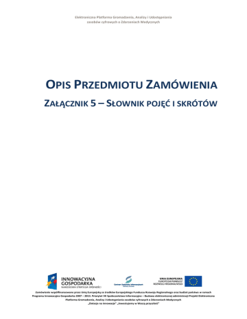 Elektroniczna Platforma Gromadzenia, Analizy i Udostępniania zasobów cyfrowych o Zdarzeniach Medycznych OPIS PRZEDMIOTU ZAMÓWIENIA ZAŁĄCZNIK 5 – SŁOWNIK POJĘĆ I SKRÓTÓW Zamówienie współfinansowane przez Unię Europejską ze środków Europejskiego Funduszu Rozwoju Regionalnego oraz budżet państwa w ramach Programu Innowacyjna Gospodarka 2007 – 2013. Priorytet VII Społeczeństwo Informacyjne – Budowa elektronicznej administracji Projekt Elektroniczna Platforma Gromadzenia, Analizy i Udostępniania zasobów cyfrowych o Zdarzeniach Medycznych „Dotacje na innowacje” „Inwestujemy w Waszą przyszłość” Elektroniczna Platforma Gromadzenia, Analizy i Udostępniania zasobów cyfrowych o Zdarzeniach Medycznych Strona 3 z 6 Spis treści 1 Słownik Pojęć ........................................................................................................................................... 4 2 Słownik skrótów ....................................................................................................................................... 5 Strona 4 z 6 1 SŁOWNIK POJĘĆ Niniejsza lista pojęć stanowi uzupełnienie do słownika zdefiniowanego w ramach Umowy. Pojęcie Opis Autoryzacja Funkcja bezpieczeństwa, która potwierdza, czy dany podmiot jest uprawniony do korzystania z żądanego zasobu. Wyrażenie zgody na dostęp do pewnej funkcjonalności lub danych. Łącze telekomunikacyjne łączące ośrodki COPD oraz ZOPD. Łącze replikacyjne Oprogramowanie standardowe. Oprogramowanie gotowe Oprogramowanie standardowe – komercyjne Oprogramowanie standardowe – publiczne Projekt Oprogramowanie gotowe niebędące oprogramowaniem standardowym – publicznym. Oprogramowanie spełniające definicję określoną przez Free Software Foundation, dostępną pod adresem: http://www.gnu.org/philosophy/freesw.html. Projekt pn. „Elektroniczna Platforma Gromadzenia, Analizy i Udostępniania zasobów cyfrowych o Zdarzeniach Medycznych”. System P1 wdrażany w ramach Projektu. System Strona 5 z 6 2 SŁOWNIK SKRÓTÓW Skrót Opis AIP Aplikacja Innych Podmiotów - aplikacja udostępniana podmiotom w modelu AaaS AP Aplikacja Płatników - aplikacja udostępniana płatnikom w modelu AaaS API Application Programming Interface (Interfejs programowania aplikacji) AUiA Aplikacja Usługodawców i Aptek - aplikacja udostępniana usługodawcom w modelu AaaS COPD Centralny Ośrodek Przetwarzania Danych COTS Oprogramowanie standardowe CSIOZ Centrum Systemów Informacyjnych Ochrony Zdrowia CWPM Centralny Wykaz Pracowników Medycznych CWUb Centralny Wykaz Usługobiorców CWUd Centralny Wykaz Usługodawców DMZ Zdemilitaryzowana strefa lokalnej sieci komputerowej (De-Militarized Zone) GUI Graficzny interfejs użytkownika (Graphical user interface) HD-ASR Hurtownia Danych – Analizy, Statystyki i Raporty HD-M Hurtownia Danych – Monitorowanie IKP Internetowe Konto Pacjenta KPI Kluczowy wskaźnik wydajności (Key Performance Indicator) – wskaźnik stosowany jako miernik oceny procesu realizacji celów organizacji. P1 Projekt pn. „Elektroniczna Platforma Gromadzenia, Analizy i Udostępniania Zasobów Cyfrowych o Zdarzeniach Medycznych” PBRDM Pomocnicza Baza Rozszerzonych Danych Medycznych PKI Patrz: infrastruktura klucza publicznego Strona 6 z 6 POPD Pomocniczy Ośrodek Zamawiającego Przetwarzania danych znajdujący się w siedzibie QoS Quality of Service – mechanizmy gwarantujące określony poziom usług sieciowych SA-Ad System Administracji – Administracja SA-Au System Administracji – Audyt SA-ZiP System Administracji – Zabezpieczenia i Prywatność SGDM-ODM System Gromadzenia Danych Medycznych – Osobista Dokumentacja Medyczna SGDM-R System Gromadzenia Danych Medycznych – Recepty SGDM-SiZ System Gromadzenia Danych Medycznych – Skierowania i Zwolnienia SGDM-ZM System Gromadzenia Danych Medycznych – Zdarzenia Medyczne SIOZ System Informacji w Ochronie Zdrowia SLA Service Level Agreement (umowa określająca poziom jakości świadczonych usług informatycznych) SOR-R System Obsługi Rejestrów – Rejestry SOR-S System Obsługi Rejestrów – Słowniki SOR-ZDP System Obsługi Rejestrów – Zarządzanie Danymi Podstawowymi SW System Weryfikacji SWN System Wykrywania Nadużyć SWR-WRL System Wsparcia Rozliczeń – Wsparcie Refundacji Leków SWR-WRU System Wsparcia Rozliczeń – Wsparcie Rozliczenia Usług ZOPD Zapasowy Ośrodek Przetwarzania Danych