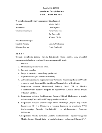 Protokół Nr 66/2005 z posiedzenia Zarządu Powiatu z dnia 23 marca 2005 roku. W posiedzeniu udział wzięli wg załączonej listy obecności: Starosta Marian Janicki Wicestarosta Leon Żujewski Członkowie Zarządu: Paweł Rutkowski Jan Raczyński Wiesław Cieślak Ponadto uczestniczyli: Skarbnik Powiatu Daniela Wołkońska Sekretarz Powiatu Erwin Smoliński Ad. 1, 2, 3. Otwarcia posiedzenia dokonał Starosta Działdowski Marian Janicki, który stwierdził prawomocność obrad oraz przedstawił następujący porządek obrad: 1. Otwarcie. 2. Stwierdzenie prawomocności obrad. 3. Przyjęcie porządku. 4. Przyjęcie protokołu z poprzedniego posiedzenia. 5. Uzgodnienie decyzji o warunkach zabudowy. 6. Zatwierdzenie zażalenia na postanowienie Warmińsko-Mazurskiego Kuratora Oświaty w sprawie: opinii dotyczącej likwidacji Bursy Międzyszkolnej w Działdowie. 7. Rozpatrzenie wniosku Młodzieżowej Orkiestry Dętej OSP w Płośnicy o dofinansowanie kosztów transportu na Ogólnopolski Konkurs Orkiestr Dętych w Krynicy Górskiej. 8. Rozpatrzenie wniosku Działdowskiego Centrum Edukacji Ekologicznej o dotację na Powiatowy Konkurs Piosenki Turystyczno Przyrodniczej. 9. Rozpatrzenie wniosku Uczniowskiego Klubu Sportowego „Trójka” przy Szkole Podstawowej Nr 3 w Działdowie o wsparcie finansowe na organizację XVIII Ogólnopolskiego Turnieju „Przedwiośnia” w Minikoszykówce Dziewcząt i Chłopców. 10. Rozpatrzenie wniosku Burmistrza Lidzbarka o dofinansowanie , organizowanej przez Miejsko-Gminny Ośrodek Kultury w Lidzbarku, imprezy pod nazwą „II Turniej Wsi”. 11. Rozpatrzenie wniosku Samodzielnego Publicznego Zakładu Opieki Zdrowotnej w Działdowie o sfinansowanie remontu dachu szpitala. 12. Rozpatrzenie zażalenia Pani Krystyny Skorupskiej zam. w Lipówce gmina Działdowo w sprawie przyznania stypendium ZPORR dla ucznia szkoły ponadgimnazjalnej (ZSR CKP Gródki). 13. Rozpatrzenie i podjęcie uchwały w sprawie pomocy finansowej dla gmin: Rybno, Płośnicy, Iłowa i Miasta i Gminy Lidzbark na realizację zadań z zakresu kultury i kultury fizycznej. 14. Rozpatrzenie i podjęcie uchwał w sprawie realizowanych przez Powiat działań w dziedzinie kultury: - organizacji Turnieju Wiedzy o Ruchu Drogowym – Prawo Jazdy 2005; - organizacji Powiatowego Konkursu „Niesienie Pierwszej Pomocy”; - organizacji Konkursu Wiedzy Pożarniczej; - organizacji Powiatowego Konkursu Wiedzy Ekologicznej; - organizacji Powiatowego Konkursu Recytatorskiego Poezji Młodzieżowej; 15. Rozpatrzenie i przyjęcie sprawozdania z działalności PCPR w Działdowie za 2004 rok. 16. Rozpatrzenie ofert dotyczących powierzenia prowadzenia Ośrodka Interwencji Kryzysowej. 17. Rozpatrzenie ofert dotyczących zapewnienia opieki dzieciom pochodzącym z Powiatu Działdowskiego pozbawionym całkowicie lub częściowo opieki rodzicielskiej, opieki i wychowania poprzez umieszczenie ich w placówce opiekuńczo-wychowawczej. 18. Zaopiniowanie wystąpienia Powiatu Działdowskigo z wnioskami o dofinansowanie w ramach „Programu Wyrównywanie Różnic Między Regionami”. 19. Rozpatrzenie i przyjęcie uchwały w sprawie: przyjęcia sprawozdania z wykonania budżetu powiatu na 2004 r. 20. Przyjęcie projektów uchwał Rady Powiatu Działdowskiego na XXIV Sesję Rady Powiatu w sprawie: - przekształcenia Policealnej Szkoły przy ZSR CKP w Gródkach; - utworzenia Szkoły Policealnej przy ZSZ w Działdowie ul. Pocztowa; - utworzenia Szkoły Policealnej przy ZSZ w Iłowie; - utworzenia Liceum Ogólnokształcącego na podbudowie gimnazjum przy ZSZ w Iłowie; - utworzenia 2-letniego Uzupełniającego Liceum Ogólnokształcącego przy LO im. K.K.Baczyńskiego w Lidzbarku; - utworzenia Technikum Rolniczego przy Zespole Szkół w Malinowie; 2 - zmiany uchwały Nr III/27/02 Rady Powiatu Działdowskiego z dnia 30 grudnia 2002 roku w sprawie ustalenia warunków pracy i płacy Powiatowego Rzecznika Konsumentów w Działdowie. 21. Sprawy bieżące. 22. Wolne wnioski. 23. Zamknięcie obrad. Zarząd Powiatu jednogłośnie przyjął porządek posiedzenia. Ad.4. Zarząd przyjął protokół z poprzedniego posiedzenia. Ad.5. Uczestniczy Dyrektor Powiatowego Zarządu Dróg – Jerzy Grochocki Jerzy Grochocki Przedstawił projekty decyzji o warunkach zabudowy. Zarząd Powiatu jednogłośnie (4 głosami ) podjął : Postanowienie Nr 174/05 w sprawie uzgodnienia decyzji o warunkach zabudowy (Postanowienie stanowi zał. do niniejszego protokołu) Postanowienie Nr 175/05 w sprawie uzgodnienia decyzji o warunkach zabudowy (Postanowienie stanowi zał. do niniejszego protokołu) Postanowienie Nr 176/05 w sprawie uzgodnienia decyzji o warunkach zabudowy (Postanowienie stanowi zał. do niniejszego protokołu) 3 Ad.6. Sekretarz Powiatu Erwin Smoliński Zgodnie z § 9 pkt 6 Regulaminu Organizacji i Pracy Zarządu Powiatu Działdowskiego, stanowiącego zał. Nr 5 do Statutu Powiatu Działdowskiego, Pan Starosta podjął czynności w imieniu Zarządu Powiatu składając zażalenie na postanowienie Warmińsko-Mazurskiego kuratora Oświaty z dnia 09.03.05r. dot. negatywnej opinii w sprawie zamiaru likwidacji Bursy Międzyszkolnej w Działdowie. Starosta wykonał tę czynność miedzy posiedzeniami Zarządu ponieważ upływał termin złożenia w/w zażalenia. Starosta Działdowski Marian Janicki Kurator Oświaty wniósł negatywną opinię w sprawie zamiaru likwidacji Bursy Międzyszkolnej. W związku z powyższym w imieniu Zarządu wniosłem odwołanie do Ministra Edukacji Narodowej i Sportu. /Zażalenie stanowi zał. do niniejszego protokołu/. Paweł Rutkowski Nie zgadzam się z wypowiedzią w artykule prasowym, w której Pani Dyrektor Bursy wypowiada się na temat działań związanych z tym problemem. Zarząd jest pewny, że działania odnośnie zamiaru likwidacji Bursy podejmowane były w przemyślany sposób. Nie prawdą jest, że pani Dyrektor Bursy nie została powiadomiona o zamiarze likwidacji placówki. Nie prawdą jest również, że Zarz