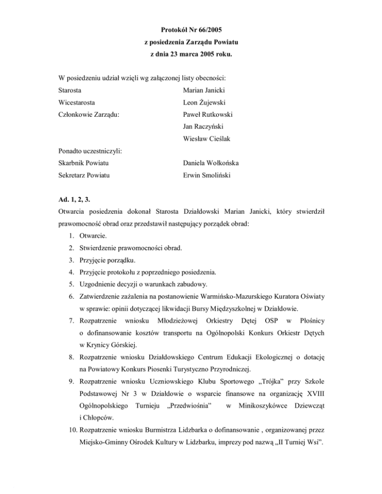 Protokół Nr 66/2005 z posiedzenia Zarządu Powiatu z dnia 23