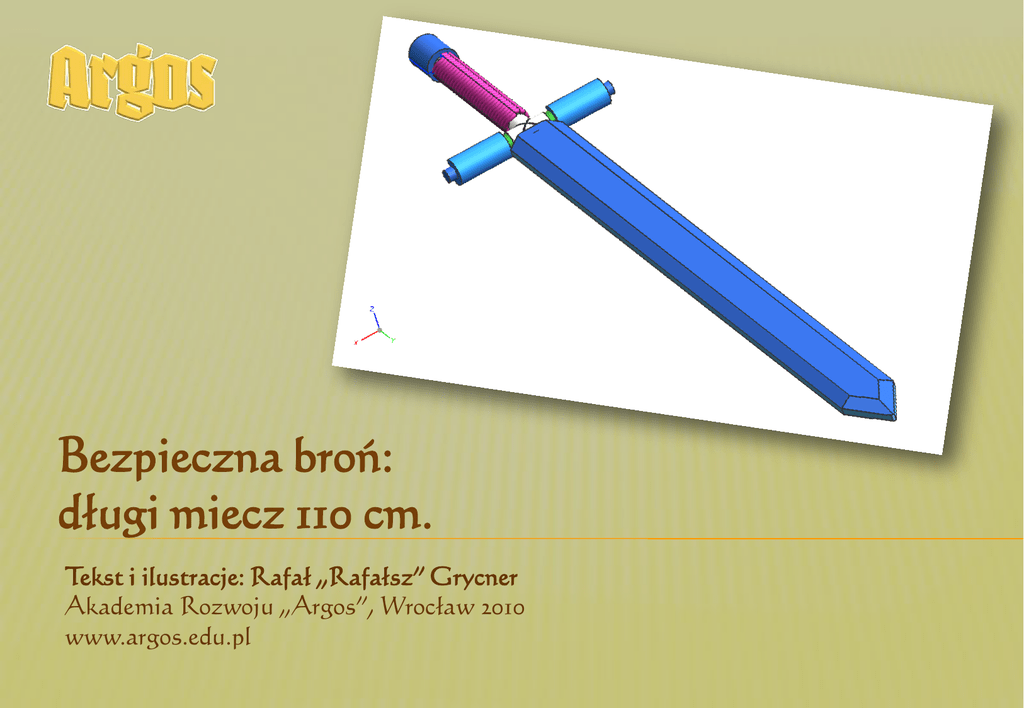 Bezpieczna broń: długi miecz 110 cm. Tekst i ilustracje: Rafał „Rafałsz” Grycner Akademia Rozwoju „Argos”, Wrocław 2010 www.argos.edu.pl Spis treści Część I: Budowa szkieletu (rdzenia). Część II Modelowanie ostrza Część III Wykończenie rękojeści i jelca 2 Cienka rurka (CPVC 1/2”) i śruba M12x120 Zacznij od wklejenia śruby do cienkiej rurki. Śrubę M12 wystarczy obkleić tylko jedną warstwą taśmy malarskiej, aby wchodziła ciasno. 3 Dodajemy grubą rurkę (PVC 1/2”) Poprzedni element wklej w grubą rurkę. Cienka rurka przed wklejeniem będzie wymagała obklejenia taśmą malarską na całej swojej długości. 4 Tak to wygląda po sklejeniu Łeb śruby jest minimalnie szerszy niż gruba rurka, ale to dobrze. Gruba rurka jest zaczątkiem rękojeści broni. Jej długość ma bezpośrednie przełożenie na długość rękojeści. 5 Zaślepka na łeb śruby Na łeb śruby załóż zaślepkę pasującą do rurek PVC 1/2”. Nie musisz jej wklejać, ponieważ wejdzie na wcisk. Nie nabijaj zaślepki na śrubę, bo pęknie. 6 Wklejamy pręt z włókna szklanego Możesz wykorzystać pręt o średnicy 8 lub 10 mm. W tym opracowaniu wykorzystano pręt 8 mm. Wklej go w cienką rurkę i dopchnij aż do samej śruby. Przedtem obklej pręt taśmą malarską (patrz: następny slajd). 7 Bardzo ważne: Cały pręt obklej jedną warstwą taśmy malarskiej. Odcinek wchodzący w cienką rurkę obklej tyloma warstwami ile jest niezbędnych do ciasnego pasowania pręta. Nie może być luzów u wylotu rurki między nią a prętem. Ma to bezpośredni wpływ na trwałość rdzenia. Wklejając pręt do rurki pilnuj tego, aby podciśnienie nie wypychało pręta do góry. Przytrzymaj go jeśli będzie trzeba i poczekaj kilkanaście minut aż klej zwiąże. 8 Widok wklejonego pręta Wklejając pręt w cienką rurkę zaznacz sobie miejsce, do którego powinien wejść. Pozwoli ci to później sprawdzać czy pręt jest dopchnięty do końca. 9 Montujemy czwórnik Kształtka powinna pasować do PVC 1/2”. Wklej ją na grubą rurkę. Z drugiej strony pozostanie luz. 10 Czwórnik w przekroju Grubej rurki nie da się przetknąć przez cały czwórnik, bo kształtka zwęża się wewnątrz (nie widać tego na tym rysunku). 11 Dodajemy pierścień Aby czwórnik stabilnie trzymał się na rdzeniu, należy z drugiej strony wkleić pierścień o długości kilku centymetrów. 12 Ramiona jelca Najpierw wklej w czwórnik pierścienie z grubej rurki, a potem w te pierścienie wklej fragmenty cienkiej rurki, tak aby dochodziły do samego rdzenia. To zwiększy stabilność ramion. Podobnie jak w poprzednim slajdzie. 13 Gotowy jelec Gotowy jelec wygląda w ten sposób. Ramiona jelca powinny być ok. 3 cm krótsze niż docelowa szerokość jelca. Należy pamiętać o miękkiej końcówce. 14 Gotowy rdzeń Tak wygląda gotowy rdzeń miecza. Następny slajd kończy I część instruktarzu. 15 Koniec I części Widok rdzenia z przodu. 16 Spis treści Część I: Budowa szkieletu (rdzenia). Część II Modelowanie ostrza Część III Wykończenie rękojeści i jelca 17 Spodnia warstwa karimaty Wykorzystujemy karimatę o grubości 8 mm. Przyklej ją do rdzenia od spodu. (Jak przykleić karimatę do rdzenia? Zobacz: „instruktaż wykonania broni bezpiecznej” strona 6, pt. VI. 2. „przyklejanie taśmy dwustronnej na rdzeń (…)”) 18 Zabezpieczenie sztychu Końcówkę pręta należy zabezpieczyć poprzez przyklejenie krążka gumy lub skóry/skaju o średnicy ~3cm. 19 Środkowa warstwa karimaty Karimatę rozetnij po środku na długości rdzenia. 20 Rozcięcie przy jelcu Tam gdzie rdzeń się rozszerza przy jelcu możesz poszerzyć rozcięcie. 21 Rozcięcie przy sztychu Nie rozcinaj środkowego paska karimaty do końca. 22 Zabezpieczenie sztychu po raz drugi Podobnie jak wcześniej, na końcówce rdzenia przyklej krążek materiału zabezpieczającego. 23 Wierzchnia warstwa karimaty Przyklej ją do warstwy środkowej przy pomocy taśmy dwustronnej. Teraz ostrze jest gotowe do wycięcia kształtu. 24 Przekrój poprzeczny przez ostrze Tak to wygląda w przekroju. Środkowa warstwa karimaty będzie wystawać trochę po bokach. Wszystkie warstwy powinny być dobrze dociśnięte do rdzenia. 25 Wycinamy kształt ostrza Wytnij kształt ostrza prowadząc nóż prostopadle do podłoża. Na ostrzenie krawędzi przyjdzie czas później. Czubek nie powinien być bardzo ostry. Lepiej go delikatnie przytępić 26 Sztych Jak widać sam czubek broni został delikatnie przytępiony. Dzięki temu będzie bezpieczniejszy. 27 Ostrzenie krawędzi - przekrój W przekroju po zaostrzeniu broń powinna wyglądać tak. Warstwa środkowa nie została naruszona. Aby ostrzenie wyszło ładnie, trzeba być dokładnym i cierpliwym. 28 Ostrzenie krawędzi - widok Aby ułatwić sobie pracę, wyznacz na płazie linię, która będzie miejscem, gdzie nóż wchodzi w materiał. Na krawędzi tnącej taką linią (z której nóż wychodzi), będzie granica pomiędzy dwiema warstwami karimaty. 29 Ostrzenie sztychu Najpierw zaostrz proste krawędzie, a potem oddzielnie zaostrz krawędzie sztychu. Nie musisz ciąć całości za jednym razem. 30 Spis treści Część I: Budowa szkieletu (rdzenia). Część II Modelowanie ostrza Część III Wykończenie rękojeści i jelca 31 Głowica Do zaślepki przyklej kolejno 3 warstwy karimaty. Potem zaślepkę wraz z karimatą obklej paskiem karimaty o odpowiedniej szerokości i długości. 32 Jelec I Obklej ramię jelca (wystarczy od góry) karimatą. Pasek karimaty utnij 3cm dłuższy niż ramię jelca. 33 Jelec I – oba ramiona Końcówki karimaty możesz ścisnąć i skleić na płasko. Możesz też zrobić tak jak w wersji II jelca – patrz dalej 34 Jelec II W wolną przestrzeń w obrębie karimaty na jelcu możesz wkleić zwinięty ciasno kawałek karimaty, tak aby wypełnić lukę. 35 Jelec II – oba ramiona Końce takiego jelca ograniczonym zakresie. możesz potem profilować w 36 Rękojeś