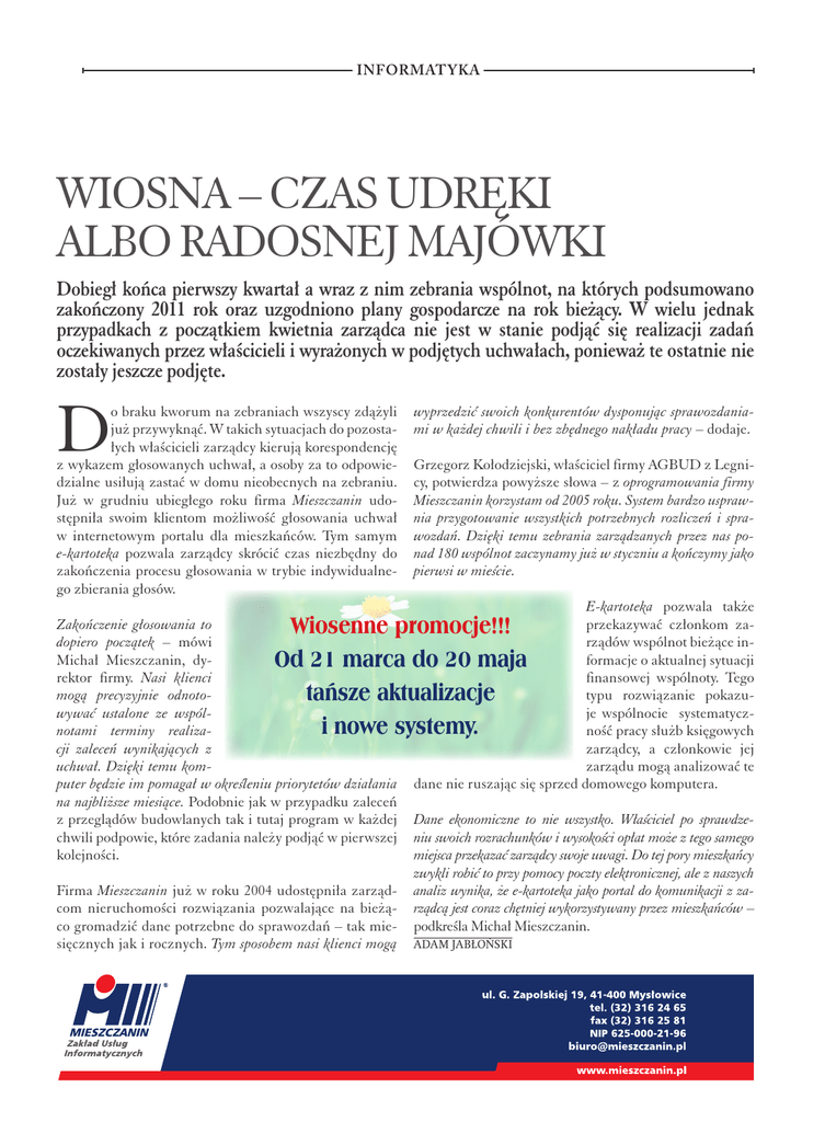 informatyka Wiosna – czas udręki albo radosnej majówki Dobiegł końca pierwszy kwartał a wraz z nim zebrania wspólnot, na których podsumowano zakończony 2011 rok oraz uzgodniono plany gospodarcze na rok bieżący. W wielu jednak przypadkach z początkiem kwietnia zarządca nie jest w stanie podjąć się realizacji zadań oczekiwanych przez właścicieli i wyrażonych w podjętych uchwałach, ponieważ te ostatnie nie zostały jeszcze podjęte. D o braku kworum na zebraniach wszyscy zdążyli już przywyknąć. W takich sytuacjach do pozostałych właścicieli zarządcy kierują korespondencję z wykazem głosowanych uchwał, a osoby za to odpowiedzialne usiłują zastać w domu nieobecnych na zebraniu. Już w grudniu ubiegłego roku firma Mieszczanin udostępniła swoim klientom możliwość głosowania uchwał w internetowym portalu dla mieszkańców. Tym samym e-kartoteka pozwala zarządcy skrócić czas niezbędny do zakończenia procesu głosowania w trybie indywidualnego zbierania głosów. wyprzedzić swoich konkurentów dysponując sprawozdaniami w każdej chwili i bez zbędnego nakładu pracy – dodaje. Grzegorz Kołodziejski, właściciel firmy AGBUD z Legnicy, potwierdza powyższe słowa – z oprogramowania firmy Mieszczanin korzystam od 2005 roku. System bardzo usprawnia przygotowanie wszystkich potrzebnych rozliczeń i sprawozdań. Dzięki temu zebrania zarządzanych przez nas ponad 180 wspólnot zaczynamy już w styczniu a kończymy jako pierwsi w mieście. E-kartoteka pozwala także Zakończenie głosowania to przekazywać członkom zaWiosenne promocje!!! dopiero początek – mówi rządów wspólnot bieżące inMichał Mieszczanin, dyformacje o aktualnej sytuacji Od 21 marca do 20 maja rektor firmy. Nasi klienci finansowej wspólnoty. Tego mogą precyzyjnie odnototypu rozwiązanie pokazutańsze aktualizacje wywać ustalone ze wspólje wspólnocie systematyczi nowe systemy. notami terminy realizaność pracy służb księgowych cji zaleceń wynikających z zarządcy, a członkowie jej uchwał. Dzięki temu komzarządu mogą analizować te puter będzie im pomagał w określeniu priorytetów działania dane nie ruszając się sprzed domowego komputera. na najbliższe miesiące. Podobnie jak w przypadku zaleceń z przeglądów budowlanych tak i tutaj program w każdej Dane ekonomiczne to nie wszystko. Właściciel po sprawdzechwili podpowie, które zadania należy podjąć w pierwszej niu swoich rozrachunków i wysokości opłat może z tego samego kolejności. miejsca przekazać zarządcy swoje uwagi. Do tej pory mieszkańcy zwykli robić to przy pomocy poczty elektronicznej, ale z naszych Firma Mieszczanin już w roku 2004 udostępniła zarząd- analiz wynika, że e-kartoteka jako portal do komunikacji z zacom nieruchomości rozwiązania pozwalające na bieżą- rządcą jest coraz chętniej wykorzystywany przez mieszkańców – co gromadzić dane potrzebne do sprawozdań – tak mie- podkreśla Michał Mieszczanin. sięcznych jak i rocznych. Tym sposobem nasi klienci mogą Adam Jabłoński 23