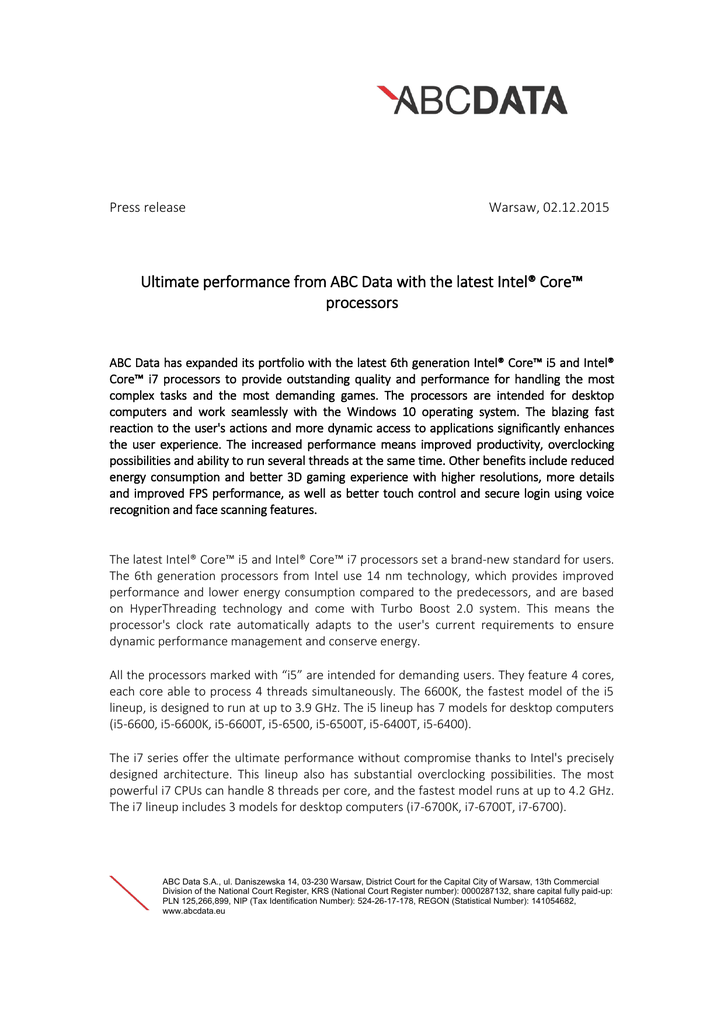 Press release Warsaw, 02.12.2015 Ultimate performance from ABC Data with the latest Intel® Core™ processors ABC Data has expanded its portfolio with the latest 6th generation Intel® Core™ i5 and Intel® Core™ i7 processors to provide outstanding quality and performance for handling the most complex tasks and the most demanding games. The processors are intended for desktop computers and work seamlessly with the Windows 10 operating system. The blazing fast reaction to the user's actions and more dynamic access to applications significantly enhances the user experience. The increased performance means improved productivity, overclocking possibilities and ability to run several threads at the same time. Other benefits include reduced energy consumption and better 3D gaming experience with higher resolutions, more details and improved FPS performance, as well as better touch control and secure login using voice recognition and face scanning features. The latest Intel® Core™ i5 and Intel® Core™ i7 processors set a brand-new standard for users. The 6th generation processors from Intel use 14 nm technology, which provides improved performance and lower energy consumption compared to the predecessors, and are based on HyperThreading technology and come with Turbo Boost 2.0 system. This means the processor's clock rate automatically adapts to the user's current requirements to ensure dynamic performance management and conserve energy. All the processors marked with “i5” are intended for demanding users. They feature 4 cores, each core able to process 4 threads simultaneously. The 6600K, the fastest model of the i5 lineup, is designed to run at up to 3.9 GHz. The i5 lineup has 7 models for desktop computers (i5-6600, i5-6600K, i5-6600T, i5-6500, i5-6500T, i5-6400T, i5-6400). The i7 series offer the ultimate performance without compromise thanks to Intel's precisely designed architecture. This lineup also has substantial overclocking possibilities. The most powerful i7 CPUs can handle 8 threads per core, and the fastest model runs at up to 4.2 GHz. The i7 lineup includes 3 models for desktop computers (i7-6700K, i7-6700T, i7-6700). ABC Data S.A., ul. Daniszewska 14, 03-230 Warsaw, District Court for the Capital City of Warsaw, 13th Commercial Division of the National Court Register, KRS (National Court Register number): 0000287132, share capital fully paid-up: PLN 125,266,899, NIP (Tax Identification Number): 524-26-17-178, REGON (Statistical Number): 141054682, www.abcdata.eu The latest Intel Iris GPU is also something worth mentioning. It supports resolutions up to 4K and offers enough performance to handle today's games and programs even without an external graphics card. That is not all. The most promising, and slightly magical, feature that comes with the 6th generation Intel processors is the RealSense camera, which supports gesture control of devices and applications. You can now use 'Minority Report'-like gestures in your own home. RealSense also scans objects into 3D masks, so you can make models of things and people and share them in social media or print them using a 3D printer at any moment. O ABC Data S.A. ABC Data S.A. jest liderem rynku dystrybucji sprzętu IT i elektroniki użytkowej w Polsce oraz jedynym podmiotem działającym bezpośrednio w ośmiu państwach Europy Środkowej i Wschodniej (należących do UE). Firma od ponad 25 lat oferuje sprzęt komputerowy, oprogramowanie i elektronikę użytkową. ABC Data dysponuje największą na rynku ofertą ponad 100 tys. produktów ponad 430 renomowanych dostawców. W ostatnich miesiącach do portfolio produktowego włączone zostały nowe kategorie takie jak produkty smart, artykuły papiernicze i biurowe, zabawki oraz narzędzia i elektronarządzia. Dzięki systematycznemu rozwojowi i wieloletnim inwestycjom w internetowe platformy obsługi klientów, firma zajmuje czołową pozycję w zakresie sprzedaży on-line. W latach 2009 – 2014 ABC Data została pięciokrotnie wyróżniona nagrodą EMEA Channel Academy dla najlepszego dystrybutora regionu Europy Środkowo-Wschodniej. W 2015 roku spółka po raz kolejny zajęła pierwsze miejsce w głównym rankingu raportu Computerworld TOP 200 utrzymując status największej firmy informatycznej na rynku polskim. Jako pierwsza firma z Polski została członkiem GTDC, prestiżowego stowarzyszenia obejmującego 24 największych dystrybutorów IT na świecie. W 2010 roku ABC Data S.A. zadebiutowała na Giełdzie Papierów Wartościowych w Warszawie. Contact Person: Agnieszka Forasińska ABC Data S.A. [email protected] +48 22 591 67 83 ABC Data S.A., ul. Daniszewska 14, 03-230 Warsaw, District Court for the Capital City of Warsaw, 13th Commercial Division of the National Court Register, KRS (National Court Register number): 0000287132, share capital fully paid-up: PLN 125,266,899, NIP (Tax Identification Number): 524-26-17-178, REGON (Statistical Number): 141054682, www.abcdata.eu