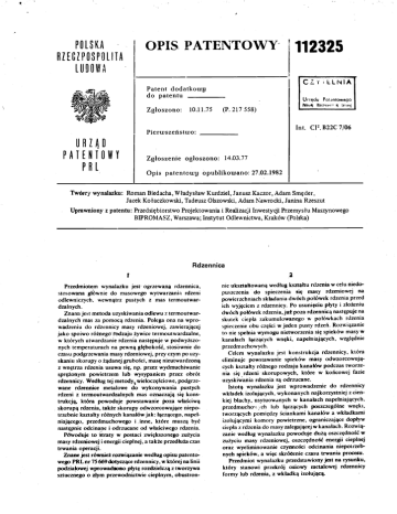 POLSU OPIS PATENTOWY RZECZPOSPOLITA 112325 LUDOWA CZY i LLNIA Patent dodatkowy do patentu Zgłoszono: 10.11.75 Urrędu Patentowego (P. 217 558) Int. Cl2.B22C7/06 Pierujszeństiuo: URZĄD PATENTOWY PRL Zgłoszenie ogłoszono: 14.03.77 Opis patentoiru opublikoiuano: 27.02.1982 Twórcy wynalazku: Roman Biedacha, Władysław Kurdziel, Janusz Kaczor, Adam Smęder, Jacek Kołaczkowski, Tadeusz Olszowski, Adam Nawrocki, Janina Rzeszut Uprawniony z patentu: Przedsiębiorstwo Projektowania i Realizacji Inwestycji Przemysłu Maszynowego BIPROMASZ, Warszawa; Instytut Odlewnictwa, Kraków (Polska) Rdzennica Przedmiotem wynalazku jest ogrzewana rdzennica, stosowana głównie do masowego wytwarzania rdzeni odlewniczych, wewnątrz pustych z mas termoutwar¬ dzalnych. Znana jest metoda uzyskiwania odlewu z termoutwar¬ nie ukształtowaną według kształtu rdzenia w celu niedo¬ puszczenia do spieczenia się masy rdzeniowej na powierzchniach składania dwóch połówek rdzenia przed ich wyjęciem z rdzennicy. Po usunięciu płyty i złożeniu dwóch połówek rdzenia, już poza rdzennicą następuje na dzalnych mas za pomocą rdzenia. Polega ona na wpro¬ wadzeniu do rdzennicy masy rdzeniowej, zawierającej jako spoiwo różnego fodzaju żywice termoutwardzalne, w których utwardzanie rdzenia następuje w podwyższo¬ nych temperaturach na pewną głębokość, stosownie do czasu podgrzewania masy rdzeniowej, przy czym po uzy¬ skaniu skorupy o żądanej grubości, masę nieutwardzoną z wnętrza rdzenia usuwa się, np. przez wydmuchiwanie sprężonym powietrzem lub wysypaniem przez obrót skutek ciepła zakumulowanego w połówkach rdzenia spieczenie obu części w jeden pusty rdzeń. Rozwiązanie rdzennicy. Według tej metody^wieloczęściowe, podgrze¬ uzyskiwania rdzenia są odrzucane. wane rdzennice metalowe do wykonywania pustych rdzeni z termoutwardzalnych mas oznaczają się kons¬ trukcją, która powoduje powstawanie poza właściwą skorupą rdzenia, także skorupy odwzorcowujące niepo¬ trzebnie kształty różnych kanałów jak: łączącego, napeł¬ niającego, przedmuchowego i. inne, które muszą być następnie odcinane i odrzucane od właściwego rdzenia. Powoduje to straty w postaci zwiększonego zużycia masy rdzeniowej i energii cieplnej, a także przedłuża czas trwania operacji. Znane jest również rozwiązanie według opisu patento¬ wego PRL nr 75 669dotyczące rdzennicy,w której na linii podziałowej wprowadiono płytę rozdzielczą z tworzywa sztucznego o złym przewodnictwie cieplnym, obustron¬ to nie spełnia wymogu nietworzenia się spieków masy w kanałach łączących wnęki, napełniających, względnie przedm uchowych. Celem wynalazku jest konstrukcja rdzennicy, która eliminuje powstawanie spieków masy odwzorowujଠcych kształty różnego rodzaju kanałów podczas tworze¬ nia się rdzeni skorupowych, które w końcowej fazie Istotą wynalazku jest wprowadzenie do rdzennicy wkładek izolujących, wykonanych najkorzystniej z cien¬ kiej blachy, usytuowanych w kanałach napełniających, przedmuchom ych lub łączących poszczególne wnęki, tworzących pomiędzy ściankami kanałów a wkładkami izolującymi komory powietrzne, ograniczające dopływ ciepła z rdzenia do masy zalegającej w kanałach. Rozwiଠzanie według wynalazku powoduje dużą oszczędność w zużyciu masy rdzeniowej, oszczędność energii cieplnej oraz wyeliminowanie czynności odcinania niepotrzeb¬ nych spieków, a więc skrócenie czasu trwania procesu. Przedmiot wynalazku przedstawiony jest na rysunku, który stanowi przekrój osiowy metalowej rdzennicy formy lub rdzenia, z wkładką izolującą. 112 325 Rdzennica wykonana z żeliwa w formie prostopadłoś¬ cianu, składa się z dwóch połówek, w których ukształto¬ wane są wnęki odwzoicowujące kształt rdzenia oraz kanały napełniający 1, przedmuchówe 2 i ewentualnie łączące poszczególne wnęki. Kanały wyłożone są wkład¬ kami 3 z cienkiej blachy stalowej, tworzącymi komory powietrzne 4, ograniczającymi dopływ ciepła od rdzen¬ nicy do masy zalegającej w kanałach. Połówki rdzennic połączone są sworzniami sprężystymi 5, których zada¬ niem jest utrzymanie się rdzennicy w złożeniu podczas transportu po krążkach przenośników. W jednej połówce rdzennicy wbudowany jest mechanizm wewnętrzny wypychania skorupy. Pojówki rdzennicy w górnej i dol¬ nej części posiadają stożkowe wręby 6, w które wchodzą trzpienie rygli mocujących rdzennicę do szczęk imadła pneumatycznego. Zastrzeżenie Rdzennica metalowa, ogrzewana, do masowego wyt¬ warzania rdzeni odlewniczych, wewnątrz pustych, z mas termoutwardzalnych, zwłaszcza otrzymywanych sposo¬ bem przedmuchiwania sprężonym powietrzem, zna¬ mienna tym, że posiada wkładki izolujące (3), wykonane najkorzystniej z cienkiej blachy, usytuowane w kanałach napełniających (1). przedmuchowych (2) i łączących poszczególne wnęki, tworzące pomiędzy ściankami kanałów a wkładkami izolującymi (3) komory powietrz ne (4). Prac. Poligraf. UP PRL. Nakład 120 egz. Cena 45 zł patentowe