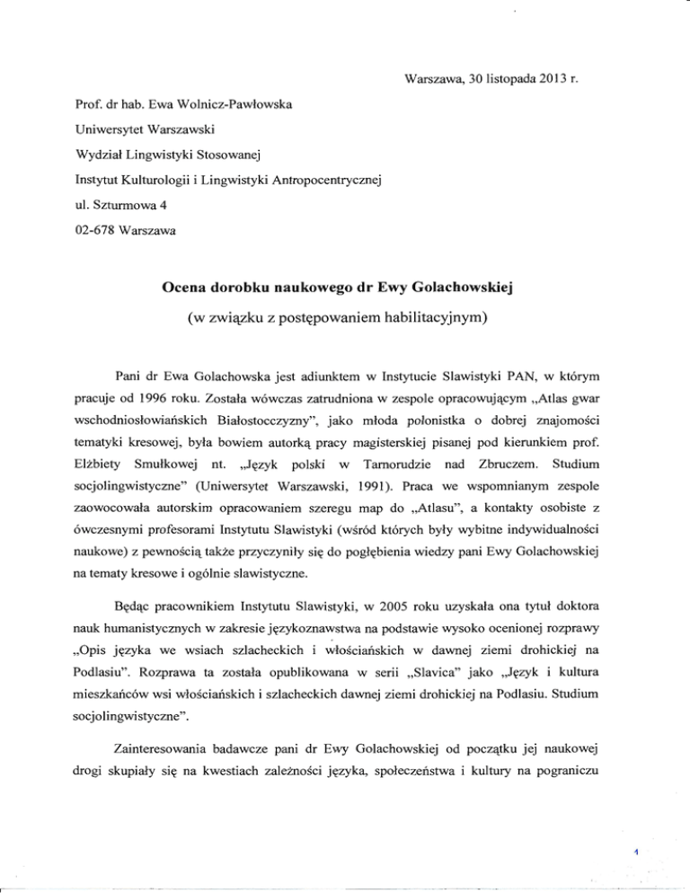 Ocena dorobku naukowego dr Ewy Golachowskiej