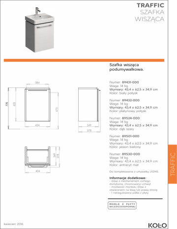 TRAFFIC SZAFKA WISZĄCA Szafka wisząca podumywalkowa. Numer: 89431-000 Waga: 14 kg Wymiary: 43,4 x 62,5 x 34,9 cm Kolor: biały połysk Numer: 89432-000 Waga: 14 kg Wymiary: 43,4 x 62,5 x 34,9 cm Kolor: platynowy połysk Numer: 89524-000 Waga: 14 kg Wymiary: 43,4 x 62,5 x 34,9 cm Kolor: dąb szary Numer: 89530-000 Waga: 14 kg Wymiary: 43,4 x 62,5 x 34,9 cm Kolor: antracyt mat Do kompletowania z umywalką L92145. Informacje dodatkowe: - drzwi z mechanizmem cichego domykania, chromowany uchwyt - możliwość montażu drzwi z otwieraniem na lewą lub prawą stronę - 1 nieregulowana półka z płyty MEBLE Z P ŁY T Y WILGOCIOODPORNEJ kwiecień 2016 TRAFFIC Numer: 89501-000 Waga: 14 kg Wymiary: 43,4 x 62,5 x 34,9 cm Kolor: jesion bielony