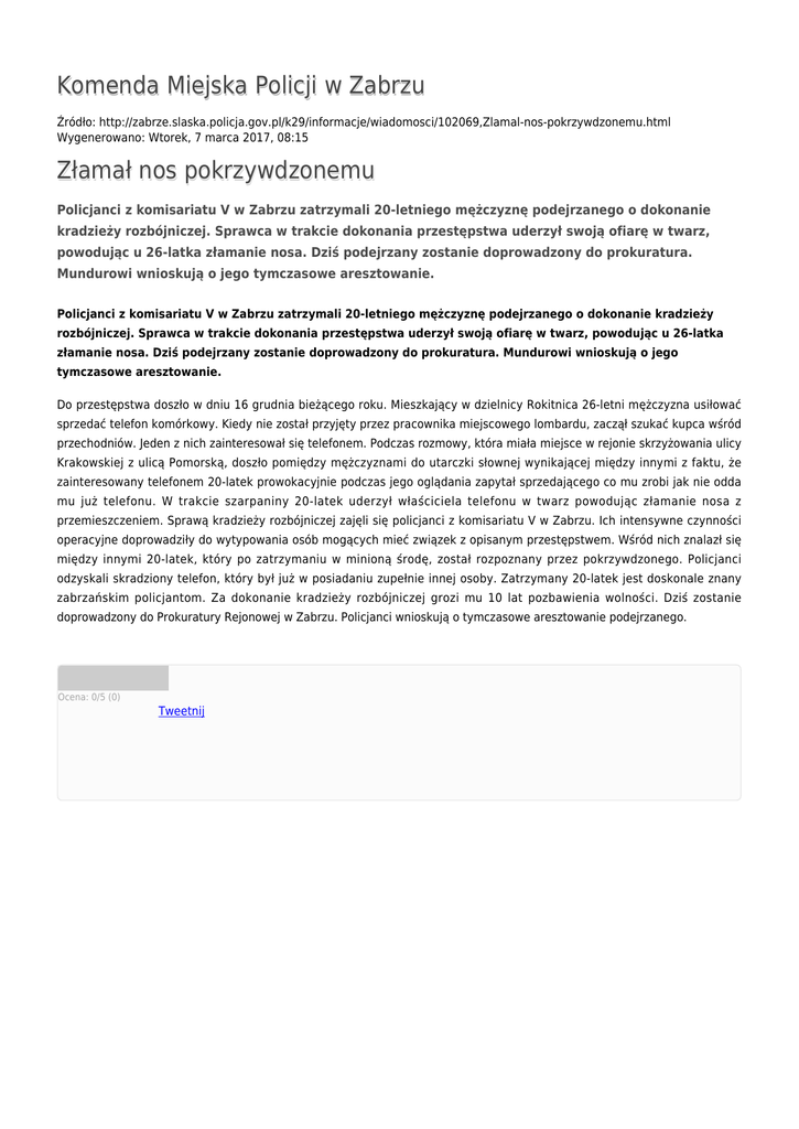 Komenda Miejska Policji w Zabrzu Źródło: http://zabrze.slaska.policja.gov.pl/k29/informacje/wiadomosci/102069,Zlamal-nos-pokrzywdzonemu.html Wygenerowano: Wtorek, 7 marca 2017, 08:15 Złamał nos pokrzywdzonemu Policjanci z komisariatu V w Zabrzu zatrzymali 20-letniego mężczyznę podejrzanego o dokonanie kradzieży rozbójniczej. Sprawca w trakcie dokonania przestępstwa uderzył swoją ofiarę w twarz, powodując u 26-latka złamanie nosa. Dziś podejrzany zostanie doprowadzony do prokuratura. Mundurowi wnioskują o jego tymczasowe aresztowanie. Policjanci z komisariatu V w Zabrzu zatrzymali 20-letniego mężczyznę podejrzanego o dokonanie kradzieży rozbójniczej. Sprawca w trakcie dokonania przestępstwa uderzył swoją ofiarę w twarz, powodując u 26-latka złamanie nosa. Dziś podejrzany zostanie doprowadzony do prokuratura. Mundurowi wnioskują o jego tymczasowe aresztowanie. Do przestępstwa doszło w dniu 16 grudnia bieżącego roku. Mieszkający w dzielnicy Rokitnica 26-letni mężczyzna usiłować sprzedać telefon komórkowy. Kiedy nie został przyjęty przez pracownika miejscowego lombardu, zaczął szukać kupca wśród przechodniów. Jeden z nich zainteresował się telefonem. Podczas rozmowy, która miała miejsce w rejonie skrzyżowania ulicy Krakowskiej z ulicą Pomorską, doszło pomiędzy mężczyznami do utarczki słownej wynikającej między innymi z faktu, że zainteresowany telefonem 20-latek prowokacyjnie podczas jego oglądania zapytał sprzedającego co mu zrobi jak nie odda mu już telefonu. W trakcie szarpaniny 20-latek uderzył właściciela telefonu w twarz powodując złamanie nosa z przemieszczeniem. Sprawą kradzieży rozbójniczej zajęli się policjanci z komisariatu V w Zabrzu. Ich intensywne czynności operacyjne doprowadziły do wytypowania osób mogących mieć związek z opisanym przestępstwem. Wśród nich znalazł się między innymi 20-latek, który po zatrzymaniu w minioną środę, został rozpoznany przez pokrzywdzonego. Policjanci odzyskali skradziony telefon, który był już w posiadaniu zupełnie innej osoby. Zatrzymany 20-latek jest doskonale znany zabrzańskim policjantom. Za dokonanie kradzieży rozbójniczej grozi mu 10 lat pozbawienia wolności. Dziś zostanie doprowadzony do Prokuratury Rejonowej w Zabrzu. Policjanci wnioskują o tymczasowe aresztowanie podejrzanego. Ocena: 0/5 (0) Tweetnij