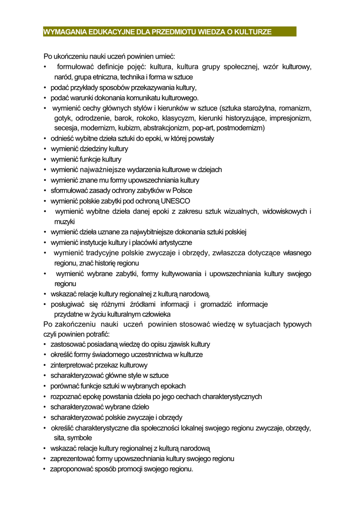 WYMAGANIA EDUKACYJNE DLA PRZEDMIOTU WIEDZA O KULTURZE Po ukończeniu nauki uczeń powinien umieć: • formułować definicje pojęć: kultura, kultura grupy społecznej, wzór kulturowy, naród, grupa etniczna, technika i forma w sztuce • podać przykłady sposobów przekazywania kultury, • podać warunki dokonania komunikatu kulturowego. • wymienić cechy głównych stylów i kierunków w sztuce (sztuka starożytna, romanizm, gotyk, odrodzenie, barok, rokoko, klasycyzm, kierunki historyzujące, impresjonizm, secesja, modernizm, kubizm, abstrakcjonizm, pop-art, postmodernizm) • odnieść wybitne dzieła sztuki do epoki, w której powstały • wymienić dziedziny kultury • wymienić funkcje kultury • wymienić najważniejsze wydarzenia kulturowe w dziejach • wymienić znane mu formy upowszechniania kultury • sformułować zasady ochrony zabytków w Polsce • wymienić polskie zabytki pod ochroną UNESCO • wymienić wybitne dzieła danej epoki z zakresu sztuk wizualnych, widowiskowych i muzyki • wymienić dzieła uznane za najwybitniejsze dokonania sztuki polskiej • wymienić instytucje kultury i placówki artystyczne • wymienić tradycyjne polskie zwyczaje i obrzędy, zwłaszcza dotyczące własnego regionu, znać historię regionu • wymienić wybrane zabytki, formy kultywowania i upowszechniania kultury swojego regionu • wskazać relacje kultury regionalnej z kulturą narodową. • posługiwać się różnymi źródłami informacji i gromadzić informacje przydatne w życiu kulturalnym człowieka Po zakończeniu nauki uczeń powinien stosować wiedzę w sytuacjach typowych czyli powinien potrafić: • zastosować posiadaną wiedzę do opisu zjawisk kultury • określić formy świadomego uczestnnictwa w kulturze • zinterpretować przekaz kulturowy • scharakteryzować główne style w sztuce • porównać funkcje sztuki w wybranych epokach • rozpoznać epokę powstania dzieła po jego cechach charakterystycznych • scharakteryzować wybrane dzieło • scharakteryzować polskie zwyczaje i obrzędy • określić charakterystyczne dla społeczności lokalnej swojego regionu zwyczaje, obrzędy, sita, symbole • wskazać relacje kultury regionalnej z kulturą narodową • zaprezentować formy upowszechniania kultury swojego regionu • zaproponować sposób promocji swojego regionu. KRYTERIA OCENIANIA: NIEDOSTATECZNY- duże luki w wiadomościach, brak stosowania terminologii specjalistycznej i niezrozumienie tej terminologii. Uczeń nie przygotowuje się do lekcji, jest bierny i nawet przy pomocy nauczyciela nie potrafi wykonać prostych zadań. DOPUSZCZAJĄCY- pojedyncze elementy wiedzy ucznia dobrane chaotycznie i przypadkowo, niestosownie terminologii specjalistycznej; treść wypowiedzi uboga, odbiega od tematu; nieużywanie argumentów. Uczeń jest bierny na lekcji, ale przy pomocy nauczyciela umie wykonać proste zadania. DOSTATECZNY - połowa wiadomości wykorzystana w odpowiedzi, fragmentaryczne wykorzystanie terminologii, treść właściwa lecz brak rzeczowych argumentów. Uczeń nie łączy wydarzeń i pojęć w logiczne ciągi przyczynowo-skutkowe, sporadycznie jest aktywny na lekcji. DOBRY - braki w zakresie wyczerpania tematu, niewłaściwe stosowanie niektórych pojęć, bogata treść zgodna z tematem lecz bez dodatkowej argumentacji. Uczeń poprawnie rozwiązuje zadania o przeciętnym stopniu trudności, jest aktywny na lekcjach. BARDZO BARDZO DOBRY - pełna zgodność wypowiedzi z tematem, właściwe stosowanie terminów, bogate treści, przekonujące argumenty. Uczeń wykorzystuje różne źródła wiedzy, potrafi skorelować ją z wiedzą z innych przedmiotów. Chętnie wykonuje dodatkowe zadania. CELUJĄCY - wiadomości i umiejętności ucznia przekraczają program szkolny, jego zasób wiedzy i umiejętności świadczy o sprecyzowanych uzdolnieniach humanistycznych. Uczeń uczestniczy w konkursach, bierze udział w wydarzeniach kulturalnych, sam podejmuje działalność artystyczną. Warunkiem sklasyfikowania ucznia jest jego obecność na ponad połowie odbytych lekcji DOSTOSOWANIE WYMAGAŃ EDUKACYJNYCH DLA UCZNIÓW Z DYSFUNKCJAMI: Ocena obejmuje wysiłek wkładany w wykonanie zadania, w głównej mierze powinna ona dotyczyć poprawności wypowiedzi ustnych oraz strony merytorycznej prac pisemnych. Prace pisemne należy oceniać pod kątem wiedzy, treści i formy, błędy ortograficzno-specyficzne oraz niski grafizm pisma nie powinny dyskwalifikować pracy ucznia. W razie konieczności należy wydłużyć limit czasu przeznaczony na pisanie sprawdzianu. W szczególnych przypadkach można zastąpić sprawdzian pisemny odpowiedzią ustną. W przypadku zaburzeń strony graficznej pisma uczeń może oddawać zadania domowe w formie drukowanej. Jeżeli nauczyciel nie może odczytać pracy pisemnej ucznia, uczeń powinien odczytać ją na głos w obecności nauczyciela. Uczniowie z dysfunkcjami mają prawo dokończyć prace rysunkowe w domu. FORMY SPRAWDZANIA OSIĄGNIĘĆ: Ocenie podlegają:. - prace pisemne (kontrolne) klasowe - zapowiedziane minimum tydzień przed terminem - zadania domowe dotyczące aktualnie omawianych tematów - recenzje wydarzenia kulturalnego (jedna w semestrze) j staranność i oryginalność prowadzenia zeszytu przedmiotowego - dodatkowe prace ucznia związane z jego działalnością artystyczną - ustne wypowiedzi i aktywność podczas lekcji