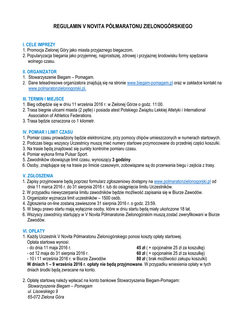 REGULAMIN V NOVITA PÓŁMARATONU ZIELONOGÓRSKIEGO I. CELE IMPREZY 1. Promocja Zielonej Góry jako miasta przyjaznego biegaczom. 2. Popularyzacja biegania jako przyjemnej, najprostszej, zdrowej i przyjaznej środowisku formy spędzania wolnego czasu. II. ORGANIZATOR 1. Stowarzyszenie Biegam – Pomagam. 2. Dane teleadresowe organizatora znajdują się na stronie www.biegam-pomagam.pl oraz w zakładce kontakt na www.polmaratonzielonogorski.pl. III. TERMIN I MIEJSCE 1. Bieg odbędzie się w dniu 11 września 2016 r. w Zielonej Górze o godz. 11:00. 2. Trasa biegnie ulicami miasta (2 pętle) i posiada atest Polskiego Związku Lekkiej Atletyki i International Association of Athletics Federations. 3. Trasa będzie oznaczona co 1 kilometr. IV. POMIAR I LIMIT CZASU 1. Pomiar czasu prowadzony będzie elektroniczne, przy pomocy chipów umieszczonych w numerach startowych. 2. Podczas biegu wszyscy Uczestnicy muszą mieć numery startowe przymocowane do przedniej części koszulki. 3. Na trasie będą znajdować się punkty kontrolne pomiaru czasu. 4. Pomiar wykona firma Pulsar Sport. 5. Zawodników obowiązuje limit czasu, wynoszący 3 godziny. 6. Osoby, znajdujące się na trasie po limicie czasowym, zobowiązane są do przerwania biegu i zejścia z trasy. V. ZGŁOSZENIA 1. Zapisy przyjmowane będą poprzez formularz zgłoszeniowy dostępny na www.polmaratonzielonogorski.pl od dnia 11 marca 2016 r. do 31 sierpnia 2016 r. lub do osiągnięcia limitu Uczestników. 2. W przypadku niewyczerpania limitu zawodników będzie możliwość zapisania się w Biurze Zawodów. 3. Organizator wyznacza limit uczestników – 1500 osób. 4. Zgłoszenia on-line zostaną zawieszone 31 sierpnia 2016 r. o godz. 23:59. 5. W biegu prawo startu mają wyłącznie osoby, które w dniu startu będą miały ukończone 18 lat. 6. Wszyscy zawodnicy startujący w V Novita Półmaratonie Zielonogórskim muszą zostać zweryfikowani w Biurze Zawodów. VI. OPŁATY 1. Każdy Uczestnik V Novita Półmaratonu Zielonogórskiego ponosi koszty opłaty startowej. Opłata startowa wynosi: - do dnia 11 maja 2016 r. 45 zł ( + opcjonalnie 25 zł za koszulkę) - od 12 maja do 31 sierpnia 2016 r. 60 zł ( + opcjonalnie 25 zł za koszulkę) - 10 i 11 września 2016 r. w Biurze Zawodów 80 zł ( brak możliwości zakupu koszulki) W dniach 1 – 9 września 2016 r. opłaty nie będą przyjmowane. W przypadku wniesienia opłaty w tych dniach środki będą zwracane na konto. 2. Opłatę startową należy wpłacać na konto bankowe Stowarzyszenia Biegam-Pomagam: Stowarzyszenie Biegam – Pomagam ul. Lisowskiego 9 65-072 Zielona Góra mBank 72 1140 2004 0000 3902 7557 8924 z dopiskiem "opłata startowa, imię i nazwisko Uczestnika" 3. Dowodem wpłynięcia opłaty jest pojawienie się informacji o wpłacie przy nazwisku Uczestnika na stronie zapisów. 4. Organizator nie odpowiada za zaginięcie zgłoszenia oraz przekazu pocztowego lub przelewu bankowego z winy poczty lub banku. 5. Opłata raz uiszczona nie podlega zwrotowi. Organizator dopuszcza możliwość przepisania opłaty startowej na innego zawodnika po wcześniejszym ustaleniu i za zgodą kierownika Biura Zawodów. VII. KLASYFIKACJE I NAGRODY Podczas V Novita Półmaratonu Zielonogórskiego uczestnicy zostaną sklasyfikowani w następujących kategoriach: 1. Klasyfikacja generalna mężczyzn i kobiet, 2. Kategorie wiekowe kobiet: K-20, K-30, K-40, K-50, K-60 + 3. Kategorie wiekowe mężczyzn: M-20, M-30, M-40, M-50, M-60, M-70 + 4. Wszyscy Uczestnicy, którzy ukończą bieg w limicie czasowym, otrzymają na mecie pamiątkowy medal. 5. Zdobywcy miejsc I – III w klasyfikacji generalnej kobiet i mężczyzn oraz zdobywcy miejsc I – III w kategoriach wiekowych otrzymają nagrody od Organizatora. 6. W ramach V Półmaratonu Zielonogórskiego prowadzona będzie odrębna klasyfikacja II Mistrzostw Polski Fizjoterapeutów i Masażystów w Półmaratonie oraz Mistrzostwa Wojska Polskiego w Półmaratonie. 7. Zawodnicy, którzy ukończą bieg z limicie czasu zostaną sklasyfikowani również w Lubuskiej Lidze Biegowej. VIII. ŚWIADCZENIA 1. Uczestnicy otrzymują pakiety startowe w ramach których otrzymują: numer startowy z chipem do pomiaru czasu, posiłek regeneracyjny na mecie, niespodzianki od partnerów biegu. 2. W przypadku zamówienia koszulki technicznej z logo biegu należy odznaczyć specjalne pole w formularzu zgłoszeniowym oraz doliczyć do opłaty startowej kwotę 25 zł. Rozmiar Obwód w biuście Tabela rozmiarów – koszulka damska XS S M 76-78 80-82 84-86 L XL XXL 88-90 92-94 96-98 Tabela rozmiarów – koszulka męska Rozmiar XS S M L XL XXL Obwód w klatce piersiowej 86-88 90-92 94-96 98-100 104-106 108-110 UWAGA! Pełny pakiet startowy będzie gwarantowany TYLKO i WYŁĄCZNIE dla Uczestników, którzy zapiszą się drogą elektroniczną i uiszczą opłatę startową do dnia 31 sierpnia 2016 r. 3. Punkty nawadniania, zaopatrzone w napój izotoniczny i wodę, będą rozmieszczone co ok. 4 km. 4. Depozyty ubraniowe: - Uczestnicy mają możliwość zdeponowania rzeczy w specjalnie wyznaczonym miejscu. - zainteresowani zdeponowaniem rzeczy mogą w punkcie depozytu złożyć swoje rzeczy w torbie/worku/plecaku uniemożliwiającym rozczłonkowanie rzeczy. Możliwość odbioru depozytu będzie możliwa tylko po okazaniu numeru startowego. - w przypadku zgubienia przez Uczestnika numeru startowego, Organizator jest zwolniony z odpowiedzialności za pobranie depozytu przez inną osobę. Uwaga! Organizator nie ponosi odpowiedzialności za przedmioty wartościowe pozostawione w depozycie. 5. Przed i po biegu Uczestnicy będą mieli możliwość skorzystania z przebieralni oraz pryszniców zlokalizowanych w Hali Sportowej Zespołu Szkół Sportowych przy ul. Wazów 76 w Zielonej Górze. 6. Organizator zapewnia opiekę medyczną na trasie biegu i na mecie. Decyzje personelu medycznego dotyczące kontynuowania biegu podczas Półmaratonu są ostateczne i nieodwołalne. IX. BIURO ZAWODÓW 1