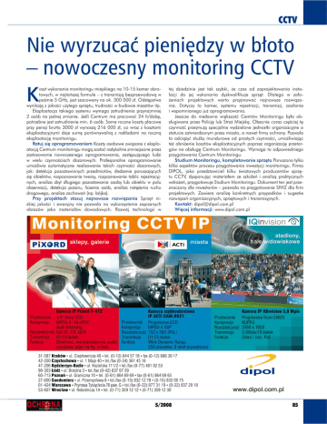CCTV Nie wyrzucać pieniędzy w błoto – nowoczesny monitoring CCTV K oszt wykonania monitoringu miejskiego na 10-15 kamer obrotowych, w najtańszej formule – z transmisją bezprzewodową w paśmie 5 GHz, jest szacowany na ok. 300 000 zł. Odstępstwa wynikają z jakości użytego sprzętu, trudności w budowie masztów itp. Eksploatacja takiego systemu wymaga zatrudnienia przynajmniej 2 osób na jednej zmianie. Jeśli Centrum ma pracować 24 h/dobę, potrzebne jest zatrudnienie min. 6 osób. Same roczne koszty płacowe przy pensji brutto 3000 zł wynoszą 216 000 zł, co wraz z kosztami eksploatacyjnymi daje sumę porównywalną z nakładami na roczną eksploatację monitoringu. Ratuj się oprogramowaniem Koszty osobowe związane z eksploatacją Centrum monitoringu mogą zostać radykalnie zmniejszone przez zastosowanie nowoczesnego oprogramowania, zastępującego ludzi w wielu czynnościach dozorowych. Profesjonalne oprogramowanie umożliwia automatyczne realizowanie takich czynności dozorowych, jak: detekcja pozostawionych przedmiotów, śledzenie poruszających się obiektów, rozpoznawanie twarzy, rozpoznawanie tablic rejestracyjnych, analiza zbyt długiego pozostawania osoby lub obiektu w polu obserwacji, detekcja pożaru, liczenie osób, analiza natężenia ruchu drogowego, analiza zachowań (np. bójka). Przy projektach stosuj najnowsze rozwiązania Sprzęt niskiej jakości i awaryjny nie pozwala na wykorzystanie zapisanych obrazów jako materiałów dowodowych. Rozwój technologii w tej dziedzinie jest tak szybki, że czas od zaprojektowania instalacji do jej wykonania dyskwalifikuje sprzęt. Dlatego w założeniach projektowych warto przyjmować najnowsze rozwiązania. Dotyczy to kamer, systemu rejestracji, transmisji, zasilania i wspomnianego już oprogramowania. Jeszcze do niedawna większość Centrów Monitoringu była obsługiwana przez Policję lub Straż Miejską. Obecnie coraz częściej tę czynność przejmują specjalnie wydzielone jednostki organizacyjne o statucie zatwierdzonym przez miasto, a nawet firmy ochrony. Pozwala to odciążyć służby mundurowe od prostych czynności, umożliwiając też obniżenie kosztów eksploatacyjnych poprzez organizację przetargów na obsługę Centrum Monitoringu. Wymaga to odpowiedniego przygotowania Centrum Monitoringu. Studium Monitoringu, kompletowanie sprzętu Poruszono tylko kilka aspektów procesu przygotowania inwestycji monitoringu. Firma DIPOL, jako przedstawiciel kilku światowych producentów sprzętu CCTV, dysponując materiałem ze szkoleń i analizą praktycznych wdrożeń, przygotowuje Studium Monitoringu. Dokument ten jest przeznaczony dla inwestorów – pozwala na przygotowanie SIWZ dla firm projektowych. Zawiera analizę konkretnych przypadków i sugestie rozwiązań organizacyjnych, sprzętowych i transmisyjnych. Kontakt: [email protected] Więcej informacji: www.dipol.com.pl 31-587 Kraków • ul. Ciepłownicza 40 • tel. (0-12) 644 57 18 • fax (0-12) 686 30 17 42-200 Częstochowa • ul. 1 Maja 40 • tel./fax (0-34) 361 45 16 47-206 Kędzierzyn-Koźle • ul. Kozielska 111/2 • tel./fax (0-77) 481 02 53 90-303 Łódź • ul. Brzeźna 3 • tel./fax (0-42) 637 07 59 60-713 Poznań • ul. Graniczna 10 • tel. (0-61) 864 69 69 • fax (0-61) 864 69 65 27-600 Sandomierz • ul. Przemysłowa 8 • tel./fax (0-15) 832 12 78 • (0-15) 832 00 75 01-424 Warszawa • Prymasa Tysiąclecia 76 paw. G • tel./fax (0-22) 877 31 19 • (0-22) 837 29 18 53-607 Wrocław • ul. Robotnicza 1A • tel. (0-71) 359 12 12 • (0-71) 359 12 30 5/2008 www.dipol.com.pl 85