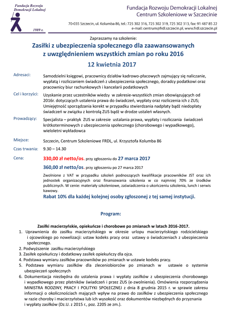 Zapraszamy na szkolenie: Zasiłki z ubezpieczenia społecznego dla zaawansowanych z uwzględnieniem wszystkich zmian po roku 2016 12 kwietnia 2017 Adresaci: Samodzielni księgowi, pracownicy działów kadrowo-płacowych zajmujący się naliczanie, wypłatą i rozliczaniem świadczeń z ubezpieczenia społecznego, doradcy podatkowi oraz pracownicy biur rachunkowych i kancelarii podatkowych Cel i korzyści: Uzyskanie przez uczestników wiedzy w zakresie-wszystkich zmian obowiązujących od 2016r. dotyczących ustalenia prawa do świadczeń, wypłaty oraz rozliczenia ich z ZUS; Umiejętność sporządzania korekt w przypadku stwierdzania nadpłaty bądź niedopłaty świadczeń w związku z kontrolą ZUS bądź w drodze ustaleń własnych. Prowadzący: Specjalista – praktyk ZUS w zakresie ustalania prawa, wypłaty i rozliczania świadczeń krótkoterminowych z ubezpieczenia społecznego (chorobowego i wypadkowego), wieloletni wykładowca Miejsce: Szczecin, Centrum Szkoleniowe FRDL, ul. Krzysztofa Kolumba 86 Czas trwania: 9.30 – 14.30 Cena: 330,00 zł netto/os. przy zgłoszeniu do 27 marca 2017 360,00 zł netto/os. przy zgłoszeniu po 27 marca 2017 Zwolnione z VAT w przypadku szkoleń podnoszących kwalifikacje pracowników JST oraz ich jednostek organizacyjnych oraz finansowania szkolenia w co najmniej 70% ze środków publicznych. W cenie: materiały szkoleniowe, zaświadczenia o ukończeniu szkolenia, lunch i serwis kawowy. Rabat 10% dla każdej kolejnej osoby zgłoszonej z tej samej instytucji. Program: Zasiłki macierzyńskie, opiekuńcze i chorobowe po zmianach w latach 2016-2017. 1. Uprawnienia do zasiłku macierzyńskiego w okresie urlopu macierzyńskiego rodzicielskiego i ojcowskiego po nowelizacji: ustaw kodeks pracy oraz ustawy o świadczeniach z ubezpieczenia społecznego. 2. Podwyższenie zasiłku macierzyńskiego 3. Zasiłek opiekuńczy i dodatkowy zasiłek opiekuńczy dla ojca. 4. Podstawa wymiaru zasiłków pracowników po zmianach w ustawie kodeks pracy. 5. Podstawa wymiaru zasiłków dla zleceniobiorców po zmianach w ustawie o systemie ubezpieczeń społecznych 6. Dokumentacja niezbędna do ustalenia prawa i wypłaty zasiłków z ubezpieczenia chorobowego i wypadkowego przez płatników świadczeń i przez ZUS (e-zwolnienia). Omówienia rozporządzenia MINISTRA RODZINY, PRACY I POLITYKI SPOŁECZNEJ z dnia 8 grudnia 2015 r. w sprawie zakresu informacji o okolicznościach mających wpływ na prawo do zasiłków z ubezpieczenia społecznego w razie choroby i macierzyństwa lub ich wysokość oraz dokumentów niezbędnych do przyznania i wypłaty zasiłków (Dz.U. z 2015 r., poz. 2205 ze zm.). 7. Rozliczanie zasiłków z ZUS oraz sporządzanie korekt w przypadku stwierdzenia nadpłaty bądź niedopłaty świadczeń w drodze kontroli ZUS bądź w drodze ustaleń własnych. 8. Zwrot nienależnie pobranych świadczeń. 9. Egzekucja i potrącenia z zasiłków 10. Pytania i odpowiedzi
