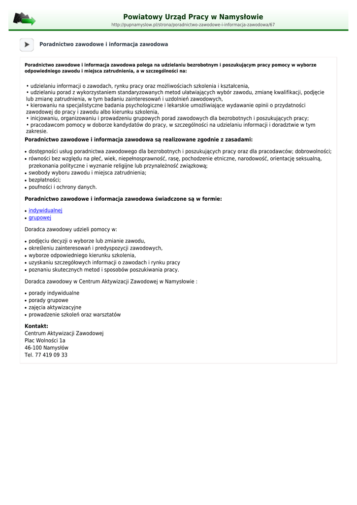 Powiatowy Urząd Pracy w Namysłowie http://pupnamyslow.pl/strona/poradnictwo-zawodowe-i-informacja-zawodowa/67 Poradnictwo zawodowe i informacja zawodowa Poradnictwo zawodowe i informacja zawodowa polega na udzielaniu bezrobotnym i poszukującym pracy pomocy w wyborze odpowiedniego zawodu i miejsca zatrudnienia, a w szczególności na: • udzielaniu informacji o zawodach, rynku pracy oraz możliwościach szkolenia i kształcenia, • udzielaniu porad z wykorzystaniem standaryzowanych metod ułatwiających wybór zawodu, zmianę kwalifikacji, podjęcie lub zmianę zatrudnienia, w tym badaniu zainteresowań i uzdolnień zawodowych, • kierowaniu na specjalistyczne badania psychologiczne i lekarskie umożliwiające wydawanie opinii o przydatności zawodowej do pracy i zawodu albo kierunku szkolenia, • inicjowaniu, organizowaniu i prowadzeniu grupowych porad zawodowych dla bezrobotnych i poszukujących pracy; • pracodawcom pomocy w doborze kandydatów do pracy, w szczególności na udzielaniu informacji i doradztwie w tym zakresie. Poradnictwo zawodowe i informacja zawodowa są realizowane zgodnie z zasadami: ● ● ● ● ● dostępności usług poradnictwa zawodowego dla bezrobotnych i poszukujących pracy oraz dla pracodawców; dobrowolności; równości bez względu na płeć, wiek, niepełnosprawność, rasę, pochodzenie etniczne, narodowość, orientację seksualną, przekonania polityczne i wyznanie religijne lub przynależność związkową; swobody wyboru zawodu i miejsca zatrudnienia; bezpłatności; poufności i ochrony danych. Poradnictwo zawodowe i informacja zawodowa świadczone są w formie: ● ● indywidualnej grupowej Doradca zawodowy udzieli pomocy w: ● ● ● ● ● podjęciu decyzji o wyborze lub zmianie zawodu, określeniu zainteresowań i predyspozycji zawodowych, wyborze odpowiedniego kierunku szkolenia, uzyskaniu szczegółowych informacji o zawodach i rynku pracy poznaniu skutecznych metod i sposobów poszukiwania pracy. Doradca zawodowy w Centrum Aktywizacji Zawodowej w Namysłowie : ● ● ● ● porady indywidualne porady grupowe zajęcia aktywizacyjne prowadzenie szkoleń oraz warsztatów Kontakt: Centrum Aktywizacji Zawodowej Plac Wolności 1a 46-100 Namysłów Tel. 77 419 09 33