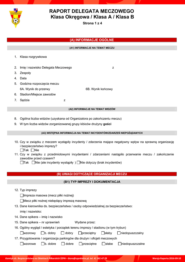 RAPORT DELEGATA MECZOWEGO Klasa Okręgowa / Klasa A / Klasa B Strona 1 z 4 (A) INFORMACJE OGÓLNE (A1) INFORMACJE NA TEMAT MECZU 1. Klasa rozgrywkowa 2. Imię i nazwisko Delegata Meczowego z 3. Zespoły 4. Data 5. Godzina rozpoczęcia meczu 6B. Wynik końcowy 6A. Wynik do przerwy 6. Stadion/Miejsce zawodów 7. Sędzia z (A2) INFORMACJE NA TEMAT WIDZÓW 8. Ogólna liczba widzów (uzyskana od Organizatora po zakończeniu meczu) 9. W tym liczba widzów zorganizowanej grupy kibiców drużyny gości (A3) WSTĘPNA INFORMACJA NA TEMAT INCYDENTÓW/ZDARZEŃ NIEPOŻĄDANYCH 10. Czy w związku z meczem wystąpiły incydenty / zdarzenia mające negatywny wpływ na sprawną organizację i bezpieczeństwo imprezy? Tak Nie 11. Czy w związku z przedmiotowymi incydentami / zdarzeniami nastąpiło przerwanie meczu / zakończenie zawodów przed czasem? Tak Nie (ale incydenty wystąpiły ) Nie dotyczy (brak incydentów) (B) UWAGI DOTYCZĄCE ORGANIZACJI MECZU (B1) TYP IMPREZY I DOKUMENTACJA 12. Typ imprezy Impreza masowa (mecz piłki nożnej) Mecz piłki nożnej niebędący imprezą masową 13. Dane kierownika ds. bezpieczeństwa / osoby odpowiedzialnej za bezpieczeństwo: imię i nazwisko: 14. Dane spikera – imię i nazwisko 15. Dane spikera – nr uprawnień Wydane przez: 16. Ogólny wygląd / estetyka / porządek terenu imprezy / stadionu (w tym trybun) wzorowy b. dobry dobry przeciętny słaby niedopuszczalny 17. Przygotowanie / organizacja parkingów dla drużyn i oficjeli meczowych wzorowe b. dobre dobre przeciętne słabe Komisja ds. Bezpieczeństwa na Obiektach Piłkarskich ŚZPN – [email protected], tel. 41 361 47 29 niedopuszczalne Wersja Raportu:2016-09-10 RAPORT DELEGATA MECZOWEGO Klasa Okręgowa / Klasa A / Klasa B Strona 2 z 4 18. Łączna liczba udostępnionych wejść dla kibiców: 19. Łączna liczba udostępnionych - Regulaminów meczu niebędącego imprezą masową: (B3) ORGANIZACJA / OBSŁUGA IMPREZY 20. Czystość siedzisk dla kibiców drużyny gospodarzy nie dotyczy tak, czyste/uprzątnięte nie, brudne 21. Czystość siedzisk dla kibiców drużyny gości nie dotyczy tak , czyste/uprzątnięte nie, brudne 22. Warunki pracy przedstawicieli mediów wzorowe b. dobre przeciętne dobre słabe niedopuszczalne (C) ZINTEGROWANE PODEJŚCIE DO BEZPIECZEŃSTWA I ZABEZPIECZENIA IMPREZY PRZEZ ORGANIZATORA, POLICJĘ ORAZ INNE PODMIOTY (C1) ORGANIZATOR / STEWARDZI 23. Ogólna ocena pracy kierownika ds. bezpieczeństwa / osoby odpowiedzialnej za bezpieczeństwo: wzorowa b. dobra przeciętna dobra słaba niedopuszczalna 24. Ogólna ocena pracy spikera (obecność podczas odpraw, bezstronność, treść i forma komunikatów itp.): wzorowa b. dobra przeciętna dobra słaba niedopuszczalna 25. Łączna liczba stewardów (członków służby informacyjnej, porządkowej, klubowej) 26. Noszowi – liczba, miejsce, ubiór, sposób wykonywania pracy, czy dostępni od chwili rozpoczęcia rozgrzewki: (C2) POLICJA ORAZ POZOSTAŁE SŁUŻBY 27. Liczba funkcjonariuszy Policji biorących udział w zabezpieczeniu meczu 28. Ocena pracy służb medycznych wzorowa b. dobra przeciętna dobra słaba niedopuszczalna (D) PRZEBIEG IMPREZY (D1) ORGANIZACJA PRZYJMOWANIA NA STADION KIBICÓW DRUŻYNY GOŚCI 29. Liczba stewardów Organizatora meczu obsługujących wejście kibiców drużyny gości na stadion 30. Organizacja wejścia na stadion (bramy, kanały wejściowe, furtki, kołowrotki) dla kibiców drużyny gości nie dotyczy wzorowa b. dobra dobra przeciętna Komisja ds. Bezpieczeństwa na Obiektach Piłkarskich ŚZPN – [email protected], tel. 41 361 47 29 słaba niedopuszczalna Wersja Raportu:2016-09-10 RAPORT DELEGATA MECZOWEGO Klasa Okręgowa / Klasa A / Klasa B Strona 3 z 4 (D2) ZACHOWANIE PRZEDSTAWICIELI DRUŻYN PIŁKARSKICH 31. Opis ewentualnych incydentów / zdarzeń niepożądanych dotyczących przedstawicieli (dotyczy członków drużyn i innych osób funkcyjnych ze wskazaniem, którego klubu dotyczy) klubów (D3) ZACHOWANIE PUBLICZNOŚCI 32. Zachowanie się publiczności (gospodarze) – ogólna ocena nie dotyczy wzorowe b. dobre dobre przeciętne słabe niedopuszczalne przeciętne słabe niedopuszczalne 33. Zachowanie się publiczności (goście) – ogólna ocena nie dotyczy wzorowe b. dobre dobre (D4) INCYDENTY / ZDARZENIA NIEPOŻĄDANE W TRAKCIE MECZU 34. Użycie środków pirotechnicznych NIE DOTYCZY TAK – tylko gospodarze TAK – tylko goście TAK – gospodarze i goście TAK – tylko gospodarze TAK – tylko goście TAK – gospodarze i goście TAK – tylko goście TAK – gospodarze i goście 35. Rzucanie przedmiotami NIE DOTYCZY 36. Wtargnięcie na płytę boiska NIE DOTYCZY TAK – tylko gospodarze 37. Zamieszki na stadionie (np. udział kibiców w bójkach pomiędzy sobą / z Policją / ze stewardami) NIE DOTYCZY TAK – tylko gospodarze TAK – tylko goście TAK – gospodarze i goście 38. Atak na zawodnika / sędziego / innego oficjela przez publiczność (kto atakował?) NIE DOTYCZY TAK – tylko gospodarze TAK – tylko goście TAK – gospodarze i goście TAK – tylko goście TAK – gospodarze i goście 39. Wandalizm / destrukcja obiektu (kto niszczył?) NIE DOTYCZY TAK – tylko gospodarze 40. Protesty, demonstracje (np. hasła, okrzyki polityczne – kto wznosił?) NIE DOTYCZY TAK – tylko gospodarze TAK – tylko goście TAK – gospodarze i goście 41. Zachowania rasistowskie / antysemickie / ksenofobiczne NIE DOTYCZY TAK – tylko gospodarze TAK – tylko goście TAK – gospodarze i goście 42. Wulgarne / wrogie okrzyki (np. wobec sędziów / przeciwnych klubów itp.) NIE DOTYCZY TAK – tylko gospodarze TAK – tylko goście Komisja ds. Bezpieczeństwa na Obiektach Piłkarskich ŚZPN – [email protected], tel. 41 361 47 29 TAK – gospodarze i goście Wersja Raportu:2016-09-10 RAPORT DELEGATA MECZOWEGO Klasa Okręgowa / Klasa A / Klasa B Strona 4 z 4 (E) PODSUMOWANIE (E1) TREŚĆ REKOMENDACJI 43. Jakie rekomendacje / zalecenia / uwagi Delegat Meczowy przekazał Organizatorowi 