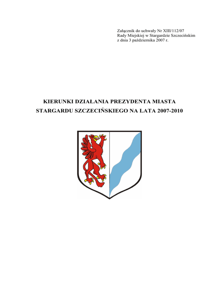 Załącznik do uchwały Nr XIII/112/07 Rady Miejskiej w Stargardzie Szczecińskim z dnia 3 października 2007 r. KIERUNKI DZIAŁANIA PREZYDENTA MIASTA STARGARDU SZCZECIŃSKIEGO NA LATA 2007-2010 SPIS STREŚCI: I. WSTĘP ……………….……………………………………………………………... 3 II. ZAŁOśENIA DOTYCZĄCE POLITYKI FINANSOWEJ MIASTA………………. 4 III. TWORZENIE WARUNKÓW DLA ROZWOJU GODPODARCZEGO MIASTA……………………………………………………………………………… 6 1. Działania w zakresie rozwoju gospodarczego w tym w ramach uatrakcyjniania terenów inwestycyjnych………………….…………………………………….… 6 2. Polepszenie infrastruktury drogowej ……………………………………………. 7 3. Działania w zakresie gospodarki przestrzennej………………………………….. 7 4. Działania w zakresie promocji Miasta…………………………………………… 9 IV. DZIAŁANIA ZMIERZAJĄCE DO WYKREOWANIA MIASTA STARGARDU SZCZECIŃSKIEGO JAKO REGIONALNEGO OŚRODKA KULTURY, OŚWIATY I SPORTU ………………………..…………………………………… 10 1. Działania w zakresie kultury, sportu i turystyki …..…………………………… 10 2. Działania w zakresie oświaty i wychowania …………………………………… 11 V. DZIAŁANIA ZMIERZAJĄCE DO POPRAWY WARUNKÓW śYCIA MIESZKAŃCÓW MIASTA …………………….……………………………..…… 12 1. Pomoc społeczna …………………………………………….…………….….… 12 2. Bezpieczeństwo i porządek publiczny …………………..….…………….…….. 13 3. Organizacje pozarządowe …………………………………..…………….…….. 13 4. Osoby niepełnosprawne ………………………………………….…….….….… 13 5. Ochrona zdrowia ……………………………………………………..…….….... 14 6. UzaleŜnienia i przemoc w rodzinie ……………………………………………... 14 7. Gospodarka lokalowa ………………………………………………..……….…. 15 8. Informatyzacja oraz usprawnienie funkcjonowania administracji samorządowej …………………………………………………………………… 15 9. Zadania z zakresu gospodarki komunalnej, ciepłowniczej i ochrony środowiska 16 VI. ZAKOŃCZENIE………………………………………………………….………..... 18 2 I. WSTĘP „Kierunki Działania Prezydenta Miasta Stargardu Szczecińskiego na lata 2007 – 2010” zawierają wykaz wniosków i tez, mających słuŜyć realizacji docelowej wizji Miasta. Stanowią wykaz zadań, których realizacja wynika ze „Strategii Rozwoju Społeczno – Gospodarczego Miasta” oraz innych dokumentów o znaczeniu strategicznym dla Miasta. Głównym zadaniem władz samorządowych jest stwarzanie warunków dla osiągnięcia trwałego, akceptowanego społecznie i bezpiecznego, szeroko rozumianego rozwoju Miasta. Identyfikacja w tym dokumencie najwaŜniejszych zjawisk funkcjonujących w kontekście społeczno-gospodarczym, pozwala na przedstawienie celów i zadań, których realizacja będzie słuŜyć wzmocnieniu klimatu gospodarczego i konkurencyjnej pozycji Miasta Stargardu Szczecińskiego. Na władzach samorządowych spoczywa odpowiedzialność zagwarantowania mieszkańcom odpowiedniej jakości warunków Ŝycia takich jak: zapewnienie dostępu do kształcenia, dostępu do dóbr kultury, aktywnego spędzania wolnego czasu, poprawy bezpieczeństwa publicznego. „Kierunki Działań Prezydenta Miasta Stargardu Szczecińskiego na lata 2007 – 2010” mają pomóc władzom samorządowym m.in. w jasnym i precyzyjnym formułowaniu celów i kierunków rozwoju społeczno-gospodarczego miasta, skoordynowaniu i uporządkowaniu działań oraz skutecznym planowaniu i zarządzaniu budŜetem. Środki, które prowadzą do harmonijnego rozwoju Miasta, to przede wszystkim zapewnienie sprawnego funkcjonowania Miasta, jako złoŜonego systemu uwzględniającego właściwą politykę gospodarczą, społeczną, oświatową, mieszkaniową i współgrającą z nimi gospodarką komunalną. Najistotniejsze z punktu widzenia władz miasta jest zapewnienie odpowiednich środków na utrzymanie bieŜącej infrastruktury miejskiej oraz na wydatki inwestycyjne. Realizacja kierunków działania powinna zapewnić trwały rozwój Miasta, a w perspektywie umoŜliwić jeszcze większy wzrost rangi Stargardu w skali regionu i kraju. Zaprezentowane poniŜej kierunki działania Prezydenta Miasta Stargardu Szczecińskiego stanowią jedynie podstawę do dalszych działań. Osiągnięcie zamierzonych celów moŜliwe będzie poprzez realizację określonych zadań w ramach wieloletniego planu inwestycyjnego oraz kolejnych budŜetów. 3 II. ZAŁOśENIA DOTYCZĄCE POLITYKI FINANSOWEJ MIASTA Cele polityki finansowej są sprzęŜone ze strategią rozwoju Miasta, generującej poszczególne źródła dochodów. Prowadzenie stabilnej polityki dochodowej, duŜa operatywność w pozyskiwaniu środków finansowych z funduszy unijnych i krajowych, wzrost poziomu wydatków inwestycyjnych to podstawowe cele polityki finansowej Miasta. Realizowana przez Miasto polityka w zakresie dochodów obejmuje pozycje, określone w ustawie o dochodach jednostek samorządu terytorialnego z 13 listopada 2003 r. (Dz. U. Nr 203, poz. 1966). Na wymienione w obecnie obowiązującej ustawie o dochodach jednostek samorządu terytorialnego dochody gmin, pochodzące z budŜetu państwa, przeznaczone na finansowanie zarówno zadań własnych, jak i zleconych – Miasto nie ma bezpośredniego wpływu, dlatego decydujące znaczenie mają dochody własne, w tym dochody czerpane z tytułu podatków i opłat, które w duŜym stopniu zaleŜą od polityki władz samorządowych. Miasto posiada moŜliwości kształtowania polityki w zakres