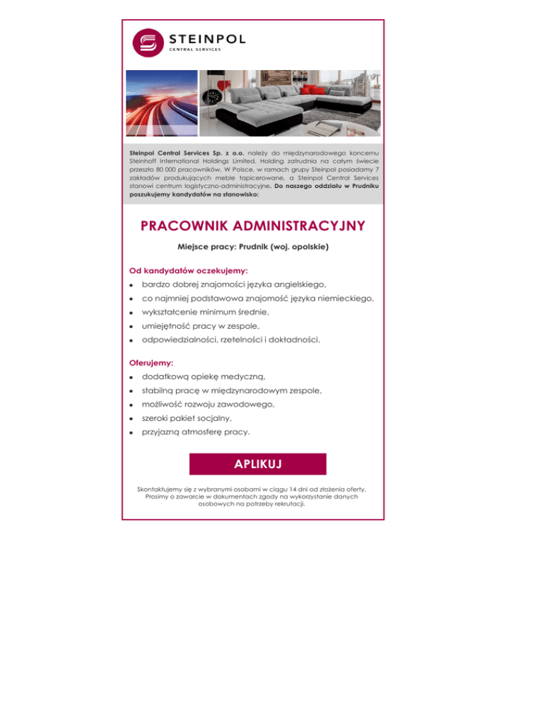 Steinpol Central Services Sp. z o.o. należy do międzynarodowego koncernu Steinhoff International Holdings Limited. Holding zatrudnia na całym świecie przeszło 80 000 pracowników. W Polsce, w ramach grupy Steinpol posiadamy 7 zakładów produkujących meble tapicerowane, a Steinpol Central Services stanowi centrum logistyczno-administracyjne. Do naszego oddziału w Prudniku poszukujemy kandydatów na stanowisko: PRACOWNIK ADMINISTRACYJNY Miejsce pracy: Prudnik (woj. opolskie) Od kandydatów oczekujemy: bardzo dobrej znajomości języka angielskiego, co najmniej podstawowa znajomość języka niemieckiego, wykształcenie minimum średnie, umiejętność pracy w zespole, odpowiedzialności, rzetelności i dokładności. Oferujemy: dodatkową opiekę medyczną, stabilną pracę w międzynarodowym zespole, możliwość rozwoju zawodowego, szeroki pakiet socjalny, przyjazną atmosferę pracy. APLIKUJ Skontaktujemy się z wybranymi osobami w ciągu 14 dni od złożenia oferty. Prosimy o zawarcie w dokumentach zgody na wykorzystanie danych osobowych na potrzeby rekrutacji.