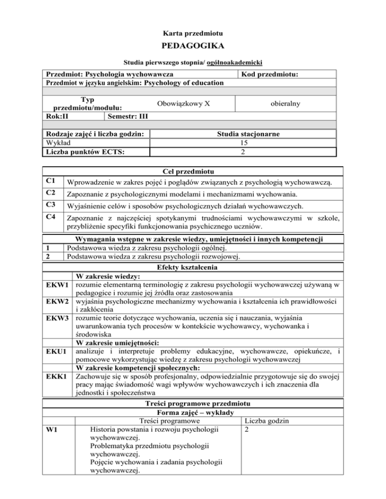 Karta przedmiotu PEDAGOGIKA Studia pierwszego stopnia/ ogólnoakademicki Przedmiot: Psychologia wychowawcza Przedmiot w języku angielskim: Psychology of education Typ przedmiotu/modułu: Rok:II Semestr: III Obowiązkowy X Rodzaje zajęć i liczba godzin: Wykład Liczba punktów ECTS: Kod przedmiotu: obieralny Studia stacjonarne 15 2 Cel przedmiotu C1 Wprowadzenie w zakres pojęć i poglądów związanych z psychologią wychowawczą. C2 Zapoznanie z psychologicznymi modelami i mechanizmami wychowania. C3 Wyjaśnienie celów i sposobów psychologicznych działań wychowawczych. C4 Zapoznanie z najczęściej spotykanymi trudnościami wychowawczymi w szkole, przybliżenie specyfiki funkcjonowania psychicznego uczniów. 1 2 Wymagania wstępne w zakresie wiedzy, umiejętności i innych kompetencji Podstawowa wiedza z zakresu psychologii ogólnej. Podstawowa wiedza z zakresu psychologii rozwojowej. Efekty kształcenia W zakresie wiedzy: EKW1 rozumie elementarną terminologię z zakresu psychologii wychowawczej używaną w pedagogice i rozumie jej źródła oraz zastosowania EKW2 wyjaśnia psychologiczne mechanizmy wychowania i kształcenia ich prawidłowości i zakłócenia EKW3 rozumie teorie dotyczące wychowania, uczenia się i nauczania, wyjaśnia uwarunkowania tych procesów w kontekście wychowawcy, wychowanka i środowiska W zakresie umiejętności: EKU1 analizuje i interpretuje problemy edukacyjne, wychowawcze, opiekuńcze, i pomocowe wykorzystując wiedzę z zakresu psychologii wychowawczej W zakresie kompetencji społecznych: EKK1 Zachowuje się w sposób profesjonalny, odpowiedzialnie przygotowuje się do swojej pracy mając świadomość wagi wpływów wychowawczych i ich znaczenia dla jednostki i społeczeństwa W1 Treści programowe przedmiotu Forma zajęć – wykłady Treści programowe Liczba godzin 2 Historia powstania i rozwoju psychologii wychowawczej. Problematyka przedmiotu psychologii wychowawczej. Pojęcie wychowania i zadania psychologii wychowawczej. Wychowanie jako czynnik rozwoju człowieka. W2 Socjalizujący i emancypujący wpływ wychowania. Dojrzewanie i uczenie się a rozwój człowieka. 2 W3 Podstawowe modele wychowania. Rozłączność czy komplementarność modeli wychowania Cechy interakcji wychowawczej. Rodzaje interakcji wychowawczej. 2 W4 Uczenie się i nauczanie jako przedmiot psychologii wychowawczej: Kształcenie umiejętności matematycznych. Kształcenie umiejętności myślenia historycznego. Kształcenie ogólnych umiejętności rozumowania naukowego. Nauczanie przez dokonywanie odkryć. Nauczyciel jako stymulujący współpracownik. Nauczyciel jako mistrz i przewodnik 2 W5 Działania diagnostyczne i terapeutyczne. Problem dojrzałości szkolnej. Trudności w nauce, dyskalkulia rozwojowa, dysgrafia, dysortografia i dysleksja 2 W6 ADD i ADHD i konsekwencje dla funkcjonowania w środowisku szkolnym i rodzinnym. Klasyfikacja nadpobudliwości psychoruchowej. Przyczyny ADHD. Objawy ADHD. Diagnoza i wykrywanie ADHD. 2 W7 Fobia szkolna – definicja i istota. Objawy fobii szkolnej. Przyczyny fobii szkolnej. Fobia szkolna a wagary. Fobia szkolna a rodzice. Konsekwencje fobii szkolnej. Profilaktyka, pomoc i leczenie fobii szkolnej Agresja jako jedna z forma zachowania się człowieka. Zachowania agresywne dzieci i młodzieży. Suma godzin: 2 W8 1 15 Metody i środki dydaktyczne M1 M2 Wykład konwencjonalny Dyskusja dydaktyczna M3 M4 SD1 SD2 Wykład konwersatoryjny Pokaz Prezentacja multimedialna Film Sposoby oceniania Ocenianie kształtujące F1 Aktywność podczas zajęć Ocenianie podsumowujące P1 Egzamin ustny Obciążenie pracą studenta Forma aktywności Średnia liczba godzin na realizowanie aktywności (Godziny kontaktowe z wykładowcą, 15 realizowane w formie zajęć dydaktycznych – łączna liczba godzin w semestrze) (Godziny kontaktowe z wykładowcą 5 realizowane w formie np. konsultacji – łączna liczba godzin w semestrze) Przygotowanie się do egzaminu 20 Analiza literatury Suma Liczba punktów ECTS 20 60 2 Literatura podstawowa Przetacznik-Gierowska M., Włodarski Z. Psychologia wychowawcza, Tom 1,2, Warszawa 1994 Stepulak M, Wybrane zagadnienia z psychologii szkolnej, Lublin 2009 Łobocki M., W trosce o wychowanie w szkole, Kraków 2007 Literatura uzupełniająca Babiniuk M., Jak współpracować z rodzicami "trudnych" uczniów?, WSiP,Warszawa , 2002 Böhner G, Postawa i zmiany postaw. Gdański 2005. Brzeziński J, Metodologia badań psychologicznych. Warszawa 1996. Kołakowski A., Wolańczyk T., Pisula A., Skotnicka M., ADHD - zespół nadpobudliwości psychoruchowej. Przewodnik dla rodziców i wychowawców, Gdańsk 2006 Kozłowska A., O trudnościach w wychowaniu dziecka, WSiP Warszawa , 1999 Kraje B, Agresja. Gdańsk 2005. Pankowska D, Wychowanie a role płciowe, Gdańsk 2005. Przetacznik-Gierowska M., Makiełło-Jarża G., Psychologia rozwojowa i wychowawcza wieku dziecięcego, WSiP, Warszawa 1992. Szustrowa T., Swobodne techniki diagnostyczne, Wyd. Uniwersytetu Warszawskiego, Warszawa 1987 Ziemska Maria (red.), Rodzina współczesna, Wyd. Uniwersytetu Warszawskiego, Warszawa 2005. Macierz efektów kształcenia EKW2 C1, C2 K_W03 ++ N_W03 K_W09 + N_W04 + C1, C2, C3 EKU1 K_U03 + N_U02 K_K08 ++ N_K03 W1-W8 W1-W3 + C2, C3, C4, EKK1 W1-W8 ++ C1, C2, C3 EKW3 W2-W8 + C2, C3, C4 W1-W8 M1M4, SD1SD2 M1M4, SD1SD2 M1M4, SD1M1M4, SD1SD2 M1M4, SD1SD2 Sposoby oceniania Metody i środki dydaktyczne Treści programowe Cele przedmiotu Stopień w jakim efekty kształcenia związane są z przedmiotem Odniesienie danego efektu do efektów nauczycielskich Stopień w jakim efekty kształcenia związane są z przedmiotem Stopień w jakim efekty kształcenia związane są z przedmiotem ++ Odniesienie danego efektu do efektów specjalnościowych Odniesienie danego efektu kształcenia do efektów zdefiniowanych dla całego programu (PEK) Efekt kształcenia K_W01 EKW1 F1, P1, F1, P1, P1, F1 Formy oceny – szczegóły Na ocenę 2 (ndst) Na ocenę 3 (dst) Na o