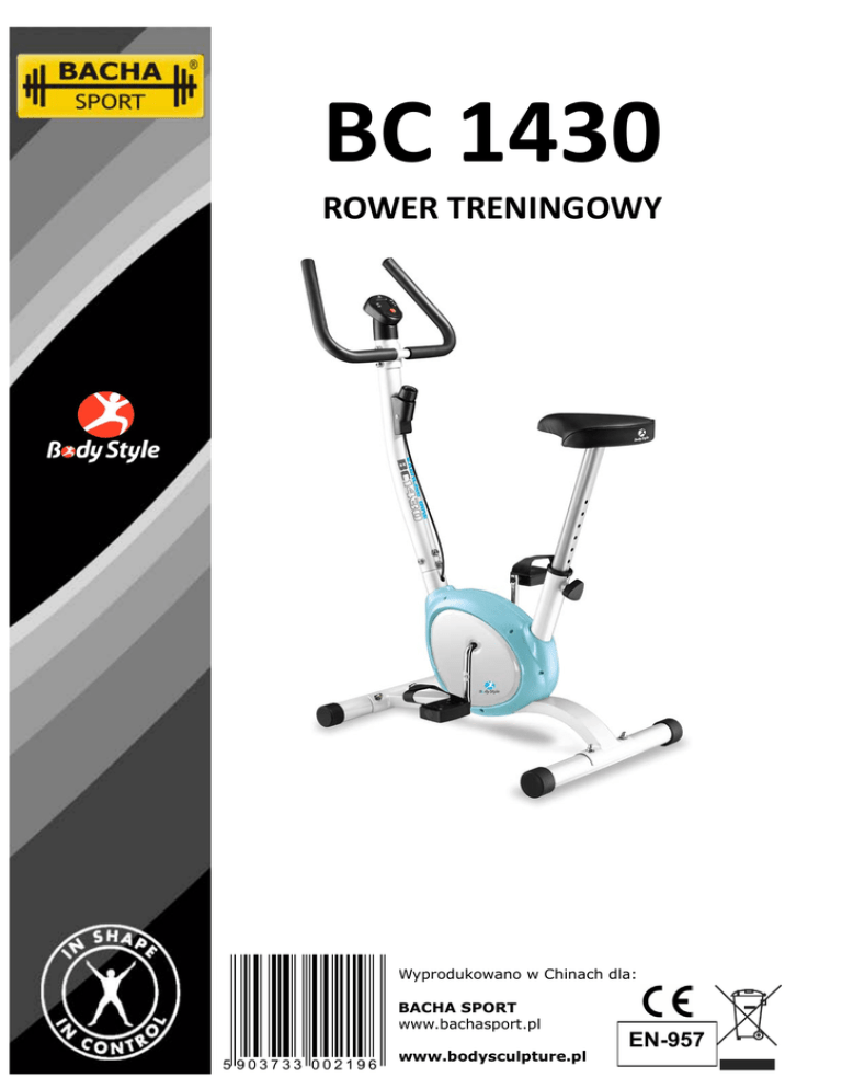 BC 1430 ROWER TRENINGOWY Wyprodukowano w Chinach dla: BACHA SPORT www.bachasport.pl www.bodysculpture.pl EN-957 WAŻNE INFORMACJE PRZED PRZYSTĄPIENIEM DO MONTAŻU PROSIMY O UWAŻNE PRZECZYTANIE NINIEJSZEJ INSTRUKCJI. 1. Urządzenie jest przeznaczone wyłącznie do użytku domowego i nie służy ono do celów medycznych. 2. Rower powinien być ustawiony na płaskim i stabilnym podłożu. 3. Zawsze przed przystąpieniem do ćwiczeń sprawdź czy wszystkie śruby są dobrze dokręcone. (Poluzowywanie się niektórych śrub jest naturalnym procesem zachodzącym w trakcie eksploatacji urządzeń). W razie zużycia którejś z części należny natychmiast ją wymienić Nie wolno ćwiczyć na choćby częściowo uszkodzonym sprzęcie. Pamiętaj, że poziom bezpieczeństwa użytkowania sprzętu można utrzymać tylko dzięki regularnej kontroli uszkodzeń i zużycia 4. Dzieci nie powinny używać tego przyrządu bez opieki dorosłych. Podczas ćwiczeń zwracaj uwagę na to czy dzieci lub zwierzęta nie znajdują się zbyt blisko urządzenia. 5. Rower posiada części ruchome. Podczas ćwiczeń pozostałe osoby powinny zachować bezpieczny dystans. 6. Przed ćwiczeniami wykonaj krótką rozgrzewkę (ok. 5-10 min.). Po zakończonym treningu poświęć podobny czas na ochłonięcie, co pozwoli sercu na płynną zmianę tempa pracy i zapobiegnie nadmiernemu obciążaniu mięśni. 7. Podczas podnoszenia lub przenoszenia bieżni uważaj, aby nie przeciążyć pleców. Zawsze podnoś rower ustawiając się we właściwej pozycji lub poproś o pomoc druga osobę 8. Dla zachowania bezpieczeństwa ćwiczeń wokół roweru powinna znajdować się wolna przestrzeń powinna ona wynosić, co najmniej 0,5 m 9. Pomiędzy ćwiczeniami niezbędny jest odpowiedni odpoczynek, podczas którego następuje rozwinięcie mięśni. Początkujący nie powinni ćwiczyć więcej niż dwa razy w tygodniu, stopniowo zwiększając tę liczbę do 4 i 5 razy. 10. Do ćwiczeń ubieraj zawsze wygodny dres i obuwie. Unikać należy luźnych ubrań, które mogą wkręcić się w ruchome części maszyny. 11. Rower został wykonany zgodnie z norma EN 957 w klasie H.C. 12. Maksymalna waga osoby ćwiczącej nie może przekraczać 100 KG. 13. Rower posiada niezależny układ hamulcowy (oporowy). 14. Transport i magazynowanie powinno odbywać się zgodnie z ogólnymi zasadami bezpieczeństwa. UWAGA: Zanim rozpoczniesz jakiekolwiek ćwiczenia skonsultuj się ze swoim lekarzem. Jeżeli podczas treningu będzie odczuwalny ból, wystąpią zawroty głowy, mdlenie lub podobne objawy –zaprzestań ćwiczeń i udaj się do lekarza! Nigdy nie wstrzymuj oddechu podczas ćwiczeń! SERWIS GWARANCYJNY I POGWARANCYJNY Wszelkich napraw gwarancyjnych i pogwarancyjnych dokonuje importer i zarazem dystrybutor rowerka. W razie wystąpienia usterki prosimy o zgłoszenie się najpierw do miejsca zakupu urządzenia: BACHA SPORT 44-164 Gliwice, ul. Radomska 71, Tel: 32/270-16-15 Fax: 032/ 270-12-09 e-mail: [email protected] RYSUNEK POGLĄDOWY BC 1430 LISTA CZĘŚCI NR CZĘŚC I NAZWA 1. 2. 3. 4. 5. 6. 7. 8. Rama główna Przednia podstawa Przednia stopka Śruba M8 x 60mm Tylnia podstawa Tylna stopka Podkładka M8 Nakrętka M8 Pokrętło regulacji 9. wysokości 10L. Pedał (lewy) 10R. Pedał (prawy) 11. Podstawa siedzenia 12. Siodełko 13. Nakrętka nylonowa M8 14. Podkładka M8 Klucz imbusowy M8 x 15. 15mm a). Klucz imbusowy L6 ILOŚ NR Ć CZĘŚC I 1 1 2 4 1 2 4 4 1 1 1 1 1 3 3 8 NAZWA 16. 17. 18. 19. 20. 21. 22. 23. 24. Podkładka M8 Górny przewód sensora Dolny przewód sensora Kolumna kierownicy Wkręt M5 x 12 Regulator oporu Podstawa licznika Przewód sensora 25. 26. 27. 28. 29. 30. 31. Mocowanie kierownicy Kierownica Zaślepka Osłona A Osłona B Korba Licznik Osłona piankowa b). Klucz nastwny DANE TECHNICZNE: • • • • • Wymiary: o szerokość: 50 cm, o wysokość: 105 cm, o długość: 86 cm. Wysokość siodełka: regulowana w zakresie 65 -85 cm. Waga: 12 kg Waga w opakowaniu: 13,5kg Maksymalna waga użytkownika: 100 kg. ILOŚ Ć 8 1 1 1 2 1 1 1 1 1 1 2 2 2 1 2 INSTRUKCJA MONTAŻU BC 1430 KROK 1 Połącz tylnią podstawę (5) z ramą główną (1) używając dwóch kompletów nakrętek (8),podkładek(7) oraz śrub M8x60mm (4). Połącz przednią podstawę (2) z ramą główną (1) używając dwóch kompletów nakrętek (8),podkładek(7) oraz śrub M8x60mm (4). KROK 2 Weź kolumnę kierownicy (19) i połącz ze sobą górny i dolny przewód sensora (17 i 18). Nasuń kolumnę kierownicy (19) na złącze korpusu, a następnie przy pomocy 4 kompletów śrub imbusowych (15) oraz podkładek (16) przykręć kolumnę do ramy głównej. Przy pomocy wkrêtów (20) przytwierdŸ regulator oporu (21) do kolumny kierownicy (19). KROK 3 Przykręć siodełko (12) do podstawy siedzenia (11) przy pomocy 3 kompletów nakrętek nylonowych (13) i podkładek (14). Podstawę siedzenia (11) połącz z ramą główną (1). Wykorzystaj w tym celu pokrętło regulacji wysokości (9). KROK 4 Pedały (10L, 10R) są opisane literami „L” i „R” – kolejno lewy i prawy. Wkręć je w odpowiadające im ramiona korby (30). Prawe ramię korby znajduje się po prawej stronie rowerka, w momencie, gdy się na nim siedzi. Należy pamiętać, że prawy pedał (10R) powinien być wkręcany zgodnie z ruchem wskazówek zegara, natomiast lewy w kierunku przeciwnym. KROK 5 Nasuń osłony piankowe (31) na ramiona kierownicy (26), następnie przykręć kierownicę do kolumny kierownicy (19) przy pomocy 4 kompletów śrub nimbusowych (15) oraz podkładek (16). Połącz podstawę licznika (22) z kolumną kierownicy (19), delikatnie wsuń licznik (24) w uchwyt podstawy licznika (22), podepnij górny przewód sensora. INSTRUKCJA ĆWICZEŃ BC 1430 Używanie roweru treningowego jest korzystne z kilku powodów. Po pierwsze już w początkowym okresie ćwiczeń następuje wzrost kondycji fizycznej a co się z tym wiąże –poprawa samopoczucia. Mięśnie nabierają rzeźby a w połąc