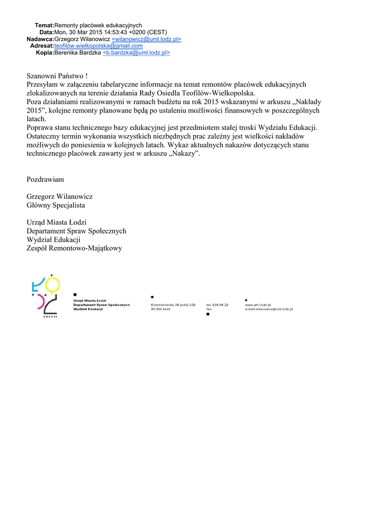Temat:Remonty placówek edukacyjnych Data:Mon, 30 Mar 2015 14:53:43 +0200 (CEST) Nadawca:Grzegorz Wilanowicz <[email protected]> Adresat:[email protected] Kopia:Berenika Bardzka <[email protected]> Szanowni Państwo ! Przesyłam w załączeniu tabelaryczne informacje na temat remontów placówek edukacyjnych zlokalizowanych na terenie działania Rady Osiedla Teofilów-Wielkopolska. Poza działaniami realizowanymi w ramach budżetu na rok 2015 wskazanymi w arkuszu „Nakłady 2015”, kolejne remonty planowane będą po ustaleniu możliwości finansowych w poszczególnych latach. Poprawa stanu technicznego bazy edukacyjnej jest przedmiotem stałej troski Wydziału Edukacji. Ostateczny termin wykonania wszystkich niezbędnych prac zależny jest wielkości nakładów możliwych do poniesienia w kolejnych latach. Wykaz aktualnych nakazów dotyczących stanu technicznego placówek zawarty jest w arkuszu „Nakazy”. Pozdrawiam Grzegorz Wilanowicz Główny Specjalista Urząd Miasta Łodzi Departament Spraw Społecznych Wydział Edukacji Zespół Remontowo-Majątkowy