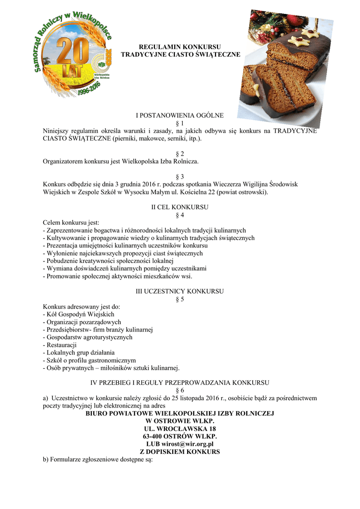 REGULAMIN KONKURSU TRADYCYJNE CIASTO ŚWIĄTECZNE I POSTANOWIENIA OGÓLNE §1 Niniejszy regulamin określa warunki i zasady, na jakich odbywa się konkurs na TRADYCYJNE CIASTO ŚWIĄTECZNE (pierniki, makowce, serniki, itp.). §2 Organizatorem konkursu jest Wielkopolska Izba Rolnicza. §3 Konkurs odbędzie się dnia 3 grudnia 2016 r. podczas spotkania Wieczerza Wigilijna Środowisk Wiejskich w Zespole Szkół w Wysocku Małym ul. Kościelna 22 (powiat ostrowski). II CEL KONKURSU §4 Celem konkursu jest: - Zaprezentowanie bogactwa i różnorodności lokalnych tradycji kulinarnych - Kultywowanie i propagowanie wiedzy o kulinarnych tradycjach świątecznych - Prezentacja umiejętności kulinarnych uczestników konkursu - Wyłonienie najciekawszych propozycji ciast świątecznych - Pobudzenie kreatywności społeczności lokalnej - Wymiana doświadczeń kulinarnych pomiędzy uczestnikami - Promowanie społecznej aktywności mieszkańców wsi. III UCZESTNICY KONKURSU §5 Konkurs adresowany jest do: - Kół Gospodyń Wiejskich - Organizacji pozarządowych - Przedsiębiorstw- firm branży kulinarnej - Gospodarstw agroturystycznych - Restauracji - Lokalnych grup działania - Szkół o profilu gastronomicznym - Osób prywatnych – miłośników sztuki kulinarnej. IV PRZEBIEG I REGUŁY PRZEPROWADZANIA KONKURSU §6 a) Uczestnictwo w konkursie należy zgłosić do 25 listopada 2016 r., osobiście bądź za pośrednictwem poczty tradycyjnej lub elektronicznej na adres BIURO POWIATOWE WIELKOPOLSKIEJ IZBY ROLNICZEJ W OSTROWIE WLKP. UL. WROCŁAWSKA 18 63-400 OSTRÓW WLKP. LUB [email protected] Z DOPISKIEM KONKURS b) Formularze zgłoszeniowe dostępne są: - na stronie internetowej Wielkopolskiej Izby Rolniczej: www.wir.org.pl: - w biurach powiatowych Wielkopolskiej Izby Rolniczej: c) Gotowe ciasto wraz z przepisem na jego wykonanie należy dostarczyć 3 grudnia 2016 roku, bezpośrednio przed rozpoczęciem spotkania i przekazać organizatorom spotkania. Ciasto powinno być pokrojone, wyłożone na kartonowej podkładce oraz opisane danymi wykonawcy. §7 Komisja konkursowa wyłaniając laureatów konkursu oceniać będzie przede wszystkim: - smak ciasta - sposób zaprezentowania wypieku (estetyka, dekoracja). - nawiązanie do tradycji (pochodzenie produktu, wykorzystanie składników regionalnych, szczególne elementy receptury nawiązujące do lokalnych tradycji). §8 Wyniki konkursu oraz wręczenie nagród odbędzie się w dniu konkursu 3 grudnia podczas Wieczerzy Wigilijnej Środowisk Wiejskich. V POSTANOWIENIA KOŃCOWE §9 Organizator zastrzega sobie prawo przerwania, zmiany konkursu w razie przyczyn od niego niezależnych lub zmiany terminu i miejsca ogłoszenia wyników konkursu. §10 Wszystkie informacje dotyczące spraw nie wyszczególnionych w regulaminie można otrzymać pod numerem tel. 62 592 80 18. lub pod adresem: Wielkopolska Izba Rolnicza Biuro Powiatowe, ul. Wrocławska 18, 63-400 Ostrów Wlkp. lub [email protected] §11 Przystępując do konkursu Uczestnicy wyrażają zgodę na przetwarzanie ich danych osobowych w rozumieniu ustawy z dnia 29 sierpnia 1997 r. o ochronie danych osobowych (t. j. Dz. U. 2001, Nr 101, poz. 928 ze zm.) przez Organizatora w celach związanych z przeprowadzeniem Konkursu i w zakresie niezbędnym do jego należytego przeprowadzenia. „Europejski Fundusz Rolny na rzecz Rozwoju Obszarów Wiejskich: Europa inwestująca w obszary wiejskie” Projekt realizowany przez Wielkopolską Izbę Rolniczą współfinansowany jest ze środków Unii Europejskiej w ramach Krajowej Sieci Obszarów Wiejskich Programu Rozwoju Obszarów Wiejskich na lata 2014-2020. Instytucja Zarządzająca PROW 2014-2020 – Minister Rolnictwa i Rozwoju Wsi