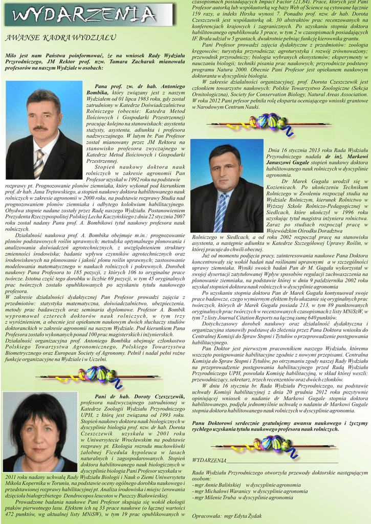 AWANSE KADRA WYDZIA£U Mi³o jest nam Pañstwa poinformowaæ, ¿e na wniosek Rady Wydzia³u Przyrodniczego, JM Rektor prof. nzw. Tamara Zacharuk mianowa³a profesorów na naszym Wydziale w osobach: Pana prof. zw. dr hab. Antoniego Bombika, który zwi¹zany jest z naszym Wydzia³em od 01 lipca 1983 roku, gdy zosta³ zatrudniony w Katedrze Doœwiadczalnictwa Rolniczego (obecnie: Katedra Metod Iloœciowych i Gospodarki Przestrzennej) pracuj¹c kolejno na stanowiskach: asystenta sta¿ysty, asystenta, adiunkta i profesora nadzwyczajnego. W lutym br. Pan Profesor zosta³ mianowany przez JM Rektora na stanowisko profesora zwyczajnego w Katedrze Metod Iloœciowych i Gospodarki Przestrzennej. Stopieñ naukowy doktora nauk rolniczych w zakresie agronomii Pan Profesor uzyska³ w 1992 roku na podstawie rozprawy pt. Prognozowanie plonów ziemniaka, który wykona³ pod kierunkiem prof. dr hab. Jana Trêtowskiego, a stopieñ naukowy doktora habilitowanego nauk rolniczych w zakresie agronomii w 2000 roku, na podstawie rozprawy Studia nad prognozowaniem plonów ziemniaka i odbytego kolokwium habilitacyjnego. Obydwa stopnie nadane zosta³y przez Radê naszego Wydzia³u. Postanowieniem Prezydenta Rzeczypospolitej Polskiej Lecha Kaczyñskiego z dnia 22 stycznia 2007 roku zosta³ nadany Panu prof. A. Bombikowi tytu³ naukowy profesora nauk rolniczych. Dzia³alnoœæ naukowa prof. A. Bombika obejmuje m.in.: prognozowanie plonów podstawowych roœlin uprawnych; metodyka optymalnego plonowania i analizowania doœwiadczeñ agrotechnicznych, z uwzglêdnieniem struktury zmiennoœci œrodowiska; badanie wp³ywu czynników agrotechnicznych oraz œrodowiskowych na plonowanie i jakoœæ plonu roœlin uprawnych; zastosowanie modelowania matematycznego w naukach rolniczych i pokrewnych. Dorobek naukowy Pana Profesora to 185 pozycji, z których 106 to oryginalne prace twórcze. Istotna czêœæ tego dorobku w liczbie 69 pozycji, w tym 45 oryginalnych prac twórczych zosta³o opublikowanych po uzyskaniu tytu³u naukowego profesora. W zakresie dzia³alnoœci dydaktycznej Pan Profesor prowadzi zajêcia z przedmiotów: statystyka matematyczna, doœwiadczalnictwo, ubezpieczenia, metody prac badawczych oraz seminaria dyplomowe. Profesor A. Bombik wypromowa³ czterech doktorów nauk rolniczych, w tym trzy z wyró¿nieniem, a obecnie jest opiekunem naukowym dwóch s³uchaczy studiów doktoranckich w zakresie agronomii na naszym Wydziale. Pod kierunkiem Pana Profesora zosta³o wykonanych ponad 100 prac magisterskich i in¿ynierskich. Dzia³alnoœæ organizacyjna prof. Antoniego Bombika obejmuje cz³onkostwo Polskiego Towarzystwa Agronomicznego, Polskiego Towarzystwa Biometrycznego oraz European Society of Agronomy. Pe³ni³ i nadal pe³ni ro¿ne funkcje organizacyjne na Wydziale i w Uczelni. Pani dr hab. Doroty Czeszczewik, profesora nadzwyczajnego zatrudnionej w Katedrze Zoologii Wydzia³u Przyrodniczego UPH, z któr¹ jest zwi¹zana od 1993 roku. Stopieñ naukowy doktora nauk biologicznych w dyscyplinie biologia prof. nzw. dr hab. Dorota Czeszczewik uzyska³a w 2001 roku w Uniwersytecie Wroc³awskim na podstawie rozprawy pt. Ekologia rozrodu muchow³ówki ¿a³obnej Ficedula hypoleuca w lasach naturalnych i zagospodarowanych. Stopieñ doktora habilitowanego nauk biologicznych w dyscyplinie biologia Pani Profesor uzyska³a w 2011 roku nadany uchwa³¹ Rady Wydzia³u Biologii i Nauk o Ziemi Uniwersytetu Miko³a Kopernika w Toruniu, na podstawie oceny ogólnego dorobku naukowego i przedstawionej rozprawy habilitacyjnej pt. Analiza œrodowiska i miejsc ¿erowania dziêcio³a bia³ogrzbietego Dendrocopos leucotos w Puszczy Bia³owieskiej. Prowadzone badania naukowe Pani Profesor skupiaja siê wokó³ ekologii ptaków pierwotnego lasu. Efektem ich s¹ 33 prace naukowe (o ³¹cznej wartoœci 472 punktów, wg aktualnej listy MNiSW), w tym 19 prac opublikowanych w czasopismach posiadaj¹cych Impact Factor (21,84). Prace, których jest Pani Profesor autork¹ lub wspó³autork¹ wg bazy Web of Science s¹ cytowane ³¹cznie 159 razy, a indeks Hirsha wynosi 7. Ponadto prof. nzw. dr hab. Dorota Czeszczewik jest wspó³autork¹ ok. 30 abstraktów prac recenzowanych na konferencjach krajowych i zagranicznych. Po uzyskaniu stopnia doktora habilitowanego opublikowa³a 3 prace, w tym 2 w czasopismach posiadaj¹cych IF. Bra³a udzia³ w 5 grantach, dwukrotnie pe³ni¹c funkcjê kierownika grantu. Pani Profesor prowadzi zajêcia dydaktyczne z przedmiotów: zoologia krêgowców; turystyka przyrodnicza; agroturystyka i rozwój zrównowa¿ony; przewodnik przyrodniczy; biologia wybranych ekosystemów; eksperymenty w nauczaniu biologii; techniki pisania prac naukowych; przyrodnicze podstawy programu Natura 2000. Obecnie Pani Profesor jest opiekunem naukowym doktoranta w dyscyplinie biologia. W zakresie dzia³alnoœci organizacyjnej, prof. Dorota Czeszczewik jest cz³onkiem towarzystw naukowych: Polskie Towarzystwo Zoologiczne (Sekcja Ornitologiczna), Society for Conservation Biology, Natural Areas Association. W roku 2012 Pani prfesor pe³ni³a rolê eksparta oceniaj¹cego wnioski grantowe w Narodowym Centrum Nauki. Dnia 16 stycznia 2013 roku Rada Wydzia³u Przyrodniczego nada³a dr in¿. Markowi Januszowi Gugale stopieñ naukowy doktora habilitowanego nauk rolniczych w dyscyplinie agronomia. Dr Marek Guga³a urodzi³ siê w Kozienicach. Po ukoñczeniu Technikum Rolniczego w Zwoleniu rozpocz¹³ studia na Wydziale Rolniczym, kierunek Rolnictwo w Wy¿szej Szkole Rolniczo-Pedagogicznej w Siedlcach, które ukoñczy³ w 1996 roku uzyskuj¹c tytu³ magistra in¿yniera rolnictwa. Zaraz po studiach rozpocz¹³ pracê w Wojewódzkim Oœrodku Doradztwa Rolniczego w Siedlcach, a od roku 2002 rozpocz¹³ pracê na stanowisku asystenta, a nastêpnie adiunkta w Katedrze Szczegó³owej Uprawy Roœlin, w której pracuje do chwili obecnej. Ju¿ od momentu podjêcia pracy, zainteresowania naukowe Pana Doktora koncentrowa³y siê wokó³ badañ nad roœlinami uprawnymi 