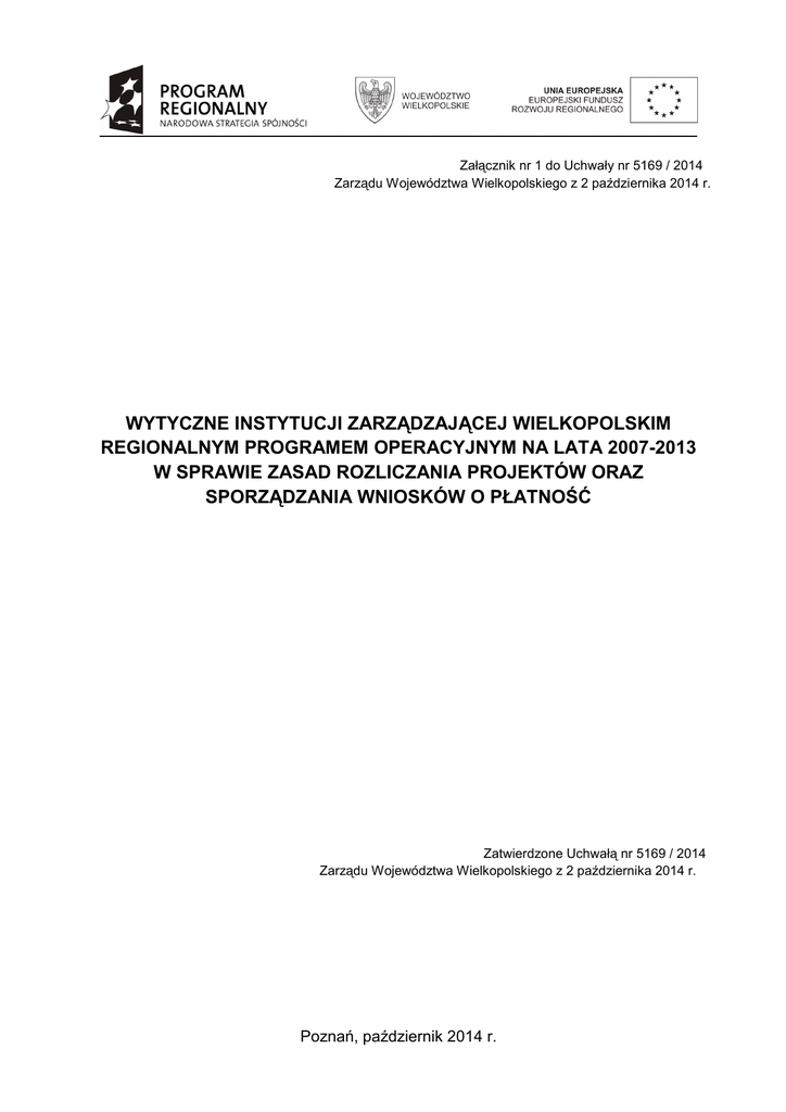 Załącznik nr 1 do Uchwały nr 5169 / 2014 Zarządu Województwa Wielkopolskiego z 2 października 2014 r. WYTYCZNE INSTYTUCJI ZARZĄDZAJĄCEJ WIELKOPOLSKIM REGIONALNYM PROGRAMEM OPERACYJNYM NA LATA 2007-2013 W SPRAWIE ZASAD ROZLICZANIA PROJEKTÓW ORAZ SPORZĄDZANIA WNIOSKÓW O PŁATNOŚĆ Zatwierdzone Uchwałą nr 5169 / 2014 Zarządu Województwa Wielkopolskiego z 2 października 2014 r. Poznań, październik 2014 r. Spis treści Rozdział I Zasady ogólne .......................................................................................................... 3 Rozdział II Szczególne zasady dotyczące ZALICZEK wypłacanych w ramach projektów objętych pomocą publiczną (w tym de minimis), których Beneficjenci, w związku z ich realizacją, nabyli prawo do otrzymania pomocy po dniu 18.05.2012r. .................................................................................................................................... 8 Rozdział III Informacje dodatkowe dotyczące projektów nie objętych pomocą publiczną (w tym de minimis), które są realizowane przez Beneficjentów naleŜących do sektora finansów publicznych, stosujących Ustawę Prawo zamówień publicznych oraz Beneficjentów zobowiązanych na podstawie Umowy/Decyzji o dofinansowanie Projektu do ogłaszania przetargów na podstawie Kodeksu cywilnego a takŜe projektów objętych pomocą publiczną (w tym de minimis), które są realizowane przez jednostki samorządu terytorialnego ......... 10 Rozdział IV Załączniki do Wniosku o płatność ................................................................. 12 Rozdział V Elementy opisu faktury lub innego dowodu księgowego o równowaŜnej wartości dowodowej (dokumenty są załączane wyłącznie do Wniosku pełniącego funkcję refundacyjną/rozliczeniową zaliczki) ..................................................................... 15 Rozdział VI Instrukcja wypełniania poszczególnych pozycji Wniosku o płatność . 17 Załącznik nr 1 Tabela wynagrodzeń 2 Rozdział I Zasady ogólne 1. Do Wniosku o płatność w formie papierowej naleŜy dołączyć obowiązujące załączniki wraz ze zaktualizowanym harmonogramem rzeczowo – finansowym/tabelą finansową: Planowane wydatki w ramach projektu (o ile dokument uległ zmianie a z zapisów Umowy/Decyzji o dofinansowanie Projektu/Aneksu/Decyzji zmieniającej Decyzję wynika, Ŝe zmiany nie wymagają podpisania aneksu), podpisanym przez upowaŜnioną osobę wraz z datą sporządzenia. Wniosek o płatność i elektronicznej. naleŜy złoŜyć w jednym egzemplarzu w formie papierowej Wnioski naleŜy składać/przesyłać na adres Departamentu WdraŜania Programu Regionalnego. 2. Wniosek o płatność powinien być złoŜony w formie umoŜliwiającej jego przechowywanie i archiwizację (np. w segregatorze). 3. Wniosek o płatność powinien być parafowany na kaŜdej ze stron przez upowaŜnioną osobę (tuszem innym niŜ czarny). 4. Wniosek o płatność moŜe pełnić jednocześnie funkcję zaliczkową, rozliczającą zaliczkę oraz refundacyjną wydatków kwalifikowalnych poniesionych przez Beneficjenta z własnych środków. 5. Beneficjent zobowiązany jest do składania Wniosku o płatność z częstotliwością określoną w Umowie/Decyzji o dofinansowanie Projektu/Aneksie/Decyzji zmieniającej Decyzję: − dla celów otrzymania transzy zaliczki – jeŜeli moŜliwość jej otrzymania wynika z Umowy/Decyzji o dofinansowanie Projektu i po wniesieniu zabezpieczenia prawidłowej realizacji Projektu, nie wcześniej niŜ po otrzymaniu od IZ WRPO* informacji o pozytywnym poświadczeniu Wniosku o płatność rozliczającego wcześniej przekazaną transzę zaliczki (jeśli była wypłacona); − dla celów refundacji - nie częściej niŜ raz w miesiącu oraz w terminie do 30 dni po dokonaniu 30%, 60% i 100% wydatków niezbędnych do realizacji Projektu, z zastrzeŜeniem obowiązku rozliczenia poprzedniej transzy zaliczki, o ile wystąpiła, − dla celów rozliczenia pobranej zaliczki – w terminie nie przekraczającym 45 dni od dnia wpływu środków finansowych przekazanych przez IZ WRPO w formie zaliczki (nie później jednak niŜ do dnia 30 listopada danego roku dla Projektów, w których występuje współfinansowanie budŜetu państwa). Wniosek o płatność nie moŜe być złoŜony wcześniej niŜ w dniu rozpoczęcia realizacji Projektu. Kolejny Wniosek o płatność powinien być złoŜony najwcześniej po uzyskaniu informacji o poświadczeniu przez IZ WRPO wniosku złoŜonego wcześniej. UWAGA!!! Jeśli zaliczka jest wypłacana przez róŜnych płatników, dla kaŜdego z przelewów biegnie odrębny termin. W przypadku, gdy ewentualna rozbieŜność w terminie otrzymania środków jest niewielka zaleca się złoŜenie jednego wniosku rozliczającego łączną kwotę zaliczki w terminie obowiązującym dla wcześniej otrzymanego przelewu. O dochowaniu terminu decyduje data nadania Wniosku w polskiej placówce pocztowej operatora publicznego, w placówce operatora prywatnego lub w firmie kurierskiej, potwierdzona odpowiednim dowodem nadania, na adres Departamentu WdraŜania Programu Regionalnego lub data złoŜenia wniosku w sekretariacie ww. Departamentu w godzinach jego urzędowania. JeŜeli koniec terminu przypada w sobotę lub dzień ustawowo wolny od pracy, termin upływa dnia następnego. * IZ WRPO – Instytucja Zarządzająca Wielkopolskim Regionalnym Programem Operacyjnym 3 Niewykorzystana kwota zaliczki powinna zostać zwrócona na konta płatnika/-ów lub rozliczona kolejnym Wnioskiem o płatność najpóźniej do końca roku, w którym Beneficjent ma obowiązek rozliczenia min. 70% udzielonej kwoty zaliczki (nie później jednak niŜ do dnia 30 listopada roku, w którym została udzielona zaliczka dla Projektów, w których występuje współfinansowanie budŜetu państwa). Ponadto, IZ WRPO zastrzega sobie równieŜ prawo do wezwania Beneficjenta do zwrotu niewykorzystanych środków zaliczki w