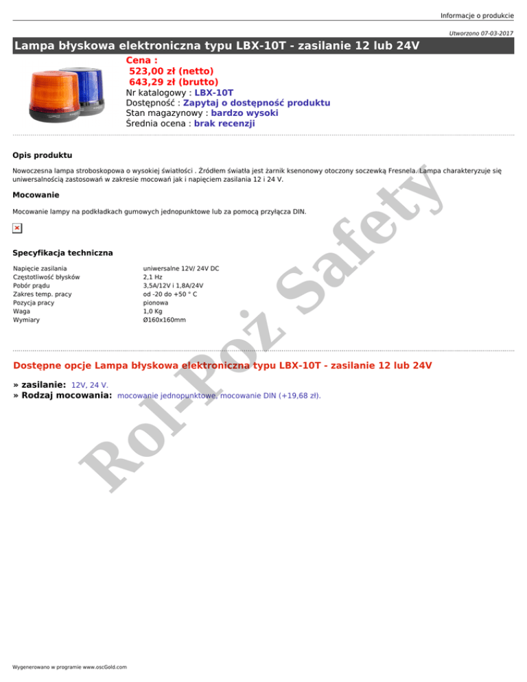 Informacje o produkcie Utworzono 07-03-2017 Lampa błyskowa elektroniczna typu LBX-10T - zasilanie 12 lub 24V Cena : 523,00 zł (netto) 643,29 zł (brutto) Nr katalogowy : LBX-10T Dostępność : Zapytaj o dostępność produktu Stan magazynowy : bardzo wysoki Średnia ocena : brak recenzji Opis produktu fe ty Nowoczesna lampa stroboskopowa o wysokiej światłości . Żródłem światła jest żarnik ksenonowy otoczony soczewką Fresnela. Lampa charakteryzuje się uniwersalnością zastosowań w zakresie mocowań jak i napięciem zasilania 12 i 24 V. Mocowanie Mocowanie lampy na podkładkach gumowych jednopunktowe lub za pomocą przyłącza DIN. uniwersalne 12V/ 24V DC 2,1 Hz 3,5A/12V i 1,8A/24V od -20 do +50 ° C pionowa 1,0 Kg Ø160x160mm oż Napięcie zasilania Częstotliwość błysków Pobór prądu Zakres temp. pracy Pozycja pracy Waga Wymiary Sa Specyfikacja techniczna -P Dostępne opcje Lampa błyskowa elektroniczna typu LBX-10T - zasilanie 12 lub 24V R ol » zasilanie: 12V, 24 V. » Rodzaj mocowania: mocowanie jednopunktowe, mocowanie DIN (+19,68 zł). Wygenerowano w programie www.oscGold.com
