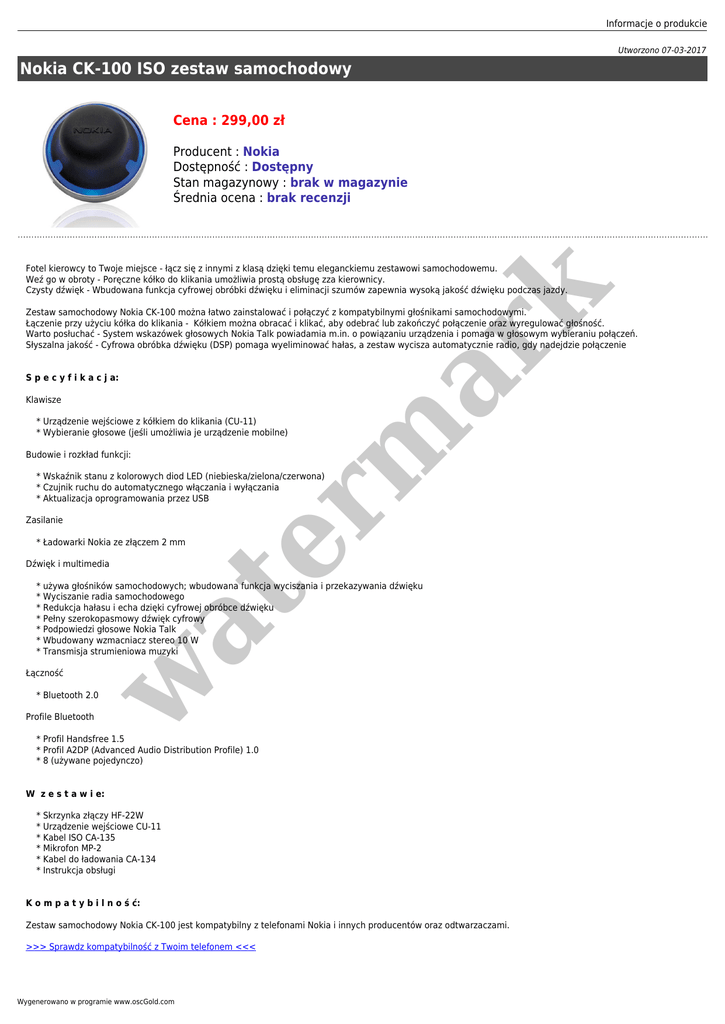 Informacje o produkcie Utworzono 07-03-2017 Nokia CK-100 ISO zestaw samochodowy Cena : 299,00 zł Producent : Nokia Dostępność : Dostępny Stan magazynowy : brak w magazynie Średnia ocena : brak recenzji er m ar k Fotel kierowcy to Twoje miejsce - łącz się z innymi z klasą dzięki temu eleganckiemu zestawowi samochodowemu. Weź go w obroty - Poręczne kółko do klikania umożliwia prostą obsługę zza kierownicy. Czysty dźwięk - Wbudowana funkcja cyfrowej obróbki dźwięku i eliminacji szumów zapewnia wysoką jakość dźwięku podczas jazdy. Zestaw samochodowy Nokia CK-100 można łatwo zainstalować i połączyć z kompatybilnymi głośnikami samochodowymi. Łączenie przy użyciu kółka do klikania - Kółkiem można obracać i klikać, aby odebrać lub zakończyć połączenie oraz wyregulować głośność. Warto posłuchać - System wskazówek głosowych Nokia Talk powiadamia m.in. o powiązaniu urządzenia i pomaga w głosowym wybieraniu połączeń. Słyszalna jakość - Cyfrowa obróbka dźwięku (DSP) pomaga wyeliminować hałas, a zestaw wycisza automatycznie radio, gdy nadejdzie połączenie S p e c y f i k a c j a: Klawisze * Urządzenie wejściowe z kółkiem do klikania (CU-11) * Wybieranie głosowe (jeśli umożliwia je urządzenie mobilne) Budowie i rozkład funkcji: * Wskaźnik stanu z kolorowych diod LED (niebieska/zielona/czerwona) * Czujnik ruchu do automatycznego włączania i wyłączania * Aktualizacja oprogramowania przez USB Zasilanie * Ładowarki Nokia ze złączem 2 mm Dźwięk i multimedia w Łączność at * używa głośników samochodowych; wbudowana funkcja wyciszania i przekazywania dźwięku * Wyciszanie radia samochodowego * Redukcja hałasu i echa dzięki cyfrowej obróbce dźwięku * Pełny szerokopasmowy dźwięk cyfrowy * Podpowiedzi głosowe Nokia Talk * Wbudowany wzmacniacz stereo 10 W * Transmisja strumieniowa muzyki * Bluetooth 2.0 Profile Bluetooth * Profil Handsfree 1.5 * Profil A2DP (Advanced Audio Distribution Profile) 1.0 * 8 (używane pojedynczo) W z e s t a w i e: * Skrzynka złączy HF-22W * Urządzenie wejściowe CU-11 * Kabel ISO CA-135 * Mikrofon MP-2 * Kabel do ładowania CA-134 * Instrukcja obsługi K o m p a t y b i l n o ś ć: Zestaw samochodowy Nokia CK-100 jest kompatybilny z telefonami Nokia i innych producentów oraz odtwarzaczami. >>> Sprawdz kompatybilność z Twoim telefonem <<< Wygenerowano w programie www.oscGold.com er m ar k at w