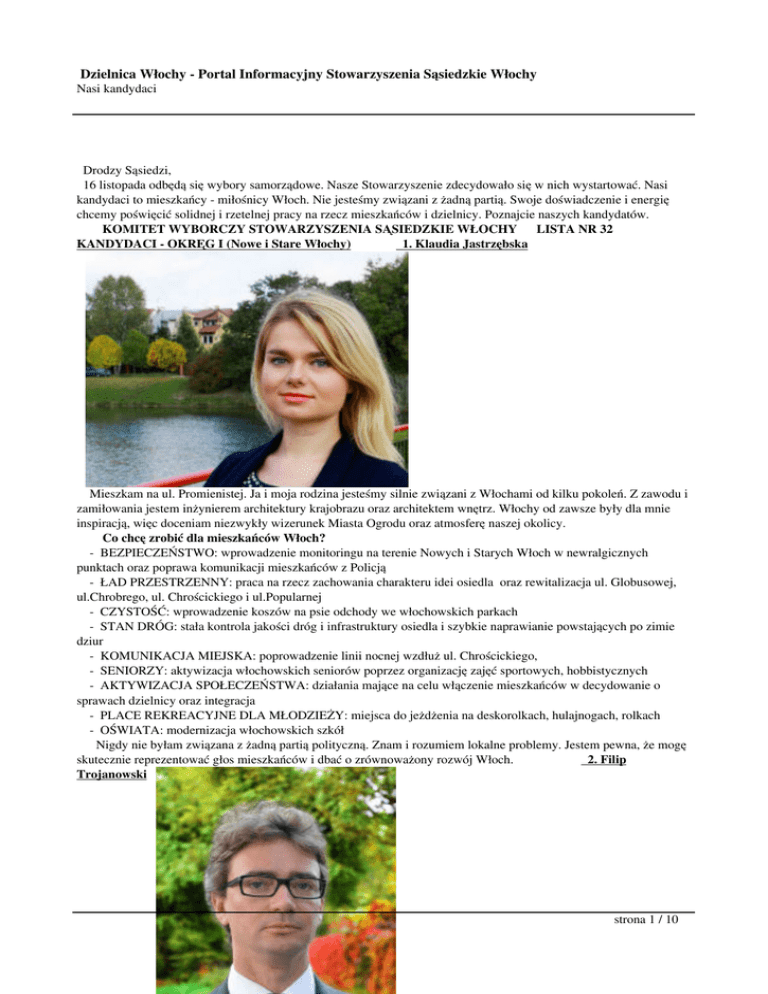 Dzielnica Włochy - Portal Informacyjny Stowarzyszenia Sąsiedzkie Włochy Nasi kandydaci Drodzy Sąsiedzi, 16 listopada odbędą się wybory samorządowe. Nasze Stowarzyszenie zdecydowało się w nich wystartować. Nasi kandydaci to mieszkańcy - miłośnicy Włoch. Nie jesteśmy związani z żadną partią. Swoje doświadczenie i energię chcemy poświęcić solidnej i rzetelnej pracy na rzecz mieszkańców i dzielnicy. Poznajcie naszych kandydatów. KOMITET WYBORCZY STOWARZYSZENIA SĄSIEDZKIE WŁOCHY LISTA NR 32 KANDYDACI - OKRĘG I (Nowe i Stare Włochy) 1. Klaudia Jastrzębska Mieszkam na ul. Promienistej. Ja i moja rodzina jesteśmy silnie związani z Włochami od kilku pokoleń. Z zawodu i zamiłowania jestem inżynierem architektury krajobrazu oraz architektem wnętrz. Włochy od zawsze były dla mnie inspiracją, więc doceniam niezwykły wizerunek Miasta Ogrodu oraz atmosferę naszej okolicy. Co chcę zrobić dla mieszkańców Włoch? - BEZPIECZEŃSTWO: wprowadzenie monitoringu na terenie Nowych i Starych Włoch w newralgicznych punktach oraz poprawa komunikacji mieszkańców z Policją - ŁAD PRZESTRZENNY: praca na rzecz zachowania charakteru idei osiedla oraz rewitalizacja ul. Globusowej, ul.Chrobrego, ul. Chrościckiego i ul.Popularnej - CZYSTOŚĆ: wprowadzenie koszów na psie odchody we włochowskich parkach - STAN DRÓG: stała kontrola jakości dróg i infrastruktury osiedla i szybkie naprawianie powstających po zimie dziur - KOMUNIKACJA MIEJSKA: poprowadzenie linii nocnej wzdłuż ul. Chrościckiego, - SENIORZY: aktywizacja włochowskich seniorów poprzez organizację zajęć sportowych, hobbistycznych - AKTYWIZACJA SPOŁECZEŃSTWA: działania mające na celu włączenie mieszkańców w decydowanie o sprawach dzielnicy oraz integracja - PLACE REKREACYJNE DLA MŁODZIEŻY: miejsca do jeżdżenia na deskorolkach, hulajnogach, rolkach - OŚWIATA: modernizacja włochowskich szkół Nigdy nie byłam związana z żadną partią polityczną. Znam i rozumiem lokalne problemy. Jestem pewna, że mogę skutecznie reprezentować głos mieszkańców i dbać o zrównoważony rozwój Włoch. 2. Filip Trojanowski strona 1 / 10 Dzielnica Włochy - Portal Informacyjny Stowarzyszenia Sąsiedzkie Włochy Nasi kandydaci Moja rodzina mieszka w okolicach Parku Cietrzewia od początku historii Starych Włoch. Tu się wychowałem i chodziłem do szkoły. Tu zamieszkałem wraz z rodziną. Mam 40 lat. Zawodowo zajmuję się sprawami finansowo-bankowymi (w tym budżetowaniem i finansowaniem samorządów). Znam i rozumiem sektor pozarządowy. Od wielu lat działam w organizacjach społecznych, w tym w Stowarzyszeniu Sąsiedzkie Włochy, gdzie pełniłem funkcję Wiceprezesa, a obecnie jestem członkiem Komisji Rewizyjnej. Co chciałbym zrobić dla mieszkańców Włoch? - Doprowadzić do jednoznacznego wyznaczenia zasad parkowania na wszystkich lokalnych ulicach - Poprawić oznaczenia przejść dla pieszych – w szczególności w miejscach uczęszczanych przez dzieci w drodze do szkoły (np. na ul. Krańcowej w miejscu wejścia do parku). - Zintegrować infrastrukturę rowerową z systemem lokalnych ulic (dodatkowe oznaczenia, ścieżki, stojaki, rowerowa mapa Włoch) - Stworzyć radio internetowe „WWW”, czyli „Wszystko We Włochach”, służące lepszej integracji mieszkańców. - Wprowadzić „Kartę Włochowską”, czyli system zniżek i rabatów skierowany do mieszkańców Włoch i promujący lokalnych przedsiębiorców. - Budować realny dialog z Portami Lotniczymi respektujący potrzeby mieszkańców - w tym zorganizowanie forum wiedzy i wsparcia dla osób, które wniosły roszczenia odszkodowawcze przeciwko PPL im. F.Chopina w Warszawie. Chciałbym udowodnić mieszkańcom poprzez działanie w Radzie Dzielnicy, że samorząd jest ich własnością, a ich głos jest najważniejszy. Jestem otwarty na wszystkie działania, które są dla Państwa ważne. Wystarczy napisać: [email protected] 3. Sławomir Porębski Mieszkam na ulicy Obywatelskiej. Z wykształcenia jestem matematykiem. Zawodowo pracuję jako analityk biznesowy. Jestem młodym i ambitnym działaczem społecznym, zaangażowanym w problemy otaczającej społeczności. Nigdy nie odmawiam pomocy i jestem otwarty na dialog z mieszkańcami. Dzięki zaufaniu sąsiadów jestem członkiem zarządu Osiedla Zielona Italia - jednej z największych wspólnot mieszkaniowych w naszej dzielnicy. Co chciałbym zrobić dla mieszkańców Włoch? - Dbać o zachowanie koncepcji Miasta Ogrodu, zgodnie z którą wybudowane zostały Włochy - Przeorganizować ruch kołowy na ul. Obywatelskiej tak, żeby docelowo rozwiązać problem bezpieczeństwa mieszkańców nie zapominając o potrzebie miejsc postojowych. - Wspierać rozwiązania pozwalające kobietom na godzenie kariery zawodowej z opieką nad dziećmi. - Odnowić szkoły na terenie naszej dzielnicy, dzięki partnerstwu publiczno-prywatnemu i środkom unijnym. - Wspierać budowę ścieżek rowerowych wzdłuż ul. Chrościckiego i ul. Globusowej. - Poprawić komunikację pomiędzy mieszkańcami a urzędnikami. Chciałbym zwiększyć udział stowarzyszeń w życiu publicznym i żeby radni bardziej brali pod uwagę głos mieszkańców. Serdecznie zapraszam na moją stronę facebook.com/SlawomirPorebskiSpolecznie, gdzie można dowiedzieć się więcej o mnie i o tym, co chciałbym zrobić dla Włoch. 4. Michał Uss strona 2 / 10 Dzielnica Włochy - Portal Informacyjny Stowarzyszenia Sąsiedzkie Włochy Nasi kandydaci Moja rodzina zamieszkała we Włochach w okresie międzywojennym. Z wykształcenia jestem inżynierem. Posiadam międzynarodowe kwalifikacje finansowe ACCA. Pracuję w sektorze energetycznym pozyskując fundusze UE. Jestem członkiem Zarządu Stowarzyszenia Sąsiedzkie Włochy. Mam 3 dzieci. Wierzę, że Miasto Ogród Włochy zachowując swój kameralny charakter oraz poszerzając ofertę edukacyjną, może być idealnym miejscem dla rodzin z dziećmi. Co chciałbym zrobić dla mies