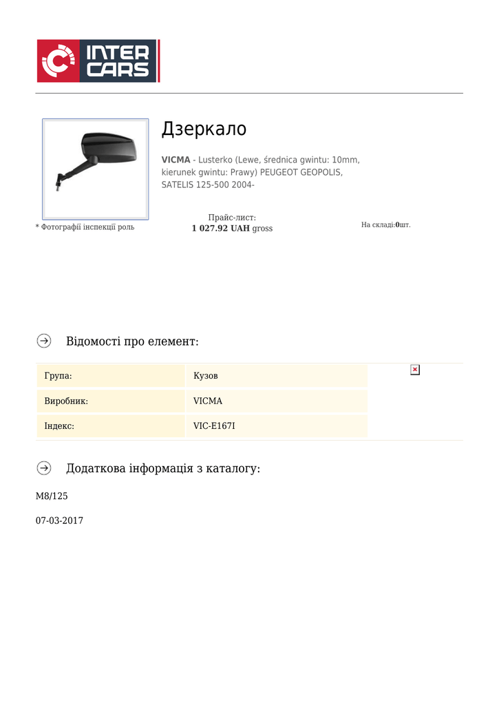 Дзеркало VICMA - Lusterko (Lewe, średnica gwintu: 10mm, kierunek gwintu: Prawy) PEUGEOT GEOPOLIS, SATELIS 125-500 2004- * Фотографії інспекції роль Прайс-лист: 1 027.92 UAH gross Відомості про елемент: Група: Кузов Виробник: VICMA Індекс: VIC-E167I Додаткова інформація з каталогу: M8/125 07-03-2017 На складі:0шт.