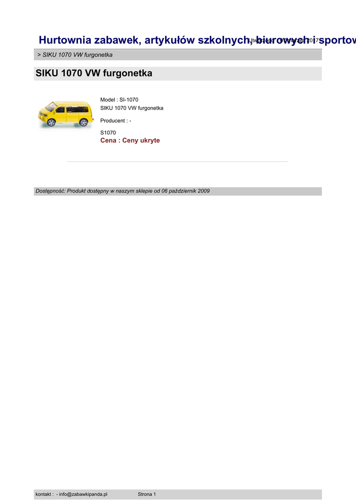 : 07 marzec 2017 Hurtownia zabawek, artykułów szkolnych,Utworzono biurowych i sportow > SIKU 1070 VW furgonetka SIKU 1070 VW furgonetka Model : SI-1070 SIKU 1070 VW furgonetka Producent : S1070 Cena : Ceny ukryte Dostępność: Produkt dostępny w naszym sklepie od 06 październik 2009 kontakt : - [email protected] Strona 1