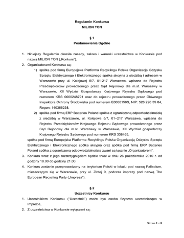 Regulamin Konkursu MILION TON §1 Postanowienia Ogólne 1. Niniejszy Regulamin określa zasady, zakres i warunki uczestnictwa w Konkursie pod nazwą MILION TON („Konkurs”). 2. Organizatorami Konkursu są: 1) spółka pod firmą Europejska Platforma Recyklingu Polska Organizacja Odzysku Sprzętu Elektrycznego i Elektronicznego spółka akcyjna z siedzibą i adresem w Warszawie przy ul. Kolejowej 5/7, 01-217 Warszawa, wpisana do Rejestru Przedsiębiorców prowadzonego przez Sąd Rejonowy dla m.st. Warszawy w Warszawie, XII Wydział Gospodarczy Krajowego Rejestru Sądowego pod numerem KRS 0000248791 oraz do rejestru prowadzonego przez Głównego Inspektora Ochrony Środowiska pod numerem E0000156S, NIP: 526 290 55 84, Regon: 140366238, 2) spółka pod firmą ERP Batteries Poland spółka z ograniczoną odpowiedzialnością z siedzibą w Warszawie, ul. Kolejowa 5/7, 01–217 Warszawa, wpisana do Rejestru Przedsiębiorców Krajowego Rejestru Sądowego prowadzonego przez Sąd Rejonowy dla m.st. Warszawy w Warszawie, XII Wydział gospodarczy Krajowego Rejestru Sądowego pod numerem KRS 338465, spółka pod firmą Europejska Platforma Recyklingu Polska Organizacją Odzysku Sprzętu Elektrycznego i Elektronicznego spółka akcyjna oraz spółka pod firmą ERP Batteries Poland spółka z ograniczoną odpowiedzialnością zwani są łącznie „Organizatorem”. 3. Konkurs wraz z jego rozstrzygnięciem będzie trwał w dniu 26 października 2010 r. od godziny 18.00 do godziny 21.00. 4. Konkurs zostanie przeprowadzony na terytorium Polski w lokalu pod nazwą Palladium, mieszczącym się w Warszawie, przy ul. Złotej 9, podczas imprezy pod nazwą The European Recycling Party („Impreza”). §2 Uczestnicy Konkursu 1. Uczestnikiem Konkursu (“Uczestnik”) może być osoba fizyczna uczestnicząca w Imprezie, 2. Z uczestnictwa w Konkursie wyłączeni są: Strona 1 z 8 a) członkowie władz lub pracownicy Organizatora, a także członkowie ich najbliższych rodzin, b) osoby wchodzące w skład Komisji Konkursowej wskazanej § 5 ust. 1, a także członkowie ich najbliższych rodzin. 3. Za członków najbliższej rodziny uznaje się wstępnych, zstępnych, rodzeństwo, małżonków i osoby pozostające w stosunku przysposobienia. §3 Zasady Konkursu 1. Każdy Uczestnik Imprezy jest uprawniony do wejścia na Imprezę w zamian za 1 sztukę zużytego sprzętu elektrycznego lub elektronicznego lub za 10 sztuk zużytych baterii. Uczestnik Imprezy otrzyma od Organizatora: 1) kartę przeznaczoną do wzięcia udziału w Konkursie („Karta konkursowa”), 2) opaskę na nadgarstek, zawierającą indywidualny numer („Opaska”). 2. Aby wziąć udział w Konkursie należy: 1) opracować hasło/slogan promujące zbieranie odpadów elektrycznych i elektronicznych oraz baterii, a także ich odzysk i recykling („Hasło”), 2) umieścić Hasło opracowane przez Uczestnika na Karcie konkursowej, 3) umieścić na Karcie konkursowej indywidualny numer przydzielony określonemu Uczestnikowi Konkursu, znajdujący się na Opasce, 4) wrzucić Kartę konkursową do jednej z urn znajdujących się w klubie Palladium podczas trwania Konkursu. 3. Uczestnik nie umieszcza na Karcie konkursowej żadnych innych informacji ani danych osobowych w rozumieniu ustawy z dnia z dnia 29 sierpnia 1997 r. o ochronie danych osobowych (Dz. U. 2002 r. Nr 101 poz. 926). 4. Uczestnik Konkursu oświadcza, że jest autorem Hasła, a Hasło nie narusza praw osób trzecich oraz, że Uczestnik ponosi pełną odpowiedzialność w przypadku, gdy osoba trzecia będzie rościć prawa do Hasła. 5. Każdy Uczestnik może zaproponować tylko jedno Hasło. 6. Do rozstrzygnięcia Konkursu dopuszczone zostają wszystkie Hasła umieszczone na Kartach konkursowych w jednej z urn podczas przeprowadzenia Konkursu. Momentem zakończenia umieszczania Kart konkursowych w urnach jest ogłoszenie podane przez Prowadzącego Imprezę. Strona 2 z 8 §4 Pula nagród 1. Nagrody zostaną przyznane Uczestnikom, których Hasła zostaną ocenione najwyżej przez Komisję Konkursową, zgodnie z zasadami określonymi w § 5 Regulaminu. Nagrody w Konkursie pochodzą od następujących producentów: ”Sony Poland” sp. z o.o., Hewlett – Packard Polska sp. z o.o., Procter and Gamble DS Polska sp. z o.o., ”Electrolux Poland” sp. z o.o., natomiast Nagroda Główna pochodzi od spółki pod firmą Microsoft Ireland Operations Limited („Nagrody”). 4. Każdemu Uczestnikowi przysługuje prawo do jednej Nagrody w ramach Konkursu. §5 Rozstrzygnięcie Konkursu 1. Rozstrzygnięcia Konkursu przy zachowaniu należytej staranności dokona Komisja Konkursowa („Komisja”) powołana przez Organizatora. 2. Konkurs będzie rozstrzygnięty w dniu jego przeprowadzenia, tj. 26 października 2010 r. podczas Imprezy. 3. Komisja wybierze 9 najlepszych Haseł, których kolejność ustali według kryteriów opisanych w ust. 4 poniżej. Autorzy będą kolejno wyróżniani (w kolejności ustalonej przez Komisję w oparciu o kryteria opisane w ust. 4 poniżej). Jeżeli którykolwiek z 9 Zwycięzców nie odbierze Nagrody zgodnie z § 6 ust. 2 Regulaminu, Nagroda przepada, a Organizator nie jest zobowiązany do przyznania takiej Nagrody komukolwiek innemu, jak również Zwycięzcy, który zgłosi się po upływie 5 minut od chwili wezwania przez Prowadzącego Imprezę. 4. Przy wyborze najlepszych Haseł Komisja będzie brała pod uwagę przede wszystkim oryginalność, pomysłowość, kreatywność Haseł. 5. Wybrane przez Komisję Hasła zostaną przez Komisję przekazane do osoby prowadzącej Imprezę, która podczas Imprezy będzie kolejno ogłaszała wyniki Konkursu. 6. Komisja sporządzi, a Organizator będzie przechowywać listę nagrodzonych Haseł, indywidualne numery Uczestników, których Hasła zostały przez Komisję wyróżnione oraz protokoły wydania Nagród. 7. Organizator nie będzie zwracał Uczestnikom Konkursu Kart konkursowych zawierających Hasła. Strona 3 z 8 §6 Wyda