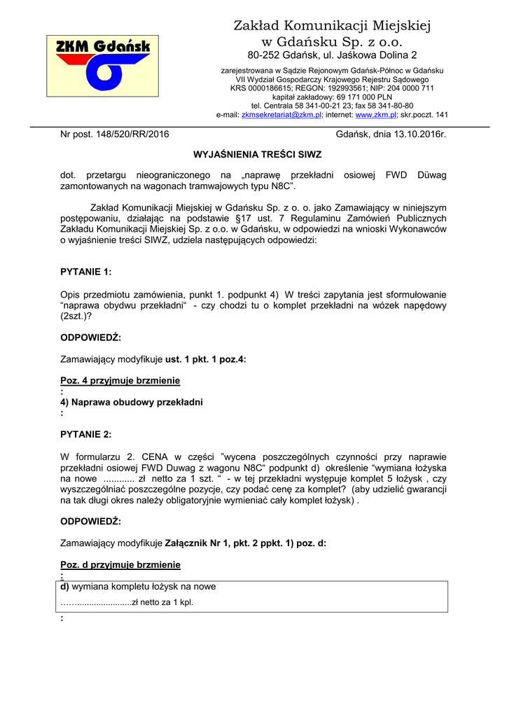 Zakład Komunikacji Miejskiej w Gdańsku Sp. z o.o. 80-252 Gdańsk, ul. Jaśkowa Dolina 2 zarejestrowana w Sądzie Rejonowym Gdańsk-Północ w Gdańsku VII Wydział Gospodarczy Krajowego Rejestru Sądowego KRS 0000186615; REGON: 192993561; NIP: 204 0000 711 kapitał zakładowy: 69 171 000 PLN tel. Centrala 58 341-00-21 23; fax 58 341-80-80 e-mail: [email protected]; internet: www.zkm.pl; skr.poczt. 141 Nr post. 148/520/RR/2016 Gdańsk, dnia 13.10.2016r. WYJAŚNIENIA TREŚCI SIWZ dot. przetargu nieograniczonego na „naprawę przekładni zamontowanych na wagonach tramwajowych typu N8C”. osiowej FWD Düwag Zakład Komunikacji Miejskiej w Gdańsku Sp. z o. o. jako Zamawiający w niniejszym postępowaniu, działając na podstawie §17 ust. 7 Regulaminu Zamówień Publicznych Zakładu Komunikacji Miejskiej Sp. z o.o. w Gdańsku, w odpowiedzi na wnioski Wykonawców o wyjaśnienie treści SIWZ, udziela następujących odpowiedzi: PYTANIE 1: Opis przedmiotu zamówienia, punkt 1. podpunkt 4) W treści zapytania jest sformułowanie “naprawa obydwu przekładni“ - czy chodzi tu o komplet przekładni na wózek napędowy (2szt.)? ODPOWIEDŹ: Zamawiający modyfikuje ust. 1 pkt. 1 poz.4: Poz. 4 przyjmuje brzmienie : 4) Naprawa obudowy przekładni : PYTANIE 2: W formularzu 2. CENA w części ”wycena poszczególnych czynności przy naprawie przekładni osiowej FWD Duwag z wagonu N8C“ podpunkt d) określenie “wymiana łożyska na nowe ............ zł netto za 1 szt. “ - w tej przekładni występuje komplet 5 łożysk , czy wyszczególniać poszczególne pozycje, czy podać cenę za komplet? (aby udzielić gwarancji na tak długi okres należy obligatoryjnie wymieniać cały komplet łożysk) . ODPOWIEDŹ: Zamawiający modyfikuje Załącznik Nr 1, pkt. 2 ppkt. 1) poz. d: Poz. d przyjmuje brzmienie : d) wymiana kompletu łożysk na nowe …….......................zł netto za 1 kpl. : PYTANIE 3: punkt 2) część dodatkowa podpunkty b) c) koło stożkowe stanowi integralna część walka atakującego , przez co podpunkty te powielają się w treści . Przy naprawie przekładni może wystąpić konieczność wymiany kola talerzowego, która nie została ujęta w specyfikacji. Czy nie przewidują Państwo wymiany kola talerzowego? ODPOWIEDŹ: Zamawiający modyfikuje Załącznik Nr 1, pkt. 2 ppkt. 2): Ppkt 2) przyjmuje brzmienie 2) Część dodatkowa a) likwidacja luzów …….......................zł netto za 1 szt. b) wymiana wałka atakującego wraz z kołem stozkowym …….......................zł netto za 1 szt. c) wymiana koła talerzowego …….......................zł netto za 1 szt. d) naprawa obudowy przekładni …….......................zł netto za 1 szt. Suma powyższych czynności (pozycja a+b+c+d) …….......................zł netto za 1 szt. PYTANIE 4: Warunki wykonania zamówienia punkt 2. podpunkt 4) czy przez 5 dniowy termin realizacji dostawy należy rozumieć 5 dniowy cykl na realizacje naprawy wraz z odbiorem i dostawą przekładni do ZKM Gdańsk ? ( Czy ZKM Gdańsk powierzy przekładnie do naprawy z wyprzedzeniem ze swojego magazynu i w ciągu rzeczonych 5 dni od zamówienia oczekiwać będzie na dostarczenie gotowej przekładni ?) ODPOWIEDŹ: Naprawa winna być wykonana w ciągu 5 dni roboczych od momentu odbioru przekładni do naprawy.
