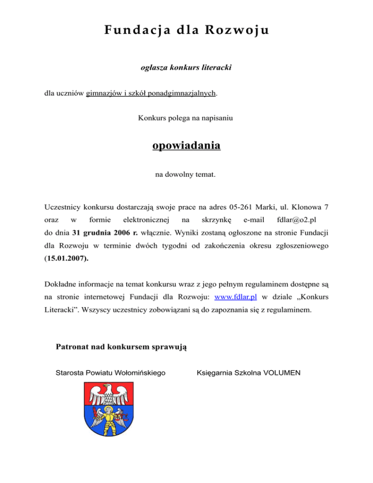 Fundacja dla Rozwoju ogłasza konkurs literacki dla uczniów gimnazjów i szkół ponadgimnazjalnych. Konkurs polega na napisaniu opowiadania na dowolny temat. Uczestnicy konkursu dostarczają swoje prace na adres 05-261 Marki, ul. Klonowa 7 oraz w formie elektronicznej na skrzynkę e-mail [email protected] do dnia 31 grudnia 2006 r. włącznie. Wyniki zostaną ogłoszone na stronie Fundacji dla Rozwoju w terminie dwóch tygodni od zakończenia okresu zgłoszeniowego (15.01.2007). Dokładne informacje na temat konkursu wraz z jego pełnym regulaminem dostępne są na stronie internetowej Fundacji dla Rozwoju: www.fdlar.pl w dziale „Konkurs Literacki”. Wszyscy uczestnicy zobowiązani są do zapoznania się z regulaminem. Patronat nad konkursem sprawują Starosta Powiatu Wołomińskiego Księgarnia Szkolna VOLUMEN Dodatkowe informacje Czy literatura naprawdę odchodzi do lamusa? Mamy nadzieję, że uczestnicy konkursu udowodnią, że nie. W czasach tak szybkiego rozwoju techniki jest też miejsce dla miłośników literatury, dla większych i mniejszych amatorów pióra. Pragnąc wyróżnić osoby, które uważają, że mają talent oraz zachęcić innych do starań, Fundacja dla Rozwoju zorganizowała konkurs dla uczniów gimnazjów i szkół ponadgimnazjalnych z wykluczeniem szkół wyższych, którym zadaniem jest napisanie opowiadania na dowolny temat, pozwalający uczestnikom zaprezentować swoje możliwości literackie i inwencję twórczą. Nadesłana praca powinna spełniać wymogi formalne opowiadania i ilościowo zawierać się w przedziale od 15000 do 20000 znaków. Aby nadać konkursowi smaku i dzięki rywalizacji podnieść poziom, przewidziane zostały nagrody. Nagradzane są trzy pierwsze miejsca. Dodatkową nagrodę będzie zamieszczenie prac laureatów na wyodrębnionej stronie Fundacji www.fdlar.pl. Prace konkursowe oceniane są przez trzyosobowe jury, które wyłoni laureatów w terminie czternastu dni od zakończenia napływania zgłoszeń. Aby opowiadanie mogło zostać ocenione, uczestnicy muszą je dostarczają swoje prace na adres 05-261 Marki, ul. Klonowa 7 oraz na skrzynkę e-mail [email protected]. Zapewniamy, że żadna praca nie będzie wykorzystana do celów niezwiązanych z konkursem bez zgody autora. Ocenie podlega w pierwszej kolejności poprawność formalna tekstu, poprawność językowa (styl, ortografia, składnia). Ważnym komponentem branym pod uwagę w ocenie opowiadania będzie jego temat. Liczymy tu szczególnie na pomysłowość uczestników konkursu. W dalszej części ocenie podlegać będzie strona estetyczna pracy, w szczególności jej przejrzystość. Konkurs ten – podobnie jak wszystkie inne – opatrzony jest regulaminem, który stanowi podstawę w kwestii zobowiązań uczestników i organizatorów konkursu. Czas trwania konkursu: od 06.11.2006 do 31.12.2006 Ogłoszenie wyników: 15.01.2007 REGULAMIN KONKURSU LITERACKIEGO 1. 2. 1. 2. 3. 4. 5. 1. 2. I. Postanowienia ogólne § 1. Dokument ten, zwany dalej "Regulaminem", określa zasady i warunki przystąpienia do konkursu literackiego. Określenia użyte w Regulaminie należy rozumieć następująco: a. Fundacja dla Rozwoju - Fundacja dla Rozwoju, KRS nr 0000250809, REGON 140440495, NIP 1132596220, adres korespondencyjny 05-261 Marki, ul. Klonowa 7, właściciel stron www.fdlar.pl, zwana dalej Fundacją lub Organizatorem, b. Uczestnik lub autor – osoba, która uczestniczy w konkursie, c. Praca konkursowa – strona internetowa stworzona i nadesłana przez uczestnika, d. Laureat konkursu – osoba, której praca konkursowa zajęła miejsca od 1. do 3. w konkursie, e. Jury – komisja w składzie trzyosobowym, oceniająca prace konkursowe, powołana przez Zarząd Fundacji. II. Praca konkursowa § 2. Konkurs przeznaczony jest dla uczniów gimnazjów i w szkół ponadgimnazjalnych. W konkursie nie mogą uczestniczyć studenci i absolwenci szkół. Przedmiotem konkursu jest opowiadanie napisane przez uczestnika na dowolny temat, w wyznaczonym terminie. Każdy z uczestników może nadesłać jedynie jedną pracę konkursową. Konkurs trwa w okresie wskazanym w ogłoszeniu konkursu. § 3. Autor składa oświadczenie, że: a. Wykonał pracę konkursową samodzielnie i we własnym zakresie, oraz że do wykonania pracy konkursowej nie wykorzystywał w sposób nieuprawniony praw autorskich osób trzecich, b. Posiada wyłączne prawa autorskie osobiste i majątkowe do całej pracy konkursowej, c. Żadna osoba trzecia nie posiada praw autorskich osobistych lub majątkowych do pracy konkursowej. Autor składa oświadczenie o wyrażeniu zgody na przetwarzanie danych osobowych do celów związanych z konkursem. § 4. Opowiadanie może składać się maksymalnie z 20000 znaków, ale nie mniej niż z 15000. § 5. Praca konkursowa nie może naruszać prawa, dóbr osobistych lub moralności publicznej albo skutkować takim naruszeniem. § 6. Teksty, które w swojej formie nie są opowiadaniami zostają automatycznie usunięte z konkursu i jury w żadnym wypadku nie będzie rozpatrywać możliwości ich udziału. § 7. 1. Praca konkursowa nie może być wykorzystana do celów niezwiązanych z konkursem, bez pisemnej zgody autora lub jego opiekuna prawnego. 2. Prawa autorskie do pracy konkursowej posiada tylko i wyłącznie jej autor. 1. 2. 3. 4. 1. 2. 1. 2. 1. 2. 3. 4. 1. 2. 1. 2. 3. 4. III. Wysyłanie prac § 8. Pracę konkursową należy dostarczyć w czasie trwania konkursu na adres i skrzynkę e-mail wskazane w ogłoszeniu konkursu. Praca powinna być wysyłana w załączniku jako pełen tekst opowiadania wraz z jego tytułem. Koperta i e-mail z pracą konkursową powinny być zatytułowane „Konkurs Literacki”. Na kopercie z pracą i w treści e-maila, uczestnik powinien wskazać: imię, nazwisko, wiek, szkołę i adres szkoły oraz złożyć oświadczenia, o których mowa w § 3. IV. Ocenianie § 10. Proces oceniania jest wewnętrzną dyskusją między członkami jury, mający na celu wyłonić