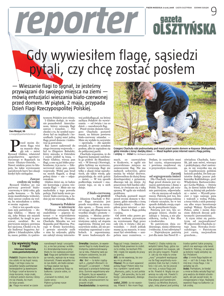 PIĄTEK-NIEDZIELA 2-4.05.2008 GAZETA OLSZTYŃSKA DZIENNIK ELBLĄSKI 9 Gdy wywiesiłem flagę, sąsiedzi pytali, czy chcę zostać posłem — Wieszanie flagi to sygnał, że jesteśmy przywiązani do swojego miejsca na ziemi — mówią entuzjaści wieszania biało-czerwonej przed domem. W piątek, 2 maja, przypada Dzień Flagi Rzeczypospolitej Polskiej. Ewa Mazgal, bb [email protected] P rzed moim domem flaga wisi na maszcie okrągły rok — mówi Ryszard Glabisz, właściciel gospodarstwa agroturystycznego w Rapatach na trasie Olsztyn-Ostróda. — Nawet miałem przez to kłopoty, bo takie wywieszanie narodowych barw bez okazji kiedyś było nielegalne. Zawsze czułem się wolny Ryszard Glabisz po raz pierwszy powiesił biało-czerwoną w 1989 roku, gdy padła komuna. — To była moja manifestacja wolności, choć zawsze czułem się wolny, bo mieszkałem u siebie, w swoim regionie. — Dziś w ten sposób wyrażam mój patriotyzm — dodaje Glabisz. — Marzy mi się, żeby Polacy nie musieli wyjeżdżać, by mogli tu pracować, zarabiać. Bo na pierwszym miejscu powinna być ojczyzna. Chodzi o to, by nie budować bogactwa Anglików i Irlandczyków, tylko tu, nasze, polskie. A z patrio- Czy wywiesisz flagę 2 maja? Internauci komentują www.gazetaolsztynska.pl Polak50: Dopiero dwa lata temu udało mi się kupić naszą flagę. I od tego czasu na wszystkie święta państwowe bezwzględnie ją wywieszam. Ta flaga i orzeł w koronie to moje korzenie, moje znaki, z których jestem dumny i którymi się chwalę, bo mam do tego prawo. Ja: Flaga ma wisieć w czasie tyzmem Polaków jest różnie. I Glabisz dodaje, że wcale nie pozazdrościł Amerykanom, którzy wieszają flagi zawsze i wszędzie. — Nie chodzi o to, by symbol narodowy był na majtkach i koszulkach. Lepiej mieć jedną flagę przed domem i traktować ją poważnie. Raz nawet zadzwonił do niego ówczesny wojewoda — był to Zbigniew Babalski, który mieszka w Ostródzie i często jeździł tą trasą. — Panie Glabisz, wiesza pan flagi, a one są już lekko przybrudzone. A ja na to: — Zdenerwował mnie pan, panie wojewodo. Widzi pan brud na moich flagach, a drogi pełnej dziur — nie — odparowałem. Glabisz dziwi się, że ludzie nie korzystają z prawa wieszania flagi: — Mnie nie raz nachodziła z tego powodu policja. Dziś każdy może powiesić biało-czerwoną, a ludzie jej nie wieszają. Szkoda. wej polskaflaga.pl, na której zachęca Polaków do wywieszania — od święta i na co dzień — narodowych flag. Przed swoim domem Grzegorz Chachuła postawił maszt, na którym powiewa biało-czerwony sztandar. — Mnie się wydało to oczywiste — opowiada. — Ale sąsiedzi uważali, że pewnie zostałem posłem, albo że zapisałem się do politycznej partii. Chachuła wspomina, że do flagowej kampanii natchnęła go podróż do Skandynawii. — W Szwecji i Norwegii, gdzie byliśmy na wycieczce, ludzie wywieszają flagi nie tylko z okazji świąt narodowych, ale także wtedy, gdy przyjeżdżają do nich goście — mówi. — W ten sposób podkreślają ważność i znaczenie tego, co się u nich dzieje. Grzegorz Chachuła robi podmurówkę pod maszt przed swoim domem w Kopance (Małopolska), gdzie mieszka z żoną i dwójką dzieci. — Maszt kupiłem przez internet razem z flagą polską i unijną — mówi For. Archiwum prywatne Dodam, że oczywiście musi być czysta, nieposzarpana i powinna znajdować się w przyzwoitym otoczeniu. Wielkiego entuzjastę flagi znaleźliśmy — poprzez internet — w województwie małopolskim. To Grzegorz Chachuła. Mieszka we wsi Kopanka pod Skawiną. Pracuje w firmie kurierskiej. I pewnie niewiele osób o nim by usłyszało, gdyby nie założył strony interneto- Zdaniem Chachuły w Polsce flaga uważana jest przede wszystkim za narzędzie oporu. — Proszę zwrócić uwagę, jak oflagowane są wszelkie strajki i protesty — wyjaśnia. — Można powiedzieć, że temperatura patriotyzmu zależy od stopnia zagrożenia. Dzisiaj jest ono oczywiście niskie, ale nie powinniśmy zapominać o symbolach. A zapominamy. W nowo budowanych do- mach, co zauważyłem w Krakowie, w ogóle nie przewidziano miejsca na umieszczenie flag. Nie ma żadnych uchwytów, gdzie można by włożyć drzewce. Zadzwoniłem do dużej firmy deweloperskiej z pytaniem, dlaczego tak się dzieje. Jej pracownicy byli bardzo zdziwieni, że zwracam się z taką sprawą. W ogóle nie widzieli problemu. Chachuła postawił maszt przed swoim domem w Kopance, gdzie mieszka z żoną i dwójką dzieci. — Maszt kupiłem przez internet — mówi. — Razem z flagą polską i unijną. Od 2004 roku prawo pozwala osobom prywatnym na wywieszanie flagi przez cały rok, w święta i dni powszednie. — Jeżeli jednak mamy ją na maszcie, w nocy musi być oświetlona — uzupełnia nasz rozmówca. — Dla Chachuły wywieszenie flagi przed domem jest wyrazem patriotyzmu i dumy z Polski. Na pytanie, jak rozumie patriotyzm, odpowiada: — On się zaczyna od małych rzeczy. Patriotą jest ten, kto troszczy się o własną rodzinę i własne szczęście, bo w ten sposób dokłada swoją cząstkę do pomyślności kraju. Patriotą jest ten, kto segreguje śmieci, chodzi na zakupy z lnianą, a nie plastikową, torbą i kto dba o środowisko. To patriotyzm dnia codziennego, mniej efektowny i widoczny. A ten odświętny? — Największym patriotą jest dla mnie Jan Paweł II — narodowych świąt i uroczystości, a nie bez przerwy i w kółko A z Amerykanów branie przykładu to nie najlepszy pomysł. Sed: Flaga jest symbolem naszego narodu, wpisuje się w naszą tożsamość. Prawie wszystko może nas dzielić, ale biało-czerwona flaga zawsze nas łączy. Maciek: Ja powieszę flagę na balkonie. I piszcie sobie, co chcecie. „Czerwień to miłość, biel czyste serce; Piękne są barwy nasze ojczyste” Emerytka: Uważam, że wywieszenie flagi to mały dowód patriotyzmu zademonstrowany raz w roku. Pokażmy swój patriotyz