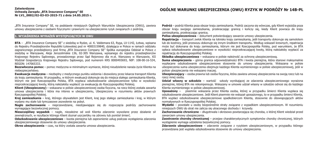 Zatwierdzone Uchwałą Zarządu „BTA Insurance Company” SE Nr LV1_0002/02-03-03-2015-71 z dnia 14.05.2015 r. „BTA Insurance Company” SE, na podstawie niniejszych Ogólnych Warunków Ubezpieczenia (OWU), zawiera umowy ubezpieczenia z osobami fizycznymi i prawnymi na ubezpieczenie ryzyk związanych z podróżą. 1. WYJAŚNIENIA WYRAŻEŃ WYSTĘPUJĄCYCH W OWU BTA – „BTA Insurance Company SE” z siedzibą w Rydze, ul. K. Valdemara 63, Ryga, LV-1142, Łotwa, wpisana do Rejestru Przedsiębiorstw Republiki Łotewskiej pod nr 40003159840, działająca w Polsce w ramach oddziału zagranicznego przedsiębiorcy pod firmą „BTA Insurance Company SE” Spółka europejska Oddział w Polsce z siedzibą w Warszawie, Aleje Jerozolimskie 136, 02-305 Warszawa, wpisanego do rejestru przedsiębiorców Krajowego Rejestru Sądowego, prowadzonego przez Sąd Rejonowy dla m.st. Warszawy w Warszawie, XII Wydział Gospodarczy Krajowego Rejestru Sądowego, pod numerem KRS 0000493693, NIP: 108-00-16-534, REGON: 147065333. Bezzwłoczna pomoc – pomoc medyczna w minimalnym wymiarze, której nieudzielenie naraża życie Klienta na niebezpieczeństwo. Ewakuacja medyczna – niezbędny z medycznego punktu widzenia i dozwolony przez lekarza transport Klienta do kraju zamieszkania. W przypadku, w którym ewakuacji dokonuje się do miejsca stałego zamieszkania Klienta, którym nie jest Rzeczpospolita Polska, BTA wypłaca odszkodowanie ubezpieczeniowe tylko w wysokości nieprzekraczającej kwoty, którą należałoby wypłacić za ewakuację do Rzeczypospolitej Polskiej. Klient (Ubezpieczony) – wskazana w polisie ubezpieczeniowej osoba fizyczna, na rzecz której została zawarta umowa ubezpieczenia i która ma interes w ubezpieczeniu, Ubezpieczony w rozumieniu aktów prawnych Rzeczypospolitej Polskiej. Kraj zamieszkania – kraj, którego obywatelem jest Klient, kraj jego stałego zamieszkania i kraj, w którym wydano mu stałe lub tymczasowe zezwolenie na pobyt. Nagłe zachorowanie – nieprzewidziane, nieobjawiające się do rozpoczęcia podróży zachorowanie wymagające bezzwłocznej pomocy. Nieszczęśliwy wypadek – nagłe, niezależne od woli Klienta zdarzenie wywołane przez działanie sił zewnętrznych, w rezultacie którego Klient doznał uszczerbku na zdrowiu lub poniósł śmierć. Odszkodowanie ubezpieczeniowe – kwota pieniężna lub zapewnienie usług podczas wystąpienia zdarzenia ubezpieczeniowego stosownie do umowy ubezpieczenia. Okres ubezpieczenia – czas, na który została zawarta umowa ubezpieczenia. OGÓLNE WARUNKI UBEZPIECZENIA (OWU) RYZYK W PODRÓŻY Nr 14B-PL Podróż – podróż Klienta poza obszar kraju zamieszkania. Podróż zaczyna się wówczas, gdy Klient wyjeżdża poza obszar kraju swojego zamieszkania, przekraczając granicę i kończy się, kiedy Klient powraca do kraju zamieszkania, przekraczając granicę. Polisa ubezpieczeniowa – dokument potwierdzający zawarcie umowy ubezpieczenia. Repatriacja – transport zwłok Klienta na lotnisko kraju zamieszkania, jeśli transportu dokonuje się samolotem lub do kostnicy, jeśli przewozu dokonuje się innym środkiem transportu. Według wskazań krewnych, repatriacja może być dokonana do kraju zamieszkania, którym nie jest Rzeczpospolita Polska, pod warunkiem, że BTA opłaca odszkodowanie ubezpieczeniowe w wysokości nieprzekraczającej kwoty, którą należałoby wypłacić za repatriację do Rzeczypospolitej Polskiej. Składka ubezpieczeniowa – wskazana w polisie należność za ochronę ubezpieczeniową. Suma ubezpieczenia – górna granica odpowiedzialności BTA i kwota pieniężna, która stanowi maksymalnie wypłacane odszkodowanie ubezpieczeniowe stosownie do umowy ubezpieczenia. Wskazana w polisie ubezpieczenia suma ubezpieczenia obejmuje każdego Klienta wymienionego w polisie ubezpieczeniowej, jeśli w polisie ubezpieczenia nie wskazano inaczej. Ubezpieczający – osoba prawna lub osoba fizyczna, która zawiera umowę ubezpieczenia na swoją rzecz lub na rzecz innej osoby. Udział własny w szkodzie – wartość szkody wynikającej ze zdarzenia ubezpieczeniowego wyrażona pieniężnie, której BTA nie rekompensuje. Wskazany w umowie udział własny w szkodzie odnosi się do każdego Klienta wymienionego w polisie ubezpieczeniowej. Uposażony – pisemnie wskazana przez Klienta osoba, której w przypadku śmierci Klienta wypłaca się odszkodowanie ubezpieczeniowe. Jeśli Klient pisemnie nie wskazał uposażonego, to w przypadku śmierci Klienta, BTA wypłaci odszkodowanie ubezpieczeniowe spadkobiercom Klienta, stosownie do obowiązujących aktów normatywnych w Rzeczypospolitej Polskiej. Wydatki – powstałe u osoby bezpośrednie straty związane z wypadkiem ubezpieczeniowym. W rozumieniu niniejszych OWU do strat nie zalicza się utraconego dochodu i krzywdy. Zachorowanie chroniczne – długotrwała i okresowo powtarzająca się choroba, o której Klient wiedział przed zawarciem umowy ubezpieczenia. Zaostrzenie choroby chronicznej – przejaw charakterystycznych symptomów choroby chronicznej, których wystąpienie wymaga udzielenia bezzwłocznej pomocy. Zdarzenie ubezpieczeniowe – zdarzenie związane z ryzykiem ubezpieczeniowym, w przypadku którego przewidziana jest wypłata odszkodowania stosownie do umowy ubezpieczenia. 2. ZAWARCIE UMOWY UBEZPIECZENIA, OCHRONA UBEZPIECZENIOWA I PRZEDTERMINOWE ROZWIĄZANIE UMOWY 2.1. Umowę ubezpieczenia zawiera się na podstawie ustnego wniosku Ubezpieczającego. Zawierając umowę ubezpieczenia, Ubezpieczający zobowiązany jest przedłożyć BTA całość informacji, o którą jest zapytany, niezbędnej do tego aby ocenić możliwość wystąpienia ryzyka objętego ubezpieczeniem. Ubezpieczający ponosi odpowiedzialność za wiarygodność i kompletność przedstawionej przez niego informacji. 2.2. Stosownie do niniejszych OWU umowę ubezpieczenia można zawrzeć: 2.2.1. zapewniając ochronę ubezpieczeniową na jedną podróż. W tym przypadku okres ochr