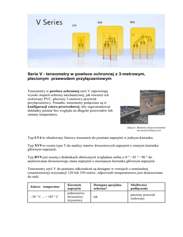 Seria V - tensometry w powłoce ochronnej z 3-metrowym, plecionym przewodem przyłączeniowym Tensometry w powłoce ochronnej serii V zapewniają wysoki stopień ochrony mechanicznej, jak również ich izolowany PVC, pleciony 3-metrowy przewód przyłączeniowy. Ponadto, tensometry połączone są w konfiguracji cztero przewodowej, aby zagwarantować dokładny pomiar bez względu na długość przewodów lub zmiany temperatury. Zdjęcie: Badania eksperymentalne na torach kolejowych Typ LV4 to obudowany liniowy tensometr do pomiaru naprężeń w jednym kierunku. Typ XV9 to rozeta typu T do analizy stanów dwuosiowych naprężeń o znanym kierunku głównym naprężeń. Typ RV9 jest rozetą o drabinkach obróconych względem siebie o 0 ° / 45 ° / 90 ° do analizowania dwuosiowego stanu naprężeń o nieznanym kierunku głównym naprężeń. Tensometry serii V do pomiaru odkształceń są dostępne w wersjach o nominalnej (znamionowej) rezystancji 120 lub 350 omów, odpowiedź temperaturowa jest dostosowana do stali. Zakres temperatur - 30 ° C ... + 105 ° C Kierunek naprężeń jednoosiowy dwuosiowy trzyosiowy Dostępna specjalna ochrona? Możliwości podłączenia tak pleciony przewód izolowany Wskazówki przy wyborze tensometrów Odpowiednia długość drabinki pomiarowej: długość drabinki pomiarowej zależy od celu pomiaru, ponieważ wynik pomiaru z tensometrów zostanie ustalony jako średnia z odkształceń na powierzchni pokrytej przez drabinkę. Ogólnie rzecz biorąc, długości siatki pomiarowej od 3 do 6 mm, stanowią dobre rozwiązanie. Długie drabinki pomiarowe zaleca się tam, gdzie materiał jest niejednorodny, np. taki jak beton lub drewno. Długi tensometr będzie niwelował niejednorodności próbki pomiarowej i jako wynik pomiaru zwróci odkształcenie pod spodem drabinki pomiarowej. Krótkie drabinki pomiarowe są odpowiednie do wykrywania lokalnego stanu naprężeń. Dlatego też są one odpowiednie do ustalenia gradientu naprężeń (łańcuchy tensometrów), maksymalnego punktu spiętrzenia naprężeń i podobnych. Odpowiednia rezystancja: dobór oporności zależy od ograniczeń zadania pomiarowego. Tensometry 120 omowe są stosunkowo niewrażliwe na zmiany oporności izolacji, wynikające na przykład ze względu na działanie wilgoci . Zaletą wyższej impedancji tensometrów jest to, że wytwarzają mniej ciepła właściwego ze względu na mniejszy prąd pomiaru. Ponadto, są one mniej wrażliwe na rezystancje w przewodach podłączonych do wzmacniacza pomiarowego. Wadą jest to, że tensometry o wysokiej impedancji mogą być bardziej wrażliwe na odbierane zakłócenia impulsowe. Tensometry specyfikowane dla klienta Czy masz specjalne wymagania, które nie są odpowiednio objęte przez tensometry z naszej standardowej oferty? Szukasz odpowiednika dla tensometru, którego aktualnie używasz? Zaprojektowałeś swój własny tensometr? Skontaktuj się z nami, a my będziemy produkować dostosowane do Twoich oczekiwań tensometry w zależności od potrzeb, w ilości 20 opakowań i więcej. Biuro Inżynierskie Maciej Zajączkowski, ul. Krauthofera 16, PL 60-203 Poznań Tel./Fax. +48 61 66 25 666, e-mail: [email protected], www: http://www.hbm.com.pl