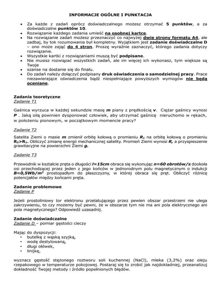 INFORMACJE OGÓLNE I PUNKTACJA Za każde z zadań oprócz doświadczalnego możesz otrzymać 5 punktów, a za doświadczalne punktów 10. Rozwiązanie każdego zadania umieść na osobnej kartce. Na rozwiązanie zadań możesz przeznaczyć co najwyżej dwie strony formatu A4, ale zadbaj, by tok rozumowania był kompletny. Wyjątkiem jest zadanie doświadczalne D – ono może zająć do 4 stron. Proszę wyraźnie zaznaczyć, którego zadania dotyczy rozwiązanie. Wszystkie kartki z rozwiązaniami muszą być podpisane. Nie musisz rozwiązać wszystkich zadań, ale im więcej ich wykonasz, tym większe są Twoje szanse na dostanie się do finału. Do zadań należy dołączyć podpisany druk oświadczenia o samodzielnej pracy. Prace niezawierające oświadczenia bądź niespełniające powyższych wymogów nie będą oceniane. Zadania teoretyczne Zadanie T1 Gaśnica wyrzuca w każdej sekundzie masę m piany z prędkością v. Ciężar gaśnicy wynosi P . Jaką siłą powinien dysponować człowiek, aby utrzymać gaśnicę nieruchomo w rękach, w położeniu pionowym, w początkowym momencie pracy? Zadanie T2 Satelita Ziemi o masie m zmienił orbitę kołową o promieniu R1 na orbitę kołową o promieniu R2>R1. Obliczyć zmianę energii mechanicznej satelity. Promień Ziemi wynosi R, a przyspieszenie grawitacyjne na powierzchni Ziemi g. Zadanie T3 Przewodnik w kształcie pręta o długości l=15cm obraca się wykonując n=60 obrotów/s dookoła osi przechodzącej przez jeden z jego końców w jednorodnym polu magnetycznym o indukcji B=0,5Wb/m2 prostopadłym do płaszczyzny, w której obraca się pręt. Obliczyć różnicę potencjałów między końcami pręta. Zadanie problemowe Zadanie P Jeżeli prostoliniowy tor elektronu przelatującego przez pewien obszar przestrzeni nie ulega zakrzywieniu, to czy możemy być pewni, że w obszarze tym nie ma ani pola elektrycznego ani pola magnetycznego? Odpowiedź uzasadnij. Zadanie doświadczalne Zadanie D – pomiar gęstości cieczy Mając • • • • do dyspozycji: butelkę z wąską szyjką, wodę destylowaną, długi ołówek, linijkę, wyznacz gęstość stężonego roztworu soli kuchennej (NaCl), mleka (3,2%) oraz oleju rzepakowego w temperaturze pokojowej. Postaraj się to zrobić jak najdokładniej, przeanalizuj dokładność Twojej metody i źródło popełnionych błędów.