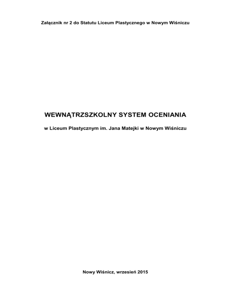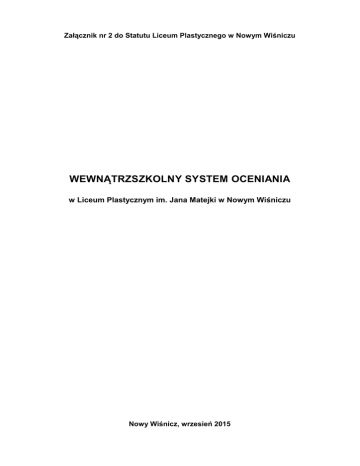 Załącznik nr 2 do Statutu Liceum Plastycznego w Nowym Wiśniczu WEWNĄTRZSZKOLNY SYSTEM OCENIANIA w Liceum Plastycznym im. Jana Matejki w Nowym Wiśniczu Nowy Wiśnicz, wrzesień 2015 Dokument sporządzono na podstawie ustawy z dnia 7 września 1991 r. o systemie oświaty (tekst jednolity Dz. U. 2004.256.2572 z późn. zm.) i rozporządzenia Ministra Kultury i Dziedzictwa Narodowego z dnia 24 sierpnia 2015 r. w sprawie szczegółowych warunków i sposobu oceniania, klasyfikowania i promowania uczniów w publicznych szkołach artystycznych (Dz. U. 2015.1258), zwanego dalej rozporządzeniem. Rozdział 1 Przepisy ogólne §1. 1. Ocenianiu podlegają: 1) osiągnięcia edukacyjne ucznia w zakresie zajęć edukacyjnych ogólnokształcących i artystycznych, 2) zachowanie ucznia. 2. Ocenianie osiągnięć edukacyjnych ucznia polega na rozpoznawaniu przez nauczycieli poziomu i postępów w opanowaniu przez ucznia wiadomości i umiejętności w stosunku do: 1) efektów kształcenia określonych w podstawie programowej kształcenia w zawodzie Plastyk oraz wymagań wynikających z realizowanych w szkole programów nauczania; 2) wymagań edukacyjnych określonych w podstawie programowej kształcenia ogólnego oraz wymagań edukacyjnych wynikających z realizowanych w szkole programów nauczania. 3. Ocenianie zachowania ucznia polega na rozpoznawaniu przez wychowawcę klasy, nauczycieli oraz uczniów danej klasy stopnia respektowania przez ucznia zasad współżycia społecznego i norm etycznych oraz obowiązków ucznia określonych w statucie szkoły. 4. Ocenianie wewnątrzszkolne ma na celu: 1) informowanie ucznia o poziomie jego osiągnięć edukacyjnych i jego zachowaniu oraz o postępach w tym zakresie, 2) udzielanie uczniowi pomocy w nauce poprzez przekazanie mu informacji o tym, co zrobił dobrze i jak powinien się dalej uczyć, 3) udzielanie wskazówek do samodzielnego planowania własnego rozwoju, 4) motywowanie ucznia do dalszych postępów w nauce i zachowaniu, 5) dostarczanie rodzicom (prawnym opiekunom) i nauczycielom informacji o postępach, trudnościach w nauce i zachowaniu ucznia oraz o szczególnych uzdolnieniach ucznia, 6) umożliwianie nauczycielom doskonalenia organizacji i metod pracy dydaktyczno-wychowawczej. 5. Ocenianie wewnątrzszkolne obejmuje: 1) formułowanie przez nauczycieli wymagań edukacyjnych niezbędnych do otrzymania przez ucznia poszczególnych śródrocznych i rocznych ocen klasyfikacyjnych z obowiązkowych i dodatkowych zajęć edukacyjnych, 2) ustalanie kryteriów oceniania zachowania, 3) ustalanie ocen bieżących i śródrocznych ocen klasyfikacyjnych z obowiązkowych i dodatkowych zajęć edukacyjnych oraz śródrocznej oceny klasyfikacyjnej zachowania, według skali i w formach określonych w §6, §7, §11 i §13, 4) przeprowadzanie egzaminów klasyfikacyjnych i poprawkowych, 5) ustalanie rocznych ocen klasyfikacyjnych z obowiązkowych i dodatkowych zajęć edukacyjnych oraz rocznej oceny klasyfikacyjnej zachowania, według skali, o której mowa w § 11 i 13, 2 6) ustalanie warunków i trybu uzyskania wyższych niż przewidywane rocznych ocen klasyfikacyjnych z zajęć edukacyjnych oraz rocznej oceny klasyfikacyjnej zachowania, 7) ustalanie warunków i sposobu przekazywania rodzicom (prawnym opiekunom) informacji o postępach i trudnościach w nauce i zachowaniu ucznia oraz o szczególnych uzdolnieniach ucznia. §2. Zadania i obowiązki nauczycieli w zakresie oceniania. 1. Do zadań i obowiązków nauczycieli w zakresie oceniania należy w szczególności: 1) na początku roku szkolnego informowanie uczniów oraz ich rodziców (prawnych opiekunów) o: a) wymaganiach edukacyjnych niezbędnych do uzyskania poszczególnych śródrocznych i rocznych ocen klasyfikacyjnych z zajęć edukacyjnych, wynikających z realizowanego przez siebie programu nauczania, b) sposobach sprawdzania osiągnięć edukacyjnych uczniów, c) warunkach i trybie otrzymania wyższej niż przewidywana rocznej oceny klasyfikacyjnej z zajęć edukacyjnych; 2) dostosowanie wymagań edukacyjnych do indywidualnych potrzeb rozwojowych i edukacyjnych oraz możliwości psychofizycznych ucznia: a) posiadającego orzeczenie kształcenia specjalnego, b) posiadającego orzeczenie o potrzebie indywidualnego nauczania, c) posiadającego opinię poradni psychologiczno-pedagogicznej o specyficznych trudnościach w uczeniu się, d) nie posiadającego orzeczenia lub opinii wymienionych w punktach a) - c), który jest objęty pomocą psychologiczno-pedagogiczną w szkole – na podstawie rozpoznania indywidualnych potrzeb rozwojowych i edukacyjnych oraz indywidualnych możliwości psychofizycznych ucznia, dokonanego przez nauczycieli i pedagoga szkolnego, e) posiadającego opinię lekarza o ograniczonych możliwościach wykonywania przez ucznia określonych ćwiczeń fizycznych na zajęciach wychowania fizycznego. 3) systematyczne i rytmiczne ocenianie uczniów; 4) stwarzanie uczniowi możliwości uzupełnienia braków; 5) na wniosek uczniów lub ich rodziców (prawnych opiekunów) uzasadnianie ustalonych ocen oraz udostępnianie do wglądu sprawdzonych i ocenionych prac kontrolnych; 6) informowanie uczniów i ich rodziców (prawnych opiekunów) o postępach, trudnościach w nauce oraz szczególnych uzdolnieniach ucznia; 7) informowanie uczniów, wychowawcy klasy oraz zainteresowanych rodziców (prawnych opiekunów) o przewidywanych ocenach klasyfikacyjnych na dwa tygodnie przed posiedzeniem klasyfikacyjnym rady pedagogicznej (wpis ołówkiem w dzienniku); 8) na dwa tygodnie przed posiedzeniem końcoworocznej rady klasyfikacyjnej nauczyciel pisemnie informuje rodziców (prawnych opiekunów) uczniów o grożących mu ocenach niedostatecznych z zajęć edukacyjnych oraz niedostatecznych i dopuszczających ze specjalności artystycznej oraz rysunku i malarstwa. Nauczyciel wypełnia druk pobrany w sekretariacie. Sekretarka wysyła pismo rodzicom na 2 tygodnie przed datą posiedzenia. 2. Do zadań wychowaw
