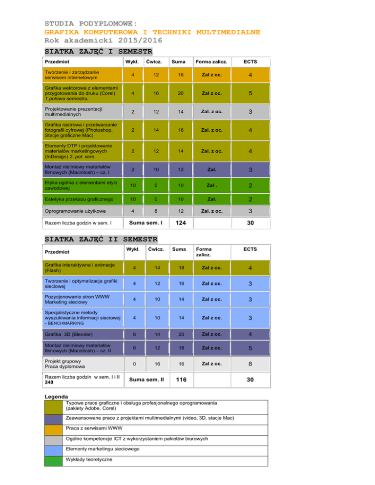 STUDIA PODYPLOMOWE: GRAFIKA KOMPUTEROWA I TECHNIKI MULTIMEDIALNE Rok akademicki 2015/2016 SIATKA ZAJĘĆ I SEMESTR Przedmiot Wykł. Ćwicz. Suma Forma zalicz. ECTS Tworzenie i zarządzanie serwisem internetowym 4 12 16 Zal z oc. 4 Grafika wektorowa z elementami przygotowania do druku (Corel) 1 połowa semestru. 4 16 20 Zal z oc. 5 Projektowanie prezentacji multimedialnych 2 12 14 Zal. z oc. 3 Grafika rastrowa i przetwarzanie fotografii cyfrowej (Photoshop, Stacje graficzne Mac) 2 14 16 Zal. z oc. 4 Elementy DTP i projektowanie materiałów marketingowych (InDesign) 2. poł. sem. 2 12 14 Zal. z oc. 4 Montaż nieliniowy materiałów filmowych (Macintosh) – cz. I 2 10 12 Zal. 3 Etyka ogólna z elementami etyki zawodowej 10 0 10 Zal . 2 Estetyka przekazu graficznego 10 0 10 Zal. 2 Oprogramowanie użytkowe 4 8 12 Zal. z oc. 3 Razem liczba godzin w sem. I Suma sem. I 124 30 SIATKA ZAJĘĆ II SEMESTR Wykł. Ćwicz. Grafika interaktywna i animacje (Flash) 4 14 18 Zal z oc. 4 Tworzenie i optymalizacja grafiki sieciowej 4 12 16 Zal z oc. 3 Pozycjonowanie stron WWW Marketing sieciowy 4 10 14 Zal z oc. 3 Specjalistyczne metody wyszukiwania informacji sieciowej - BENCHMARKING 4 10 14 Zal z oc. 3 Grafika 3D (Blender) 6 14 20 Zal z oc. 4 Montaż nieliniowy materiałów filmowych (Macintosh) – cz. II 6 12 18 Zal z oc. 5 Projekt grupowy Praca dyplomowa 0 16 16 Zal z oc. 8 Przedmiot Razem liczba godzin w sem. I i II 240 Suma sem. II Suma Forma zalicz. 116 Legenda Typowe prace graficzne i obsługa profesjonalnego oprogramowania (pakiety Adobe, Corel) Zaawansowane prace z projektami multimedialnymi (video, 3D, stacje Mac) Praca z serwisami WWW Ogólne kompetencje ICT z wykorzystaniem pakietów biurowych Elementy marketingu sieciowego Wykłady teoretyczne ECTS 30