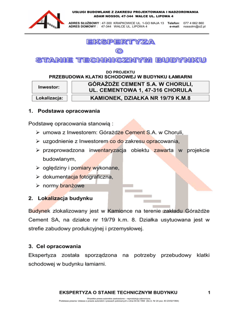 USŁUGI BUDOWLANE Z ZAKRESU PROJEKTOWANIA I NADZOROWANIA ADAM NOSSOL 47-344 WALCE UL. LIPOWA 4 ADRES SŁUŻBOWY : 47-300 KRAPKOWICE UL. 1-GO MAJA 13 ADRES DOMOWY : 47-344 WALCE UL. LIPOWA 4 Telefon: e-mail: 077 4 662 860 [email protected] DO PROJEKTU PRZEBUDOWA KLATKI SCHODOWEJ W BUDYNKU ŁAMIARNI Inwestor: GÓRAŻDŻE CEMENT S.A. W CHORULI, UL. CEMENTOWA 1, 47-316 CHORULA Lokalizacja: KAMIONEK, DZIAŁKA NR 19/79 K.M.8 1. Podstawa opracowania Podstawę opracowania stanowią : umowa z Inwestorem: Górażdże Cement S.A. w Choruli, uzgodnienie z Inwestorem co do zakresu opracowania, przeprowadzona inwentaryzacja obiektu zawarta w projekcie budowlanym, oględziny i pomiary wykonane, dokumentacja fotograficzna, normy branżowe 2. Lokalizacja budynku Budynek zlokalizowany jest w Kamionce na terenie zakładu Górażdże Cement SA, na działce nr 19/79 k.m. 8. Działka usytuowana jest w strefie zabudowy produkcyjnej i przemysłowej. 3. Cel opracowania Ekspertyza została sporządzona na potrzeby przebudowy klatki schodowej w budynku łamiarni. EKSPERTYZA O STANIE TECHNICZNYM BUDYNKU Wszelkie prawa autorskie zastrzeżone – reprodukcja zabroniona. Podstawa prawna: Ustawa o prawie autorskim i prawach pokrewnych z dnia 04.02.1994 (Dz.U. Nr 24 poz. 83 23/02/1994) 1 USŁUGI BUDOWLANE Z ZAKRESU PROJEKTOWANIA I NADZOROWANIA ADAM NOSSOL 47-344 WALCE UL. LIPOWA 4 ADRES SŁUŻBOWY : 47-300 KRAPKOWICE UL. 1-GO MAJA 13 ADRES DOMOWY : 47-344 WALCE UL. LIPOWA 4 Telefon: e-mail: 077 4 662 860 [email protected] 4. Dane ogólne Budynek – stan istniejący Lp. 1. 2. 3. 4. Dane ogólne Szerokość budynku Długość budynku Wysokość budynku Powierzchnia zabudowy Wielkość 25,00 47,00 16,90 1087,00 Jednostka m m m m2 Budynek łamiarni jest podpiwniczony, wykonany metodą tradycyjną z ścianami i słupami żelbetowymi. Na ścianach i słupach żelbetowych wsparta konstrukcja stalowa z dachem płaskim dwuspadowym o kącie nachylenia 15° i konstrukcji stalowej. Dach i pokrycie ścienne kryte blachą trapezową. ławy i stopy fundamentowe żelbetowe, ściany fundamentowe murowane z bloczków betonowych i gazobetonowych, słupy kratowe - pod suwnice słupy z profili walcowanych - konstrukcja budynku wiązary kratowe dachowe stalowe, okładzina ścienna i dachowa z blachy trapezowej ocynkowanej, ławy fundamentowe - żelbetowe słupy i podesty z profili walcowanych skręcane klatka schodowa o konstrukcji stalowej EKSPERTYZA O STANIE TECHNICZNYM BUDYNKU Wszelkie prawa autorskie zastrzeżone – reprodukcja zabroniona. Podstawa prawna: Ustawa o prawie autorskim i prawach pokrewnych z dnia 04.02.1994 (Dz.U. Nr 24 poz. 83 23/02/1994) 2 USŁUGI BUDOWLANE Z ZAKRESU PROJEKTOWANIA I NADZOROWANIA ADAM NOSSOL 47-344 WALCE UL. LIPOWA 4 ADRES SŁUŻBOWY : 47-300 KRAPKOWICE UL. 1-GO MAJA 13 ADRES DOMOWY : 47-344 WALCE UL. LIPOWA 4 Telefon: e-mail: 077 4 662 860 [email protected] 5. Ocena stanu technicznego elementów budowlanych 5.1. Ławy fundamentowe Ławy i stopy fundamentowe żelbetowe. Nie dokonano odkrywki fundamentów - obliczenia i dane techniczne uzyskane z dokumentacji technicznej. Stan techniczny dobry 5.2. Ściany zewnętrzne Ściany zewnętrzne z bloków żwirobetonowych i bloczków gazobetonowych o grubości 25 cm, na zaprawie cementowo- wapiennej. Ściany w części objętej opracowaniem (klatka schodowa) posiadają widoczne spękania powstałe w wyniku przeciążenia elementów budynku spowodowane drganiami w procesie technologicznym łamiarni. Stan techniczny niedostateczny 5.3. Słupy Słupy żelbetowe bez widocznych rys i spękań, brak ubytków w otulinie zbrojenia. Stan techniczny dobry 5.4. Rygle ścienne i płatwie dachowe Rygle ścienne z profili walcowanych mocowane do konstrukcji słupowych śrubami i spawami pachwinowymi. Płatwie dachowe z profili walcowanych mocowane do konstrukcji słupowych śrubami i spawami. Stan techniczny dobry EKSPERTYZA O STANIE TECHNICZNYM BUDYNKU Wszelkie prawa autorskie zastrzeżone – reprodukcja zabroniona. Podstawa prawna: Ustawa o prawie autorskim i prawach pokrewnych z dnia 04.02.1994 (Dz.U. Nr 24 poz. 83 23/02/1994) 3 USŁUGI BUDOWLANE Z ZAKRESU PROJEKTOWANIA I NADZOROWANIA ADAM NOSSOL 47-344 WALCE UL. LIPOWA 4 ADRES SŁUŻBOWY : 47-300 KRAPKOWICE UL. 1-GO MAJA 13 ADRES DOMOWY : 47-344 WALCE UL. LIPOWA 4 Telefon: e-mail: 077 4 662 860 [email protected] 5.5. Okładziny ścienne Okładziny ścienne z blachy trapezowej ocynkowanej. Stan techniczny dobry 5.6. Konstrukcja dachu i pokrycie dachowe Konstrukcja dachowa z wiązarów kratowych. Pokrycie dachowe z blachy trapezowej ocynkowanej. Stan techniczny dobry 5.7. Podłogi i posadzki Istniejące podłogi poziomu: +0.00 – posadzka betonowa -2.06 – blacha -2.96 – posadzka betonowa -4.06 – blacha Stan techniczny dobry 5.8. Izolacje pionowe i poziome Budynek nie posiada izolacji przeciwwilgociowych pionowych i poziomych. Brak 6. Wnioski i zalecenia Na podstawie przeprowadzonej ekspertyzy stwierdza się, co następuje: Należy wykonać zabezpieczenie wszystkich elementów nieocynkowanych antykorozyjne za pomocą powłok malarskich. Pierwsza warstwa farby powinna być nałożona na podłoże EKSPERTYZA O STANIE TECHNICZNYM BUDYNKU Wszelkie prawa autorskie zastrzeżone – reprodukcja zabroniona. Podstawa prawna: Ustawa o prawie autorskim i prawach pokrewnych z dnia 04.02.1994 (Dz.U. Nr 24 poz. 83 23/02/1994) 4 USŁUGI BUDOWLANE Z ZAKRESU PROJEKTOWANIA I NADZOROWANIA ADAM NOSSOL 47-344 WALCE UL. LIPOWA 4 ADRES SŁUŻBOWY : 47-300 KRAPKOWICE UL. 1-GO MAJA 13 ADRES DOMOWY : 47-344 WALCE UL. LIPOWA 4 Telefon: e-mail: 077 4 662 860 [email protected] oczyszczone, (istniejące elementy konstrukcji stalowej przed malowaniem należy oczyścić poprzez piaskowanie) do co najmniej II stopnia czystości wg PN-70/H-97050. Elementy konstrukcji budynku za wyjątkiem ścian stanowiących wypełnienie konstrukcji żelbetowej (klatka schodowa) są w dobrym stanie technicznym i nie wymagają wzmocnień Elementy ścian stanowiących w