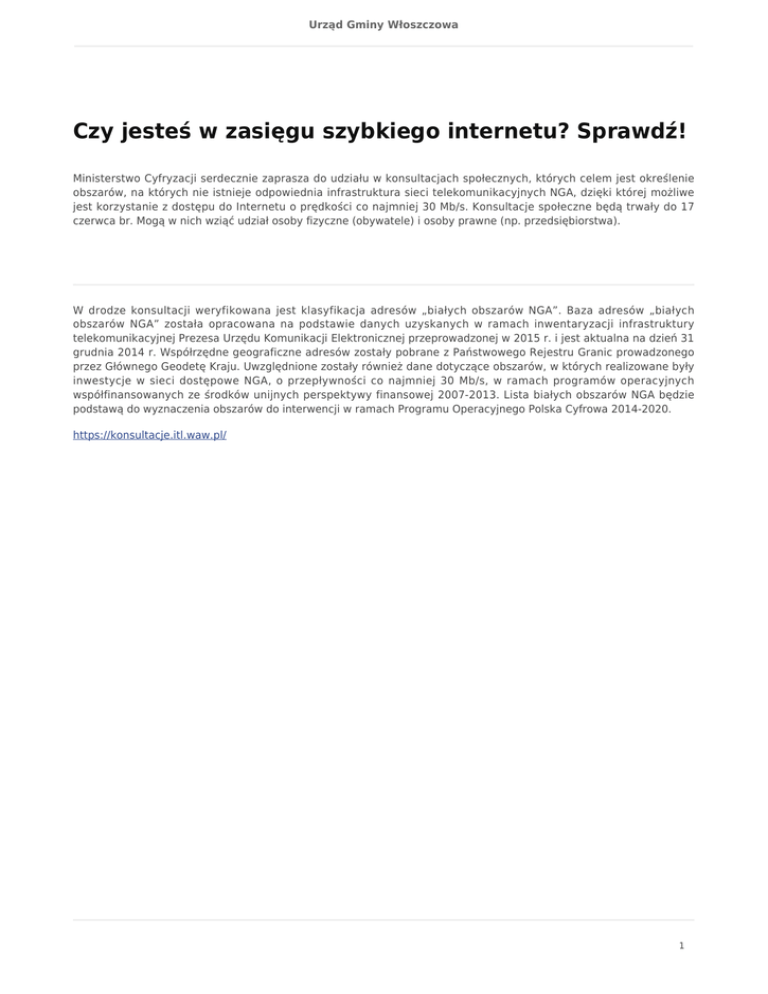 Urząd Gminy Włoszczowa Czy jesteś w zasięgu szybkiego internetu? Sprawdź! Ministerstwo Cyfryzacji serdecznie zaprasza do udziału w konsultacjach społecznych, których celem jest określenie obszarów, na których nie istnieje odpowiednia infrastruktura sieci telekomunikacyjnych NGA, dzięki której możliwe jest korzystanie z dostępu do Internetu o prędkości co najmniej 30 Mb/s. Konsultacje społeczne będą trwały do 17 czerwca br. Mogą w nich wziąć udział osoby fizyczne (obywatele) i osoby prawne (np. przedsiębiorstwa). W drodze konsultacji weryfikowana jest klasyfikacja adresów „białych obszarów NGA”. Baza adresów „białych obszarów NGA” została opracowana na podstawie danych uzyskanych w ramach inwentaryzacji infrastruktury telekomunikacyjnej Prezesa Urzędu Komunikacji Elektronicznej przeprowadzonej w 2015 r. i jest aktualna na dzień 31 grudnia 2014 r. Współrzędne geograficzne adresów zostały pobrane z Państwowego Rejestru Granic prowadzonego przez Głównego Geodetę Kraju. Uwzględnione zostały również dane dotyczące obszarów, w których realizowane były inwestycje w sieci dostępowe NGA, o przepływności co najmniej 30 Mb/s, w ramach programów operacyjnych współfinansowanych ze środków unijnych perspektywy finansowej 2007-2013. Lista białych obszarów NGA będzie podstawą do wyznaczenia obszarów do interwencji w ramach Programu Operacyjnego Polska Cyfrowa 2014-2020. https://konsultacje.itl.waw.pl/ 1