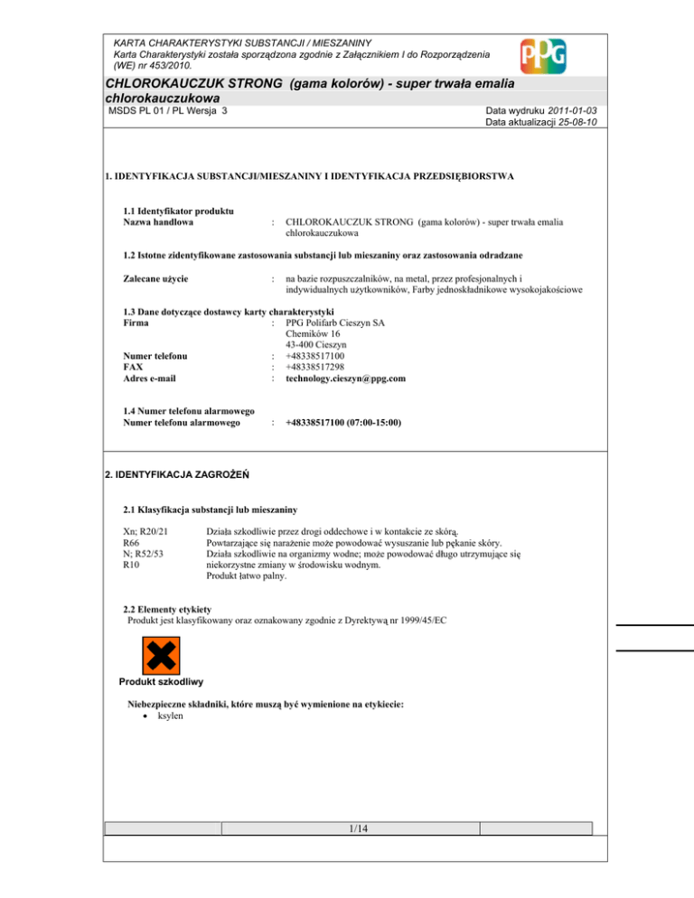 KARTA CHARAKTERYSTYKI SUBSTANCJI / MIESZANINY Karta Charakterystyki zosta a sporz dzona zgodnie z Za cznikiem I do Rozporz dzenia (WE) nr 453/2010. CHLOROKAUCZUK STRONG (gama kolorów) - super trwa a emalia chlorokauczukowa MSDS PL 01 / PL Wersja 3 Data wydruku 2011-01-03 Data aktualizacji 25-08-10 1. IDENTYFIKACJA SUBSTANCJI/MIESZANINY I IDENTYFIKACJA PRZEDSI BIORSTWA 1.1 Identyfikator produktu Nazwa handlowa : CHLOROKAUCZUK STRONG (gama kolorów) - super trwa a emalia chlorokauczukowa 1.2 Istotne zidentyfikowane zastosowania substancji lub mieszaniny oraz zastosowania odradzane : Zalecane u ycie na bazie rozpuszczalników, na metal, przez profesjonalnych i indywidualnych u ytkowników, Farby jednosk adnikowe wysokojako ciowe 1.3 Dane dotycz ce dostawcy karty charakterystyki : PPG Polifarb Cieszyn SA Firma Chemików 16 43-400 Cieszyn : +48338517100 Numer telefonu : +48338517298 FAX : [email protected] Adres e-mail 1.4 Numer telefonu alarmowego Numer telefonu alarmowego : +48338517100 (07:00-15:00) 2. IDENTYFIKACJA ZAGRO E 2.1 Klasyfikacja substancji lub mieszaniny Xn; R20/21 R66 N; R52/53 R10 Dzia a szkodliwie przez drogi oddechowe i w kontakcie ze skór . Powtarzaj ce si nara enie mo e powodowa wysuszanie lub p kanie skóry. Dzia a szkodliwie na organizmy wodne; mo e powodowa d ugo utrzymuj ce si niekorzystne zmiany w rodowisku wodnym. Produkt atwo palny. 2.2 Elementy etykiety Produkt jest klasyfikowany oraz oznakowany zgodnie z Dyrektyw nr 1999/45/EC Produkt szkodliwy Niebezpieczne sk adniki, które musz by wymienione na etykiecie: ksylen 1/14 KARTA CHARAKTERYSTYKI SUBSTANCJI / MIESZANINY Karta Charakterystyki zosta a sporz dzona zgodnie z Za cznikiem I do Rozporz dzenia (WE) nr 453/2010. CHLOROKAUCZUK STRONG (gama kolorów) - super trwa a emalia chlorokauczukowa MSDS PL 01 / PL Wersja 3 Zwrot okre laj cy rodzaj zagro enia (zwrot R) Data wydruku 2011-01-03 Data aktualizacji 25-08-10 : R10 R20/21 Produkt atwo palny. Dzia a szkodliwie przez drogi oddechowe i w kontakcie ze skór . Dzia a szkodliwie na organizmy wodne; mo e powodowa d ugo utrzymuj ce si niekorzystne zmiany w rodowisku wodnym. Powtarzaj ce si nara enie mo e powodowa wysuszanie lub p kanie skóry. R52/53 R66 : Zwroty bezpiecznego post powania - S S2 S29 S36/37 Chroni przed dzie mi. Nie wprowadza do kanalizacji. Nosi odpowiedni odzie ochronn i odpowiednie r kawice ochronne. W razie po kni cia niezw ocznie zasi gnij porady lekarza - poka opakowanie lub etykiet . Stosowa wy cznie w dobrze wentylowanych pomieszczeniach. S46 S51 : Zwrot(y) P Zawiera: : cobalt bis(2-ethylhexanoate) Mo e powodowa wyst pienie reakcji alergicznej. 2.3 Inne zagro enia Brak dost pnej informacji. 3. SK AD I INFORMACJA O SK ADNIKACH 3.2 Mieszaniny Sk adniki Nr EC Nr CAS etylobenzen 202-849-4 100-41-4 ksylen 215-535-7 1330-20-7 cykloheksanon 203-631-1 izobutanol octan 2-metoksy-1metyloetylu octan butylu Uwaga DSD Klasyfikacja F; R11 Xn; R20 CLP Klasyfikacja St enie Flam. Liq.2; H225 4; H332 >=2.50 - <10.00% R10 Xn; R20/21 Xi; R38 Flam. Liq.3; H226 4; H332 4; H312 Skin Irrit.2; H315 >=12.50 - <20.00% 108-94-1 R10 Xn; R20 Flam. Liq.3; H226 4; H332 >=1.00 - <2.50% 201-148-0 78-83-1 R10 Xi; R37/38, R41 R67 Flam. Liq.3; H226 STOT SE3; H335 Skin Irrit.2; H315 Eye Dam.1; H318 STOT SE3; H336 >=1.00 - <2.50% 203-603-9 108-65-6 R10 Flam. Liq.3; H226 >=1.00 - <2.50% 204-658-1 123-86-4 R10 R66 R67 Flam. Liq.3; H226 STOT SE3; H336 >=2.50 - <10.00% Nota C 2/14 KARTA CHARAKTERYSTYKI SUBSTANCJI / MIESZANINY Karta Charakterystyki zosta a sporz dzona zgodnie z Za cznikiem I do Rozporz dzenia (WE) nr 453/2010. CHLOROKAUCZUK STRONG (gama kolorów) - super trwa a emalia chlorokauczukowa MSDS PL 01 / PL Wersja 3 Benzyna ci ka hydroodsiarczona (ropa naftowa); Niskowrz ca frakcja naftowa obrabiana wodorem cobalt bis(2ethylhexanoate) Data wydruku 2011-01-03 Data aktualizacji 25-08-10 265-185-4 64742-82-1 Nota H, R10 Nota P N; R51/53 Xn; R65 R66, R67 >=15.00 - <20.00% 205-250-6 136-52-7 >=0.10 - <1.00% Xi; R38 R43 Xn; R22 N; R51/53 * Lista Kandydacka Substancji o Du ym Znaczeniu dla Autoryzacji Producent wyrobu deklaruje, e dla zwrotów R niewymienionych w punkcie 3 ca kowita zawarto substancji nie przekracza warto ci granicznych.Wed ug deklaracji producentów surowców ca kowita zawarto benzenu < 0,1%. Klasyfikacja z uwzgl dnieniem NOTY H i NOTY P. Je eli pojawia si wiele substancji o jednakowych identyfikatorach, to jednak ró ni si one w asno ciami niebezpiecze stwa np. punkt zap onu. 4. PIERWSZA POMOC 4.1 Opis rodków pierwszej pomocy : Porady ogólne Kontakt z oczami : Kontakt przez skór : Wdychanie : Po kni cie : Oparzenia : W przypadku utrzymuj cych si objawów lub jakichkolwiek w tpliwo ci zasi gn porady medycznej. Nigdy nie podawa niczego doustnie osobie nieprzytomnej. Przep ukiwa otwarte oczy obficie czyst , wie wod przynajmniej przez 10 minut. Usun szk a kontaktowe. Zasi gn porady medycznej. Natychmiast zdj ska one ubranie. Przemy skór wod z myd em. NIE STOSOWA rozpuszczalników lub rozcie czalników. Wynie na wie e powietrze. Zapewni poszkodowanemu ciep o i spokój. W przypadku nieregularnego lub zatrzymanego oddechu zastosowa sztuczne oddychanie. Osobie nieprzytomnej zapewni pozycj bezpieczn - "boczn ustalon " i zasi gn porady medycznej. W razie przypadkowego po kni cia niezw ocznie zapewni opiek medyczn . Pozostawi w spokoju. NIE prowokowa wymiotów. W przypadku gdy zabrudzenia na ubraniu zapal si , sp uka du ilo ci wody. ci gn / usun lu n odzie . Nie usuwa odzie y, która jest stopiona ze skór .Uzyska pomoc lekarsk . 4.2 Najwa niejsze ostre i opó nione objawy oraz skutki nara enia W przypadku awarii lub je eli le si poczujesz, niezw ocznie zasi gnij porady lekarza - je eli to mo liwe, poka etykiet Przedstawi lekarzowi do czon Kart Charakterystyki produktu. 4.3 Wskazanie natychmiastowej opieki lekarskiej i potrzebnego specjalnego traktowania Nieprzytomnej osobie nigdy nie podawa nic doustnie. Leczy objawowo 3/14 KARTA CHARAKTERYSTYKI SUBSTANCJI / MIESZANINY Kar
