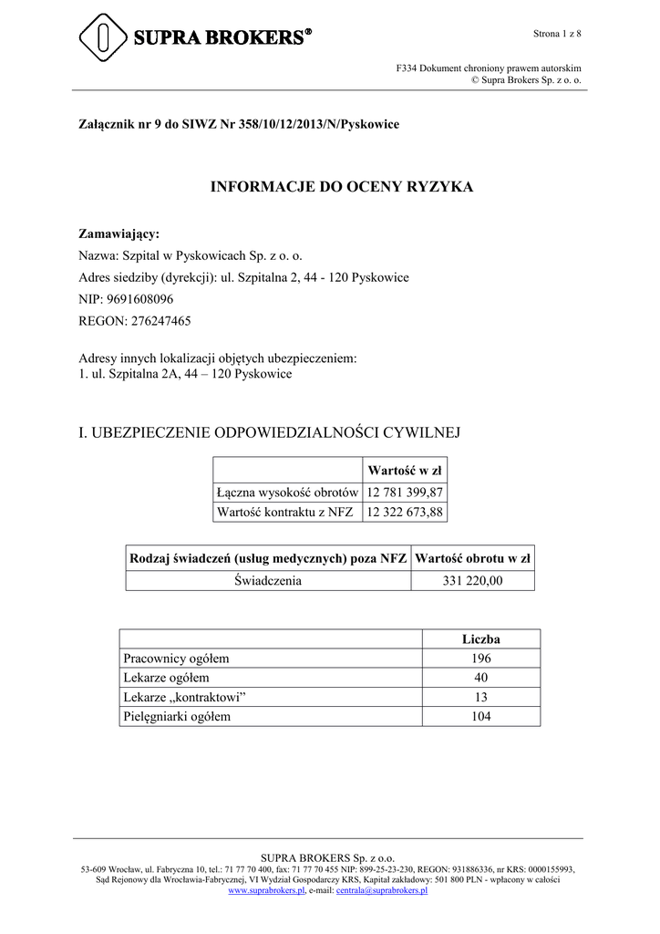 Strona 1 z 8 F334 Dokument chroniony prawem autorskim © Supra Brokers Sp. z o. o. Załącznik nr 9 do SIWZ Nr 358/10/12/2013/N/Pyskowice INFORMACJE DO OCENY RYZYKA Zamawiający: Nazwa: Szpital w Pyskowicach Sp. z o. o. Adres siedziby (dyrekcji): ul. Szpitalna 2, 44 - 120 Pyskowice NIP: 9691608096 REGON: 276247465 Adresy innych lokalizacji objętych ubezpieczeniem: 1. ul. Szpitalna 2A, 44 – 120 Pyskowice I. UBEZPIECZENIE ODPOWIEDZIALNOŚCI CYWILNEJ Wartość w zł Łączna wysokość obrotów 12 781 399,87 Wartość kontraktu z NFZ 12 322 673,88 Rodzaj świadczeń (usług medycznych) poza NFZ Wartość obrotu w zł Świadczenia 331 220,00 Liczba 196 40 13 104 Pracownicy ogółem Lekarze ogółem Lekarze „kontraktowi” Pielęgniarki ogółem SUPRA BROKERS Sp. z o.o. 53-609 Wrocław, ul. Fabryczna 10, tel.: 71 77 70 400, fax: 71 77 70 455 NIP: 899-25-23-230, REGON: 931886336, nr KRS: 0000155993, Sąd Rejonowy dla Wrocławia-Fabrycznej, VI Wydział Gospodarczy KRS, Kapitał zakładowy: 501 800 PLN - wpłacony w całości www.suprabrokers.pl, e-mail: [email protected] Strona 2 z 8 F334 Dokument chroniony prawem autorskim © Supra Brokers Sp. z o. o. Oddział Chorób Wewnętrznych Ginekologiczno-Położniczy Noworodków Chirurgii Ogólnej Anestezjologii z Traktem operacyjnym Liczba lekarzy kontraktowych 6 10 8 7 6 Liczba łóżek 52 30 12 40 - Sposób organizacji opieki lekarskiej podczas dyżurów: dyżury pełnią lekarze kontraktowi. OCENA RYZYKA ZAKAŻEŃ SZPITALNYCH 1 2 3 4 5 6 7 8 9 10 W podmiocie leczniczym działa Zespół d/s. Zakażeń Szpitalnych W podmiocie leczniczym rejestrowane są zakażenia szpitalne wszystkie wybiórczo Liczba stwierdzanych rocznie zakażeń szpitalnych krwiopochodnych (wzw B, wzw C, hiv) gronkowca innych Podmiot leczniczy zgłasza do Sanepid zakażenia szpitalne/choroby zakaźne wszystkie krwiopochodne Podmiot leczniczy posiada centralną sterylizatornię W podmiocie leczniczym używane są sterylizatory narzędzi na suche, gorące powietrze Prowadzona jest wewnętrzna kontrola procesów sterylizacji Testy używane do kontroli procesów sterylizacji i pracy sterylizatorów: wskaźniki fizyczne wydruk komputerowy testy Bowie-Dicka testy paskowe testy zintegrowane testy biologiczne Używane są puszki Schimmelbuscha jako opakowania do sterylizacji Inne opakowania używane do sterylizacji puszki kontenerowe TAK x x 0 0 9 x x x x x x SUPRA BROKERS Sp. z o.o. 53-609 Wrocław, ul. Fabryczna 10, tel.: 71 77 70 400, fax: 71 77 70 455 NIP: 899-25-23-230, REGON: 931886336, nr KRS: 0000155993, Sąd Rejonowy dla Wrocławia-Fabrycznej, VI Wydział Gospodarczy KRS, Kapitał zakładowy: 501 800 PLN - wpłacony w całości www.suprabrokers.pl, e-mail: [email protected] Strona 3 z 8 F334 Dokument chroniony prawem autorskim © Supra Brokers Sp. z o. o. rękawy papierowo – foliowe inne 11 12 13 14 Do mycia rąk używane jest mydło w: dozownikach kostkach Do dezynfekcji rąk używany jest środek dezynfekcyjny w dozownikach Cały personel poddawany jest szkoleniom z zakresu zapobiegania infekcjom szkolenie tylko przy przyjęciu do pracy systematycznie W podmiocie leczniczym opracowane są następujące procedury postępowania mycia i dezynfekcji rąk w czasie pobierania krwi 15 16 17 18 x przy wykonywaniu iniekcji podczas dezynfekcji podczas sterylizacji ze sprzętem endoskopowym z zużytym sprzętem jednorazowym ze skażonym mat. biologicznym Przestrzeganie procedur jest systematycznie kontrolowane Możliwa jest izolacja pacjentów chorych zakaźnie Podmiot leczniczy posiada myjnię do endoskopów półautomatyczną automatyczną sterylizator Cały personel narażony na zakażenie wzw jest zaszczepiony przeciwko żółtaczce typu B (na podstawie dokumentacji w Zakł. Leczniczym) x x x x x x x x x x x x x x x Zakres świadczonych usług medycznych Lecznictwo zamknięte Apteka szpitalna Zakres świadczonych usług pozamedycznych Wynajem pomieszczeń SUPRA BROKERS Sp. z o.o. 53-609 Wrocław, ul. Fabryczna 10, tel.: 71 77 70 400, fax: 71 77 70 455 NIP: 899-25-23-230, REGON: 931886336, nr KRS: 0000155993, Sąd Rejonowy dla Wrocławia-Fabrycznej, VI Wydział Gospodarczy KRS, Kapitał zakładowy: 501 800 PLN - wpłacony w całości www.suprabrokers.pl, e-mail: [email protected] Strona 4 z 8 F334 Dokument chroniony prawem autorskim © Supra Brokers Sp. z o. o. Podmiot leczniczy : przygotowuje w aptece szpitalnej leki robione posiada laboratorium diagnostyczne prowadzi działalność w zakresie doskonalenia zawodowego kadr lekarskich, pielęgniarskich itp. II. UBEZPIECZENIA MIENIA ZASTOSOWANE ZABEZPIECZENIA PRZECIWPOŻAROWE TAK gaśnice x hydranty wewnętrzne x hydranty zewnętrzne x NIE stałe urządzenia gaśnicze – urządzenia tryskaczowe x stałe urządzenia gaśnicze – gazowe x stałe urządzenia gaśnicze – pianowe lub proszkowe x urządzenia sygnalizujące powstanie pożaru x stały dozór x OCENA BUDYNKÓW I BUDOWLI TAK Budynki stoją w zabudowie zwartej x Budynki stoją na posesji ogrodzonej x Posesja jest oświetlona x NIE Konstrukcja budynków: materiały palne x materiały niepalne x materiały mieszane Budynki są wykonane z płyt warstwowych z palnym wypełnieniem np. styropianem lub pianką poliuretanową. Ściany działowe wykonane są z: X dach x materiałów palnych x materiałów palnych zabezpieczonych ognioodpornie x materiałów niepalnych x Wystrój wnętrz budynków wykonany jest z materiałów: SUPRA BROKERS Sp. z o.o. 53-609 Wrocław, ul. Fabryczna 10, tel.: 71 77 70 400, fax: 71 77 70 455 NIP: 899-25-23-230, REGON: 931886336, nr KRS: 0000155993, Sąd Rejonowy dla Wrocławia-Fabrycznej, VI Wydział Gospodarczy KRS, Kapitał zakładowy: 501 800 PLN - wpłacony w całości www.suprabrokers.pl, e-mail: [email protected] Strona 5 z 8 F334 Dokument chroniony prawem autorskim © Supra Brokers Sp. z o. o. materiałów palnych x materiałów palnych zabezpieczonych ognioodpornie x materiałów niepalnych x Ogniomury x Obiekty posiadają wymaganą i spra